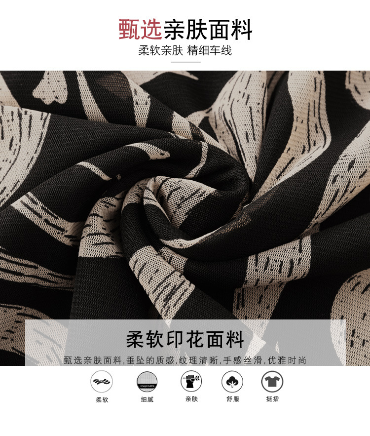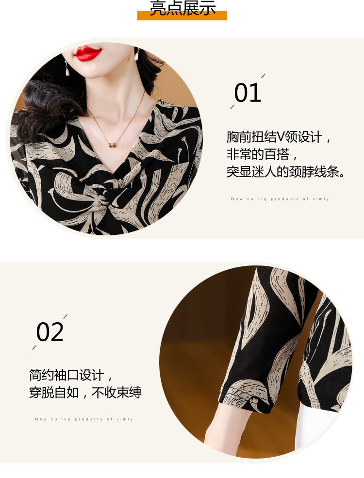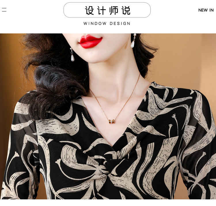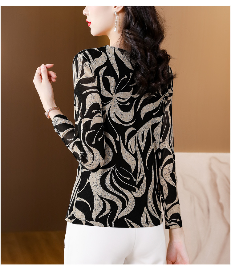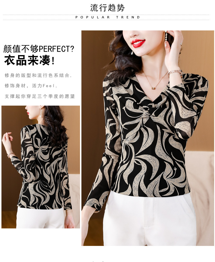 2023秋季新款时尚V领印花高弹网纱长袖洋气遮肚子上衣气质小衫女YH852032