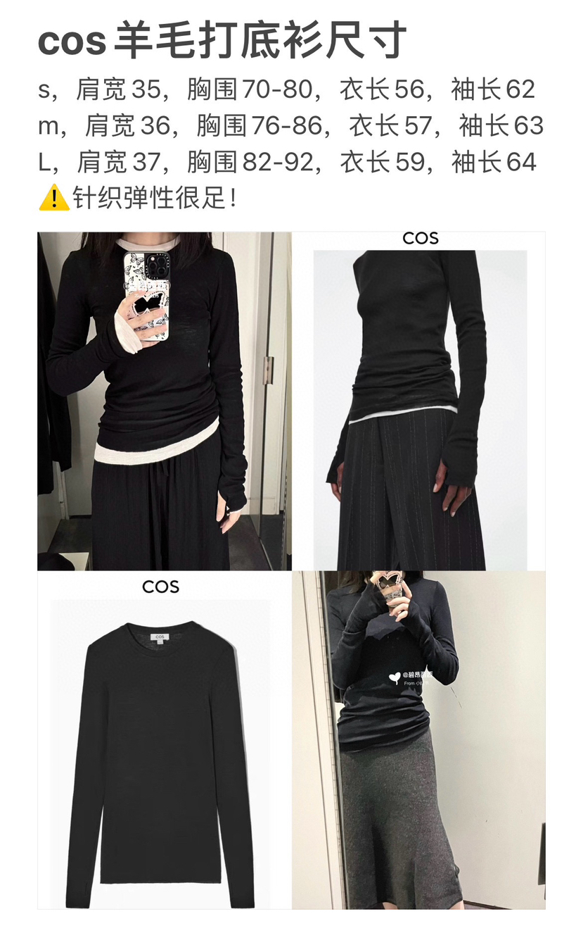 全网畅销1000+,cos经典爆款打底衫,还是超细支的羊毛材质,柔顺细腻的跟精梳羊绒体感似的,实穿春秋冬三季,略略透都是优点,不过份的露更显瘦洋气~