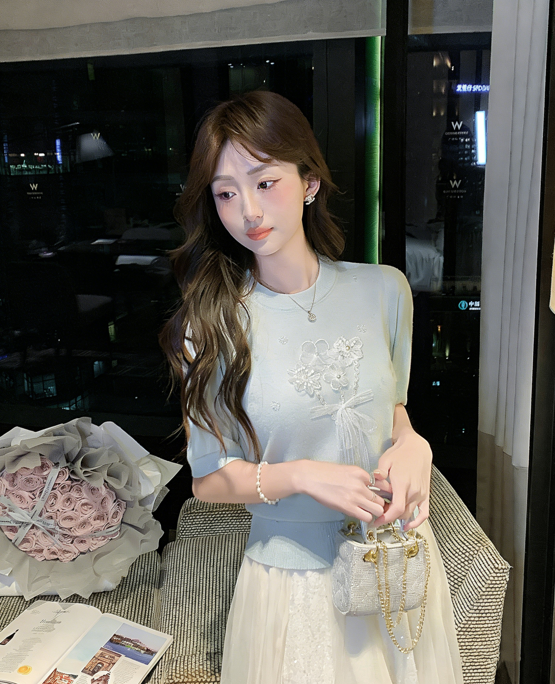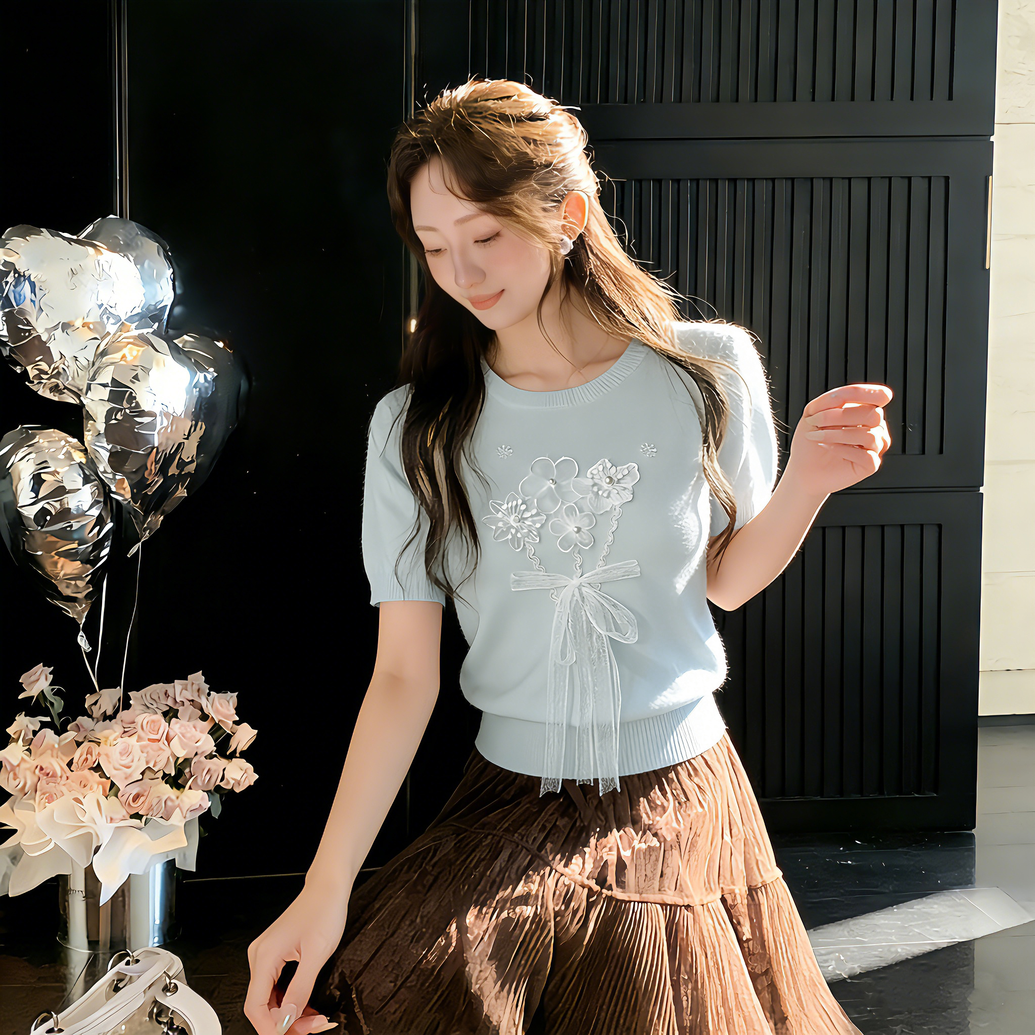 张心子【午后花园】方领显瘦立体花郁金花抽绳针织衫上衣 U2603039