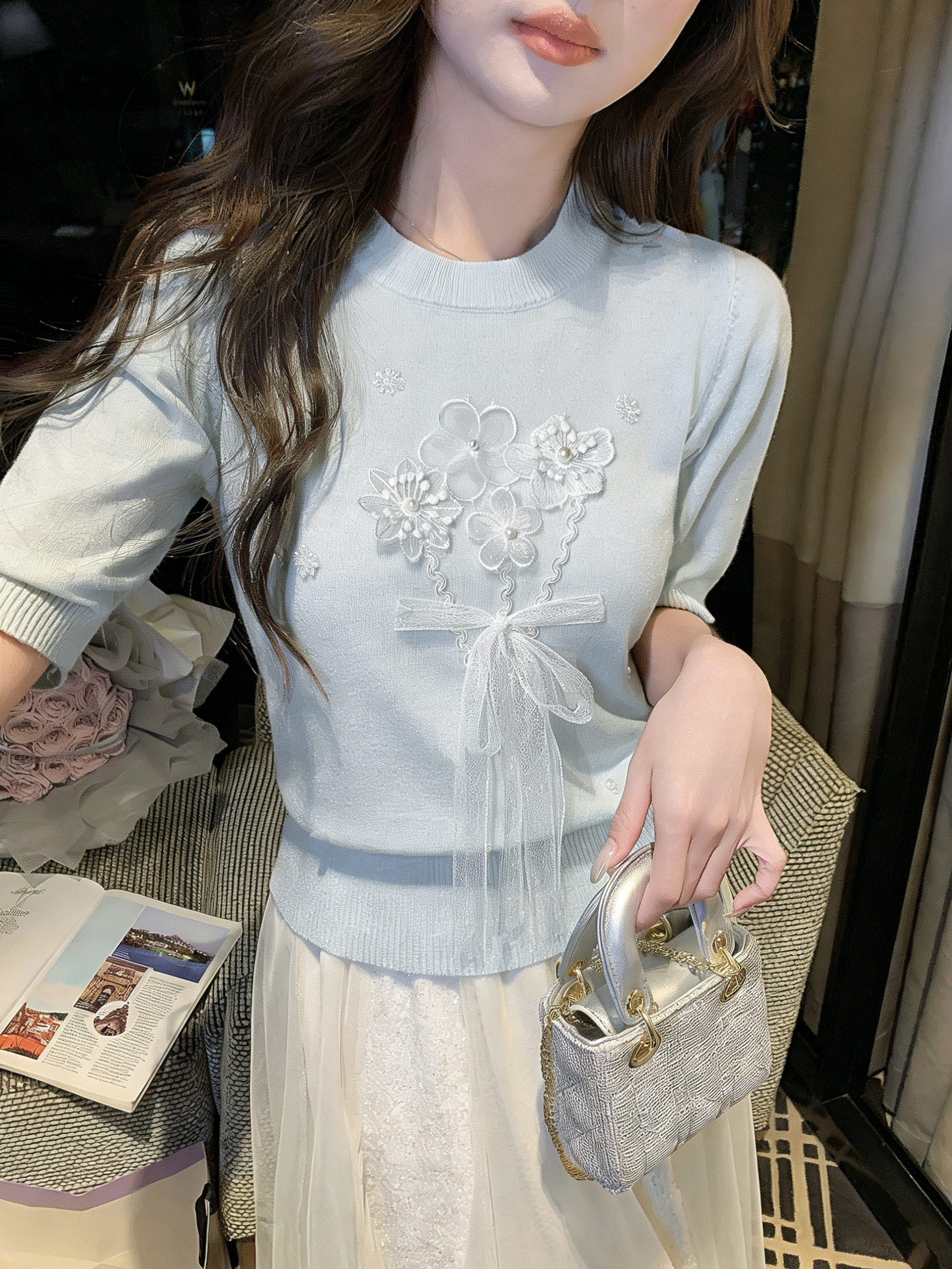 张心子【花与爱丽丝】圆领立体花蕾丝减龄软糯针织衫上衣 U2603041
