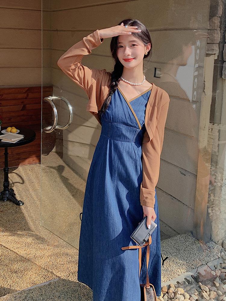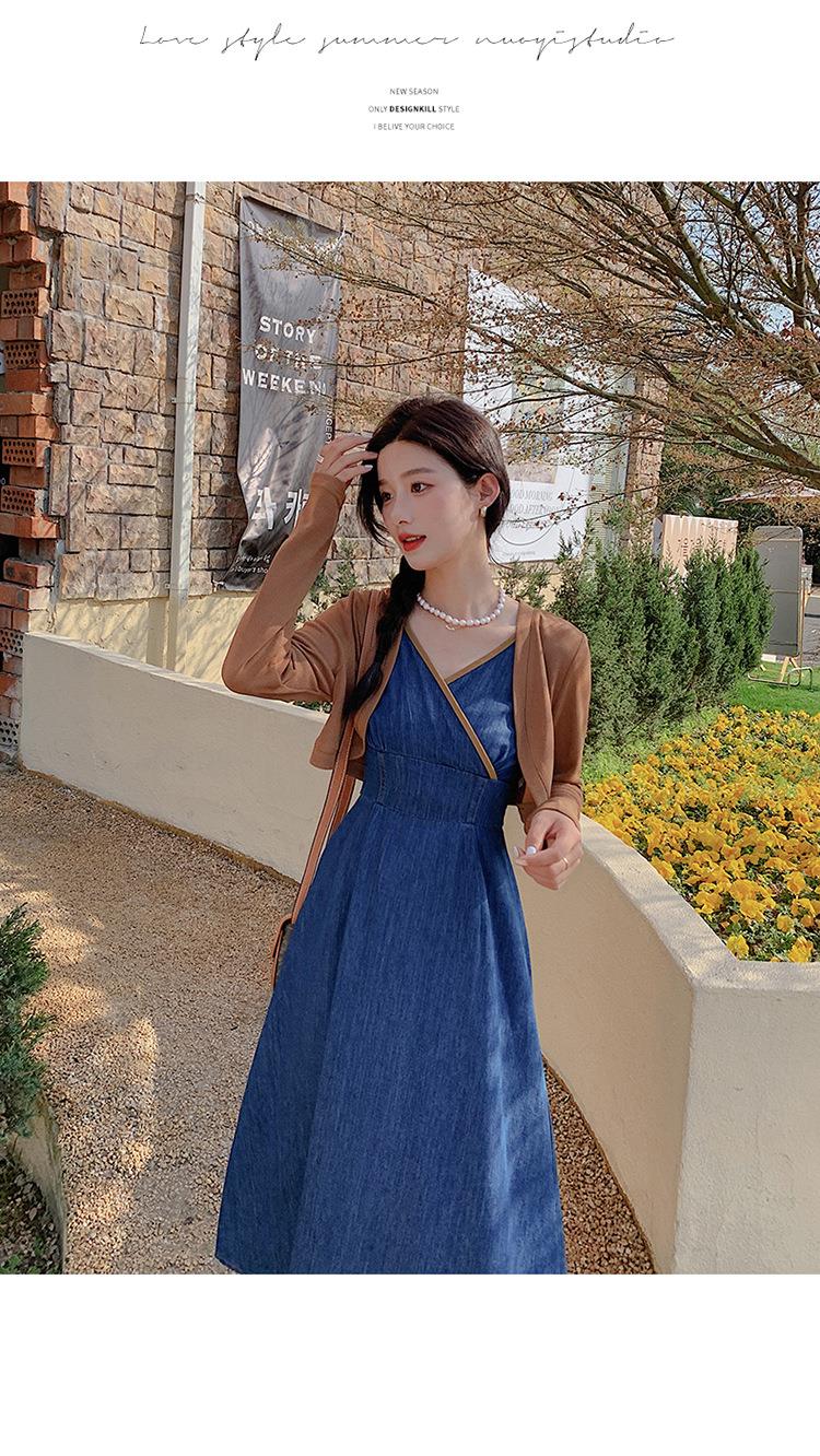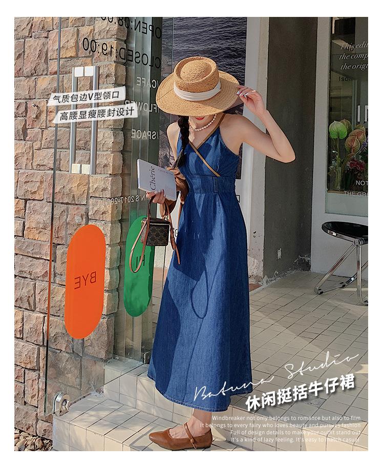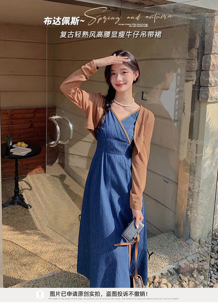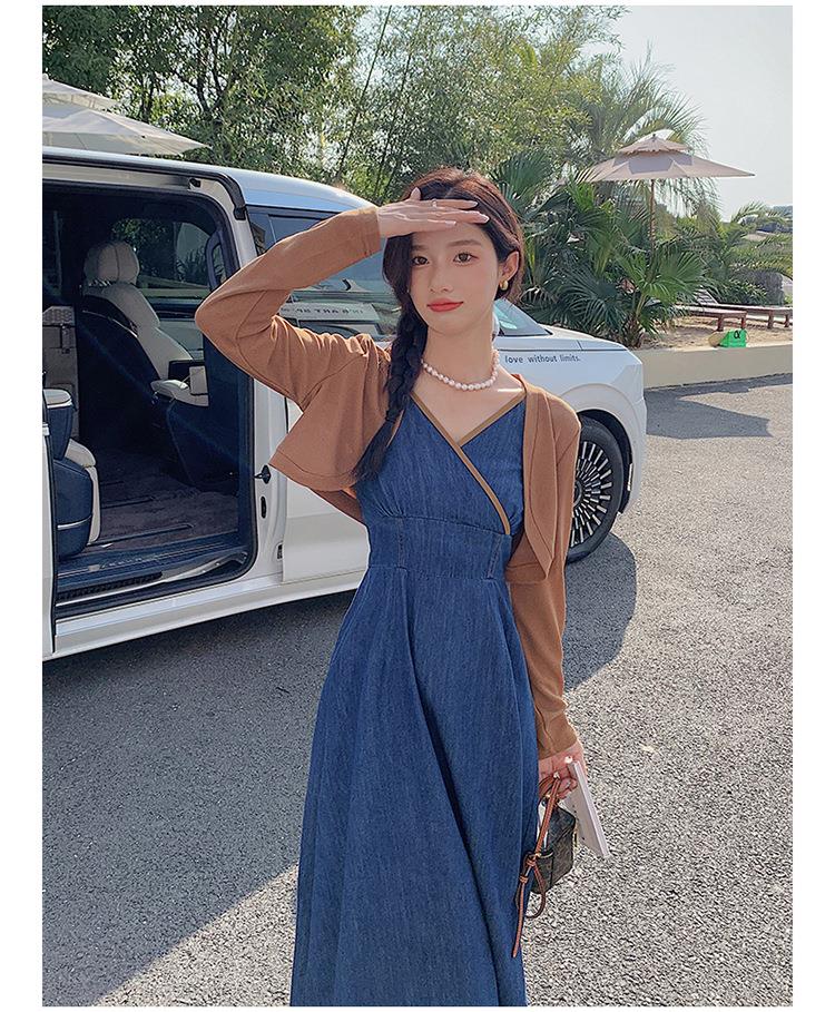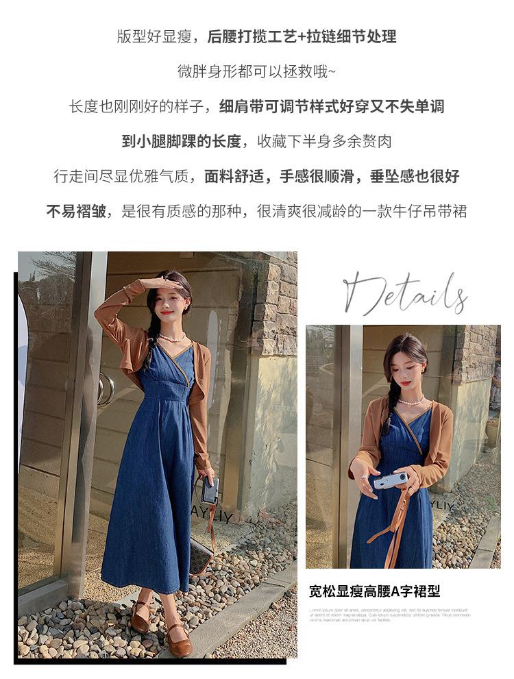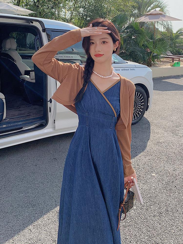 设计感V领吊带牛仔连衣裙女夏季新款法式复古披肩裙子两件套装