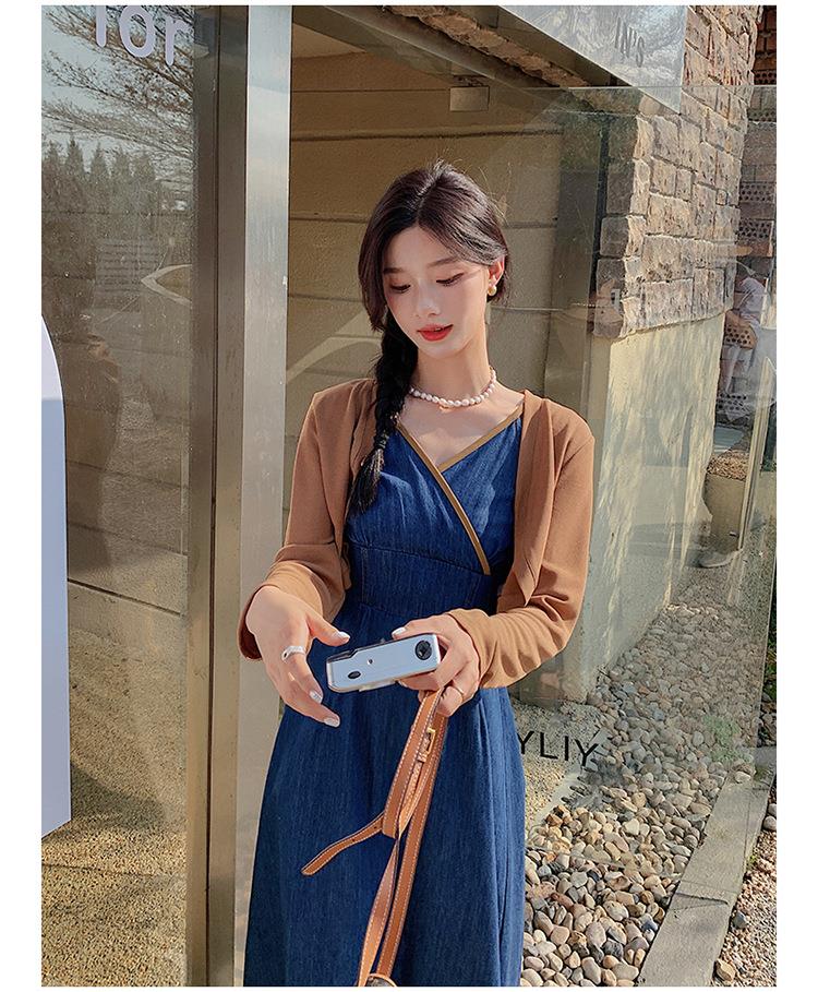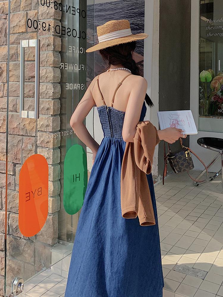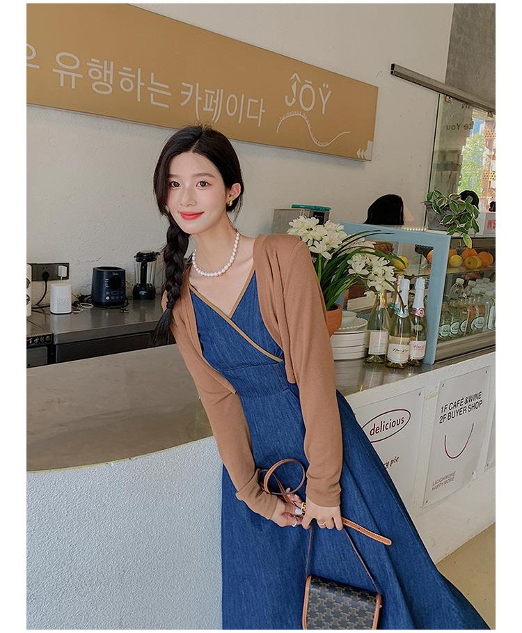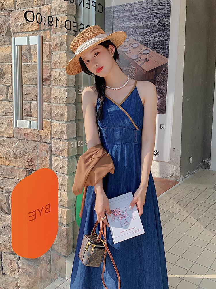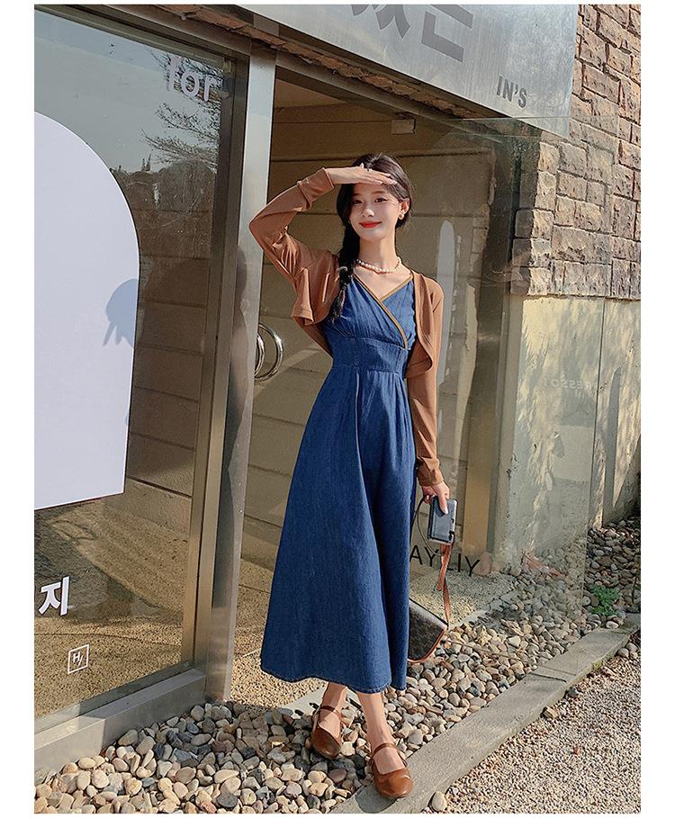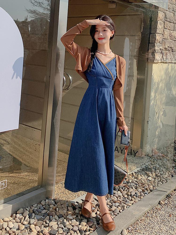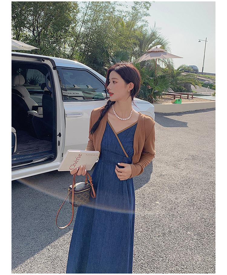 设计感V领吊带牛仔连衣裙女夏季新款法式复古披肩裙子两件套装