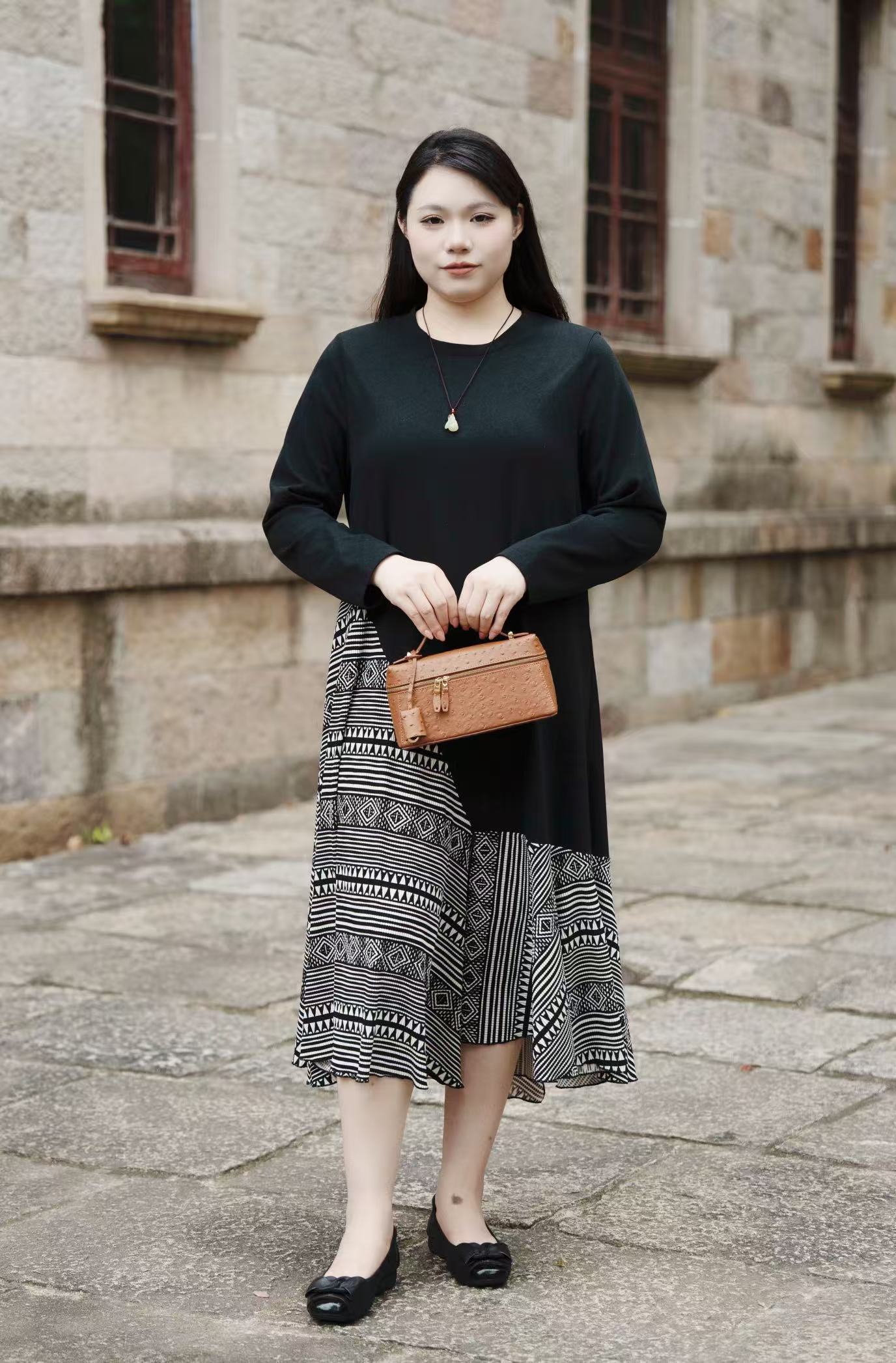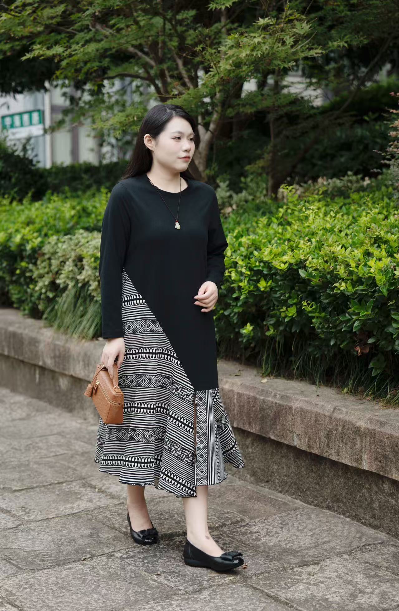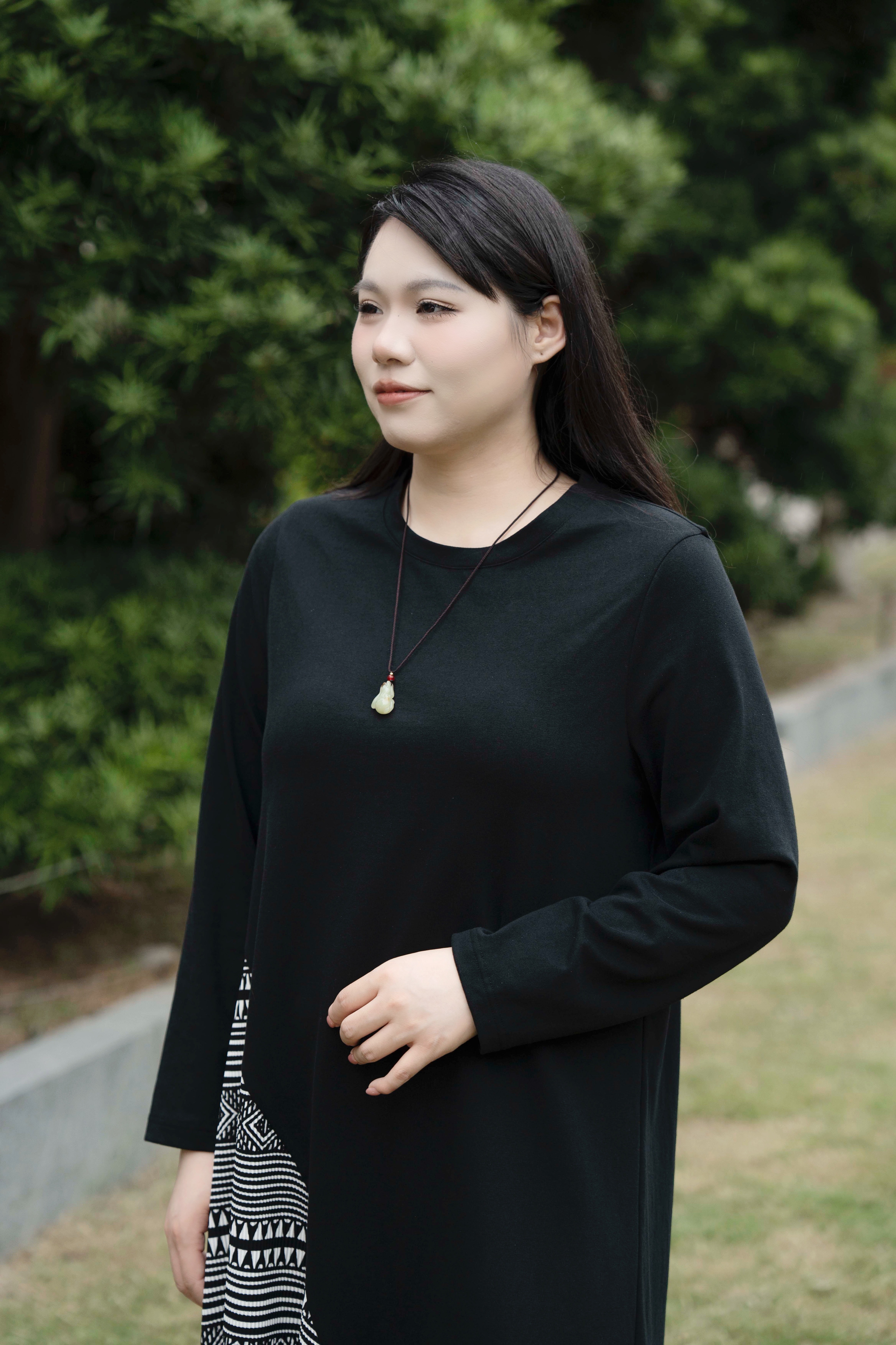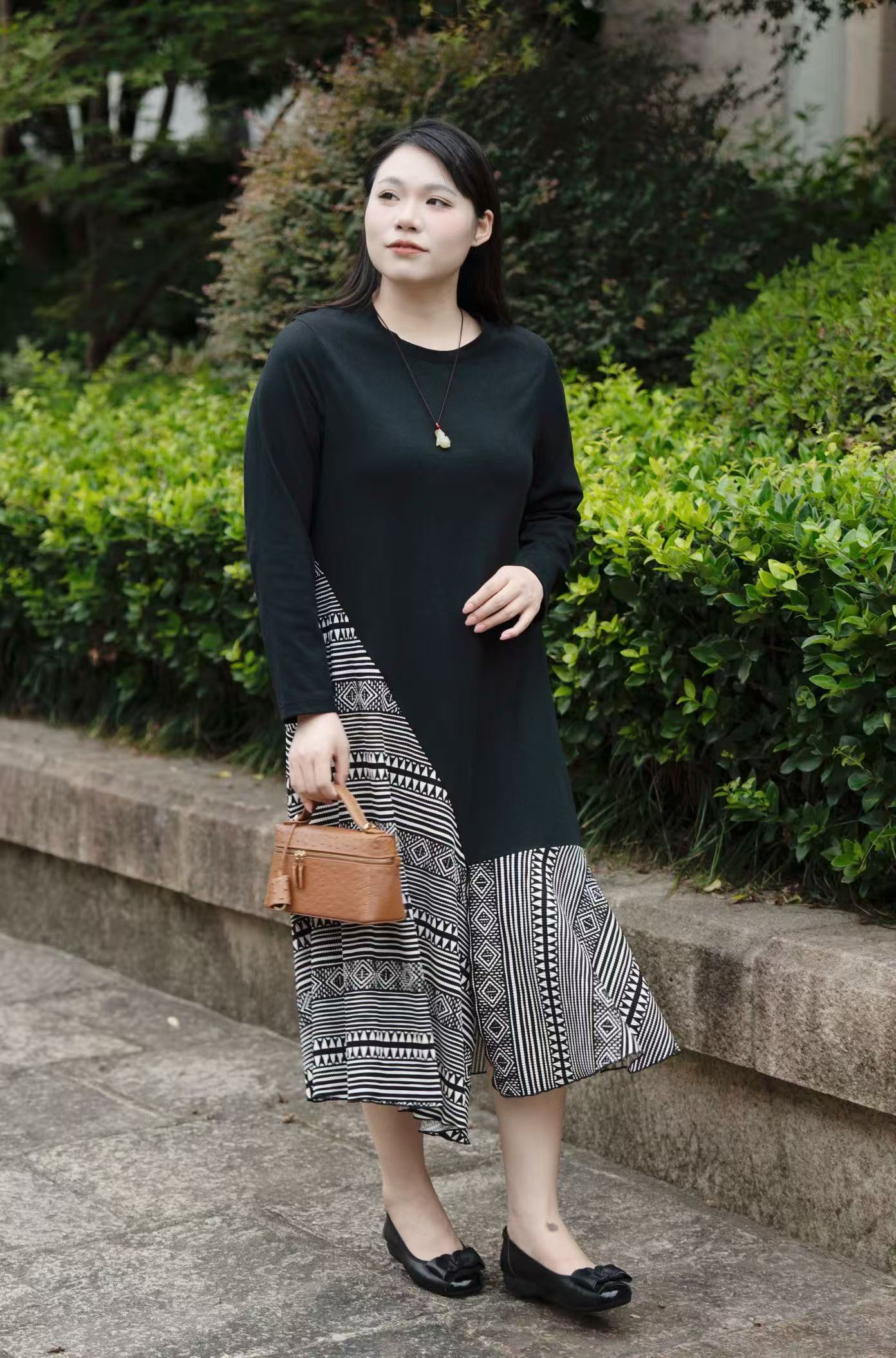现货,今天秒发!【拼接套头款连衣裙】不显臃肿,非常显瘦!非常有气质!黑色部分面料为100%纯棉,花色拼接部分为聚酯纤维