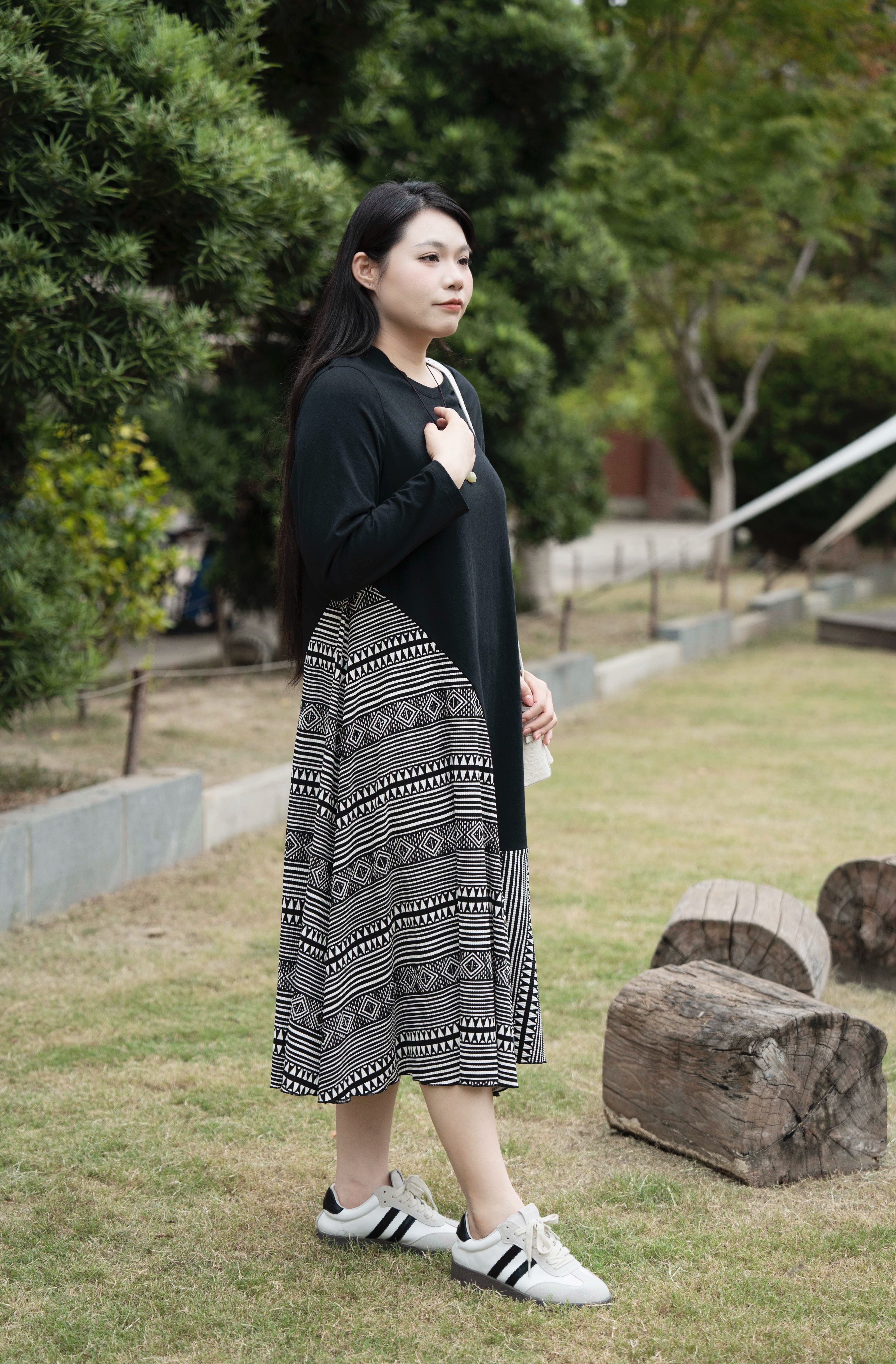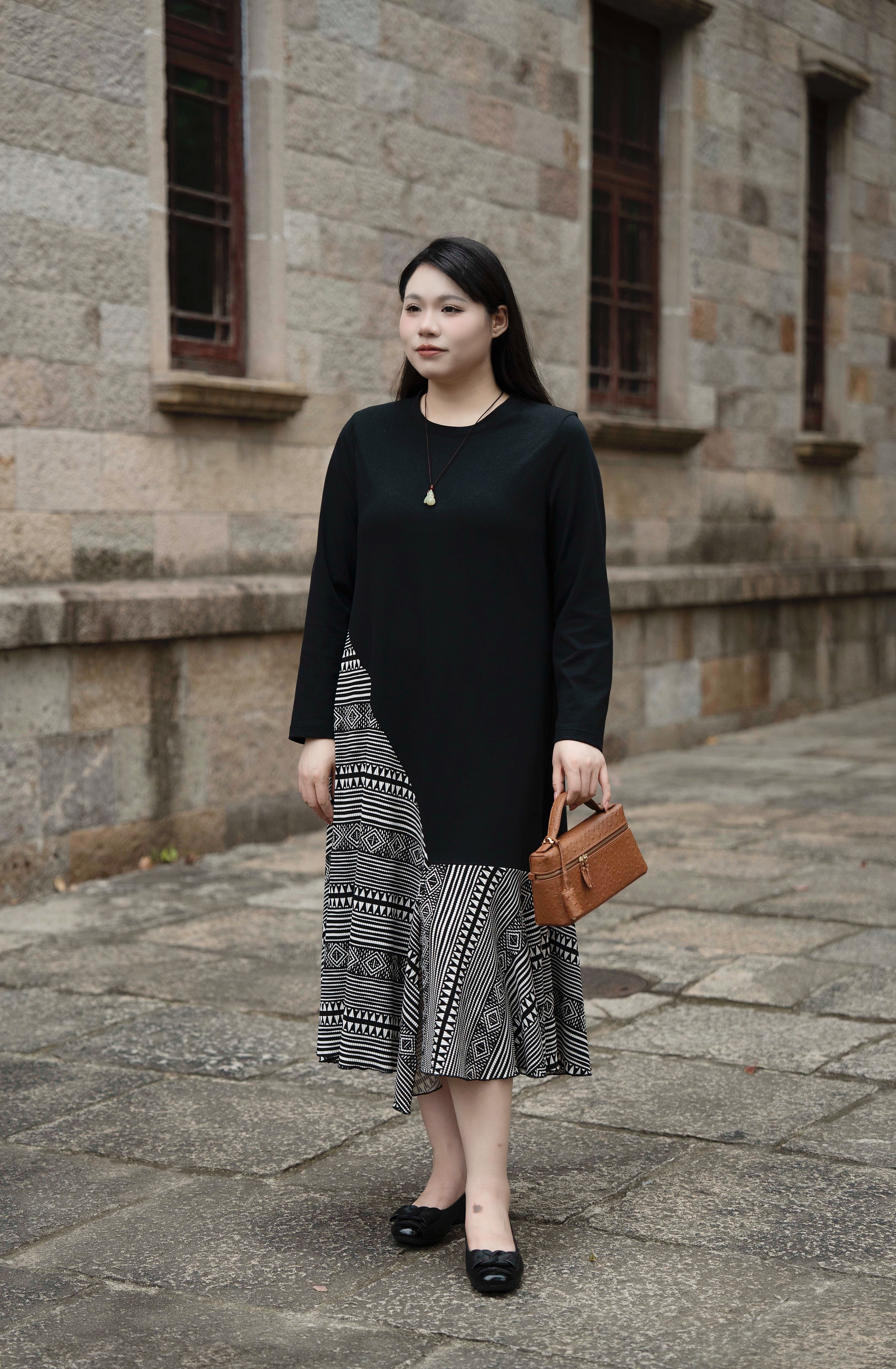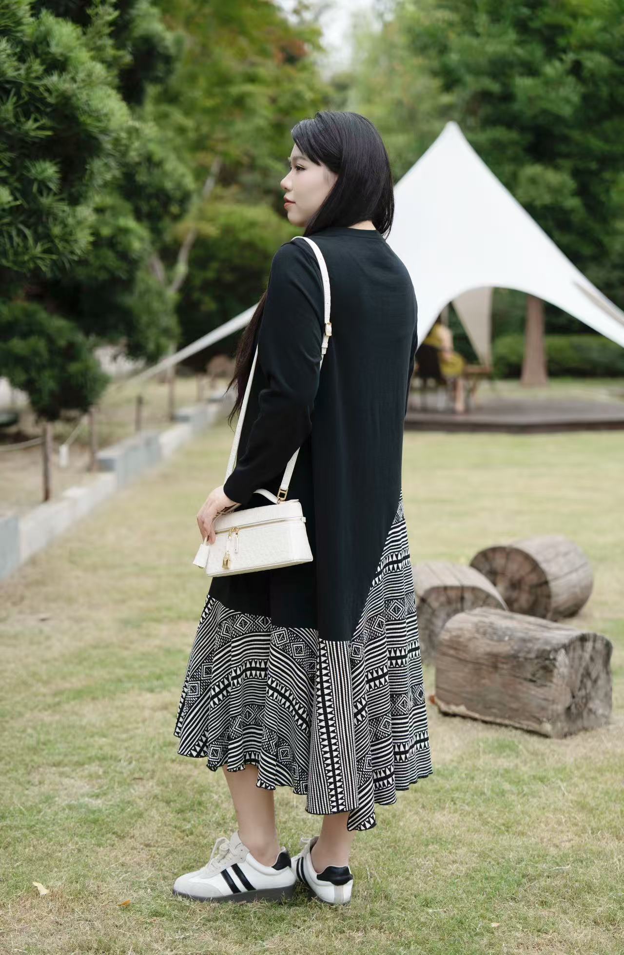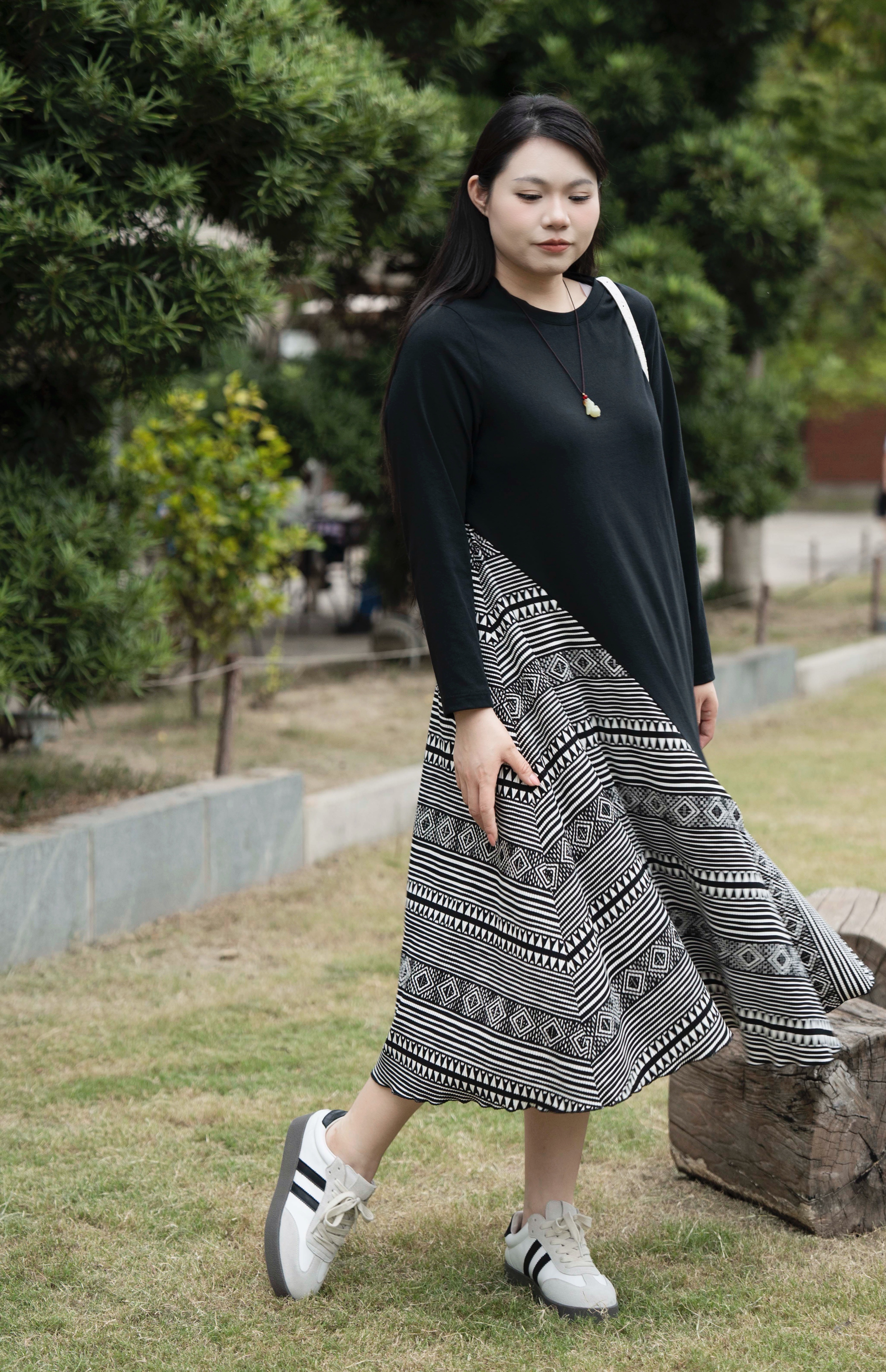 现货,今天秒发!【拼接套头款连衣裙】不显臃肿,非常显瘦!非常有气质!黑色部分面料为100%纯棉,花色拼接部分为聚酯纤维