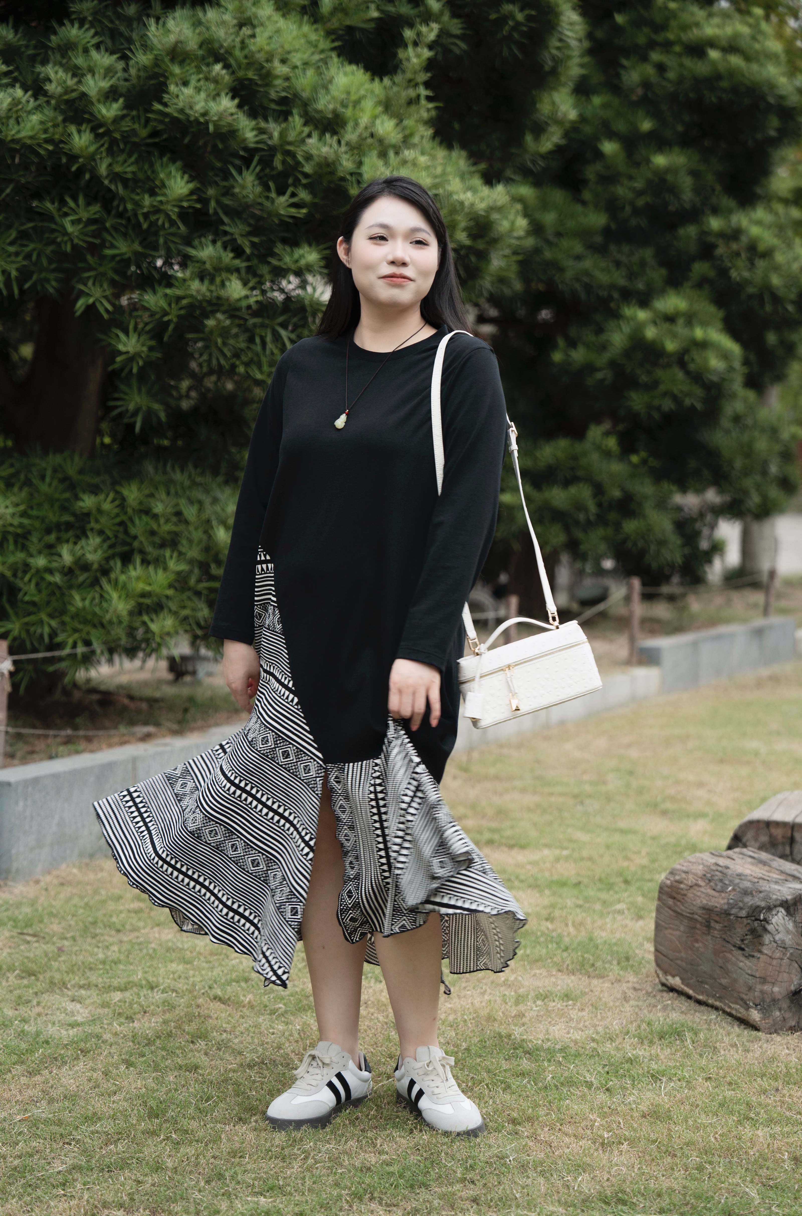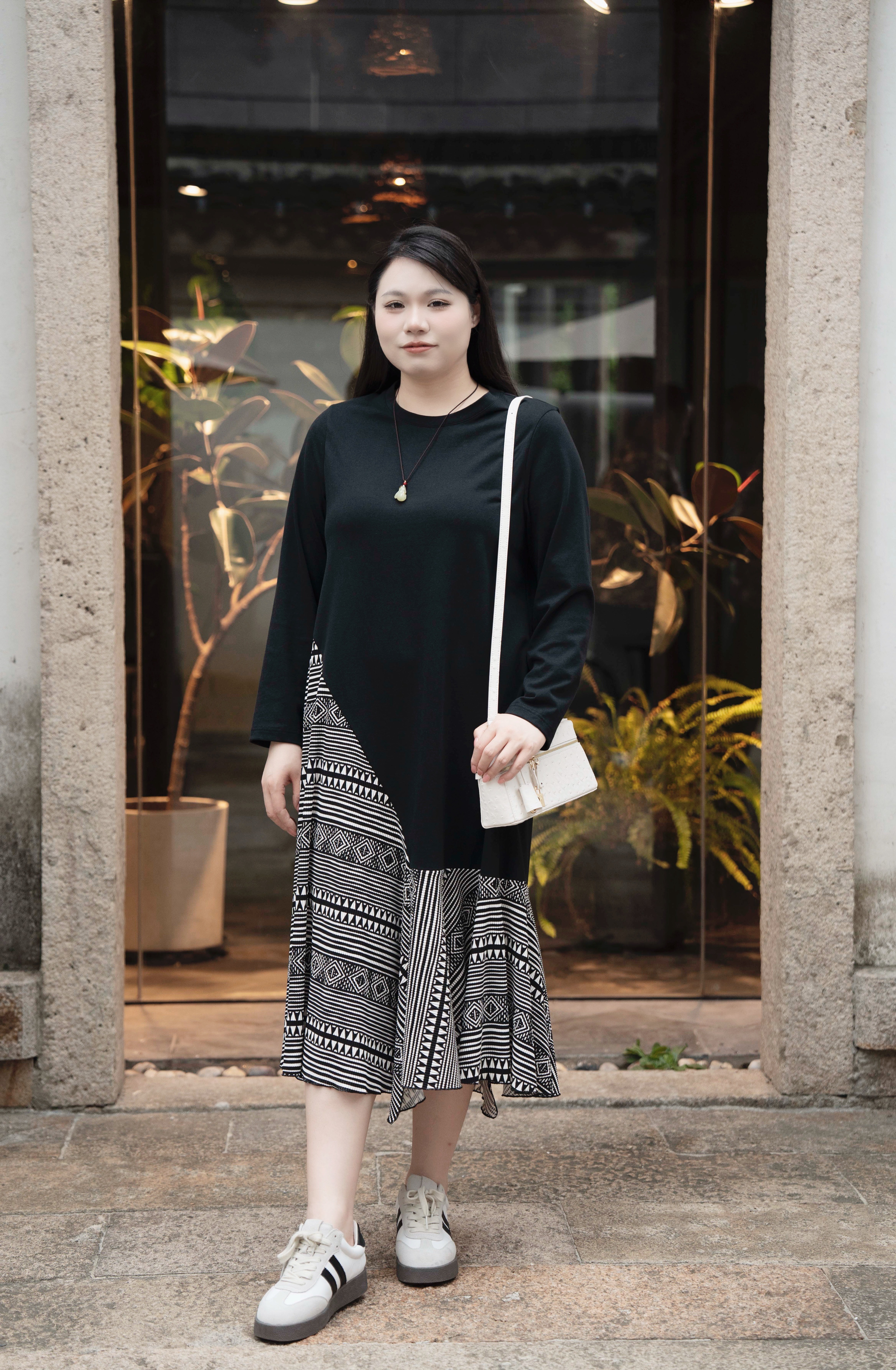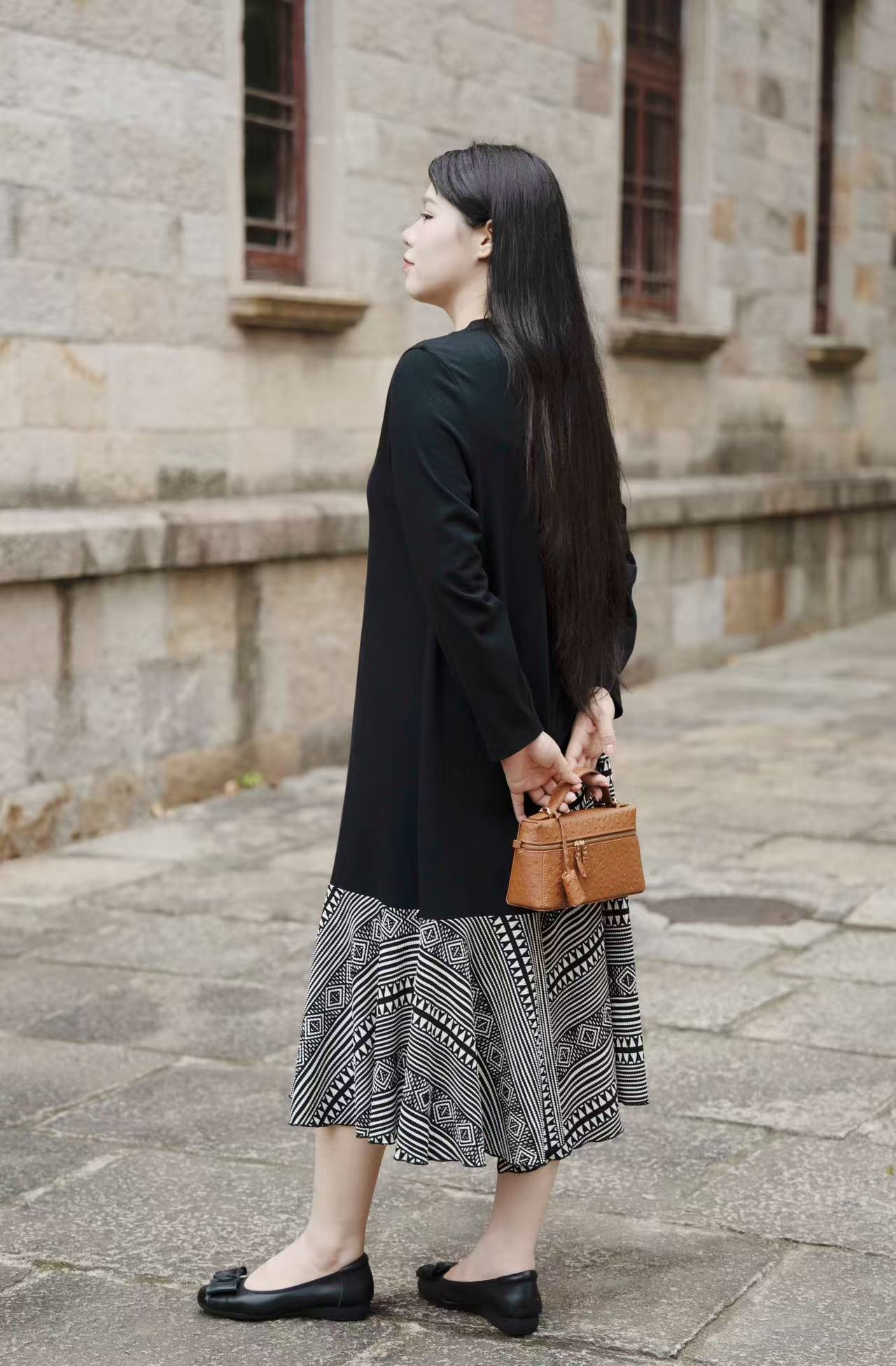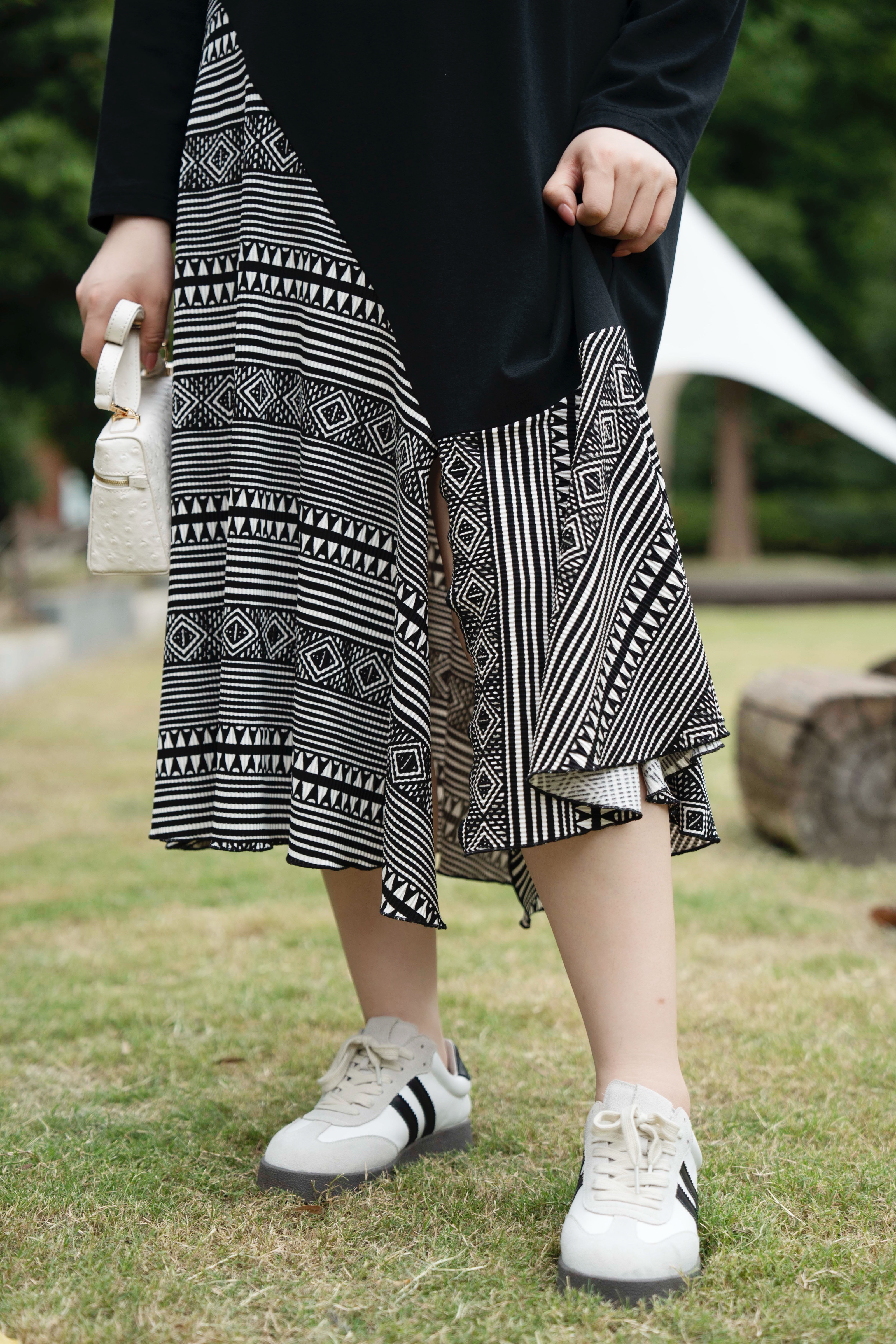 现货,今天秒发!【拼接套头款连衣裙】不显臃肿,非常显瘦!非常有气质!黑色部分面料为100%纯棉,花色拼接部分为聚酯纤维
