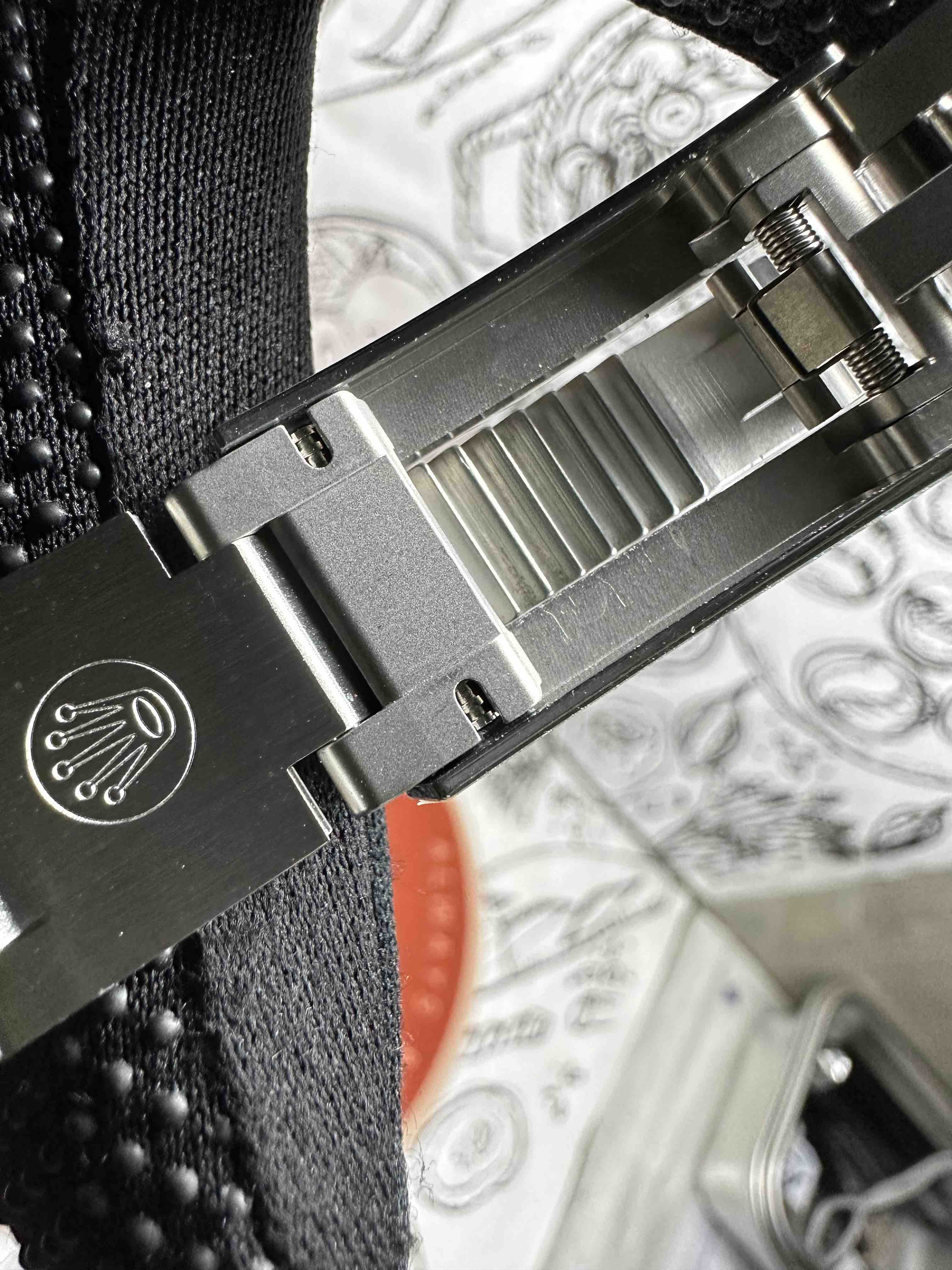 市面唯一钢带头部同步原装宽度加宽,佩戴更舒适,视感更完美(老版本钢带比较瘦窄)。表扣伸缩结构完美克隆,表扣内最新刻字更新为022。