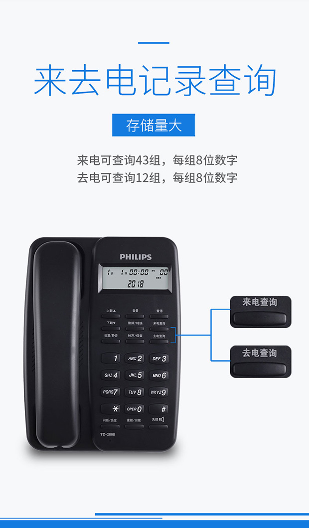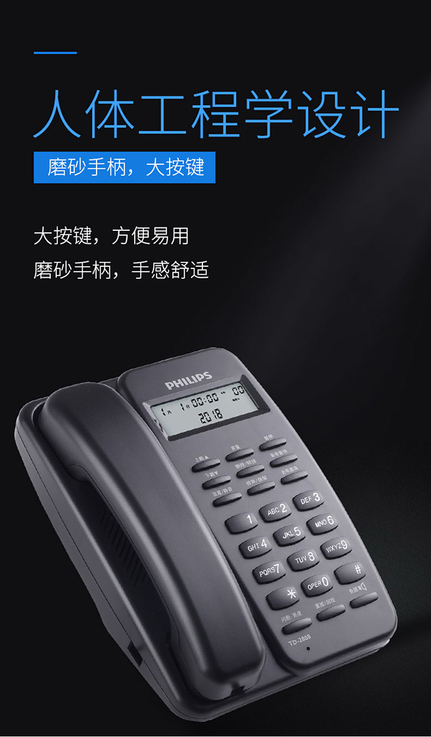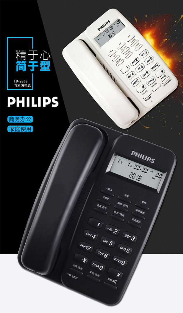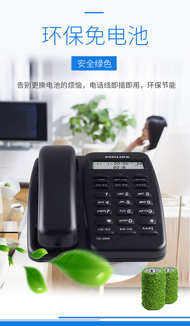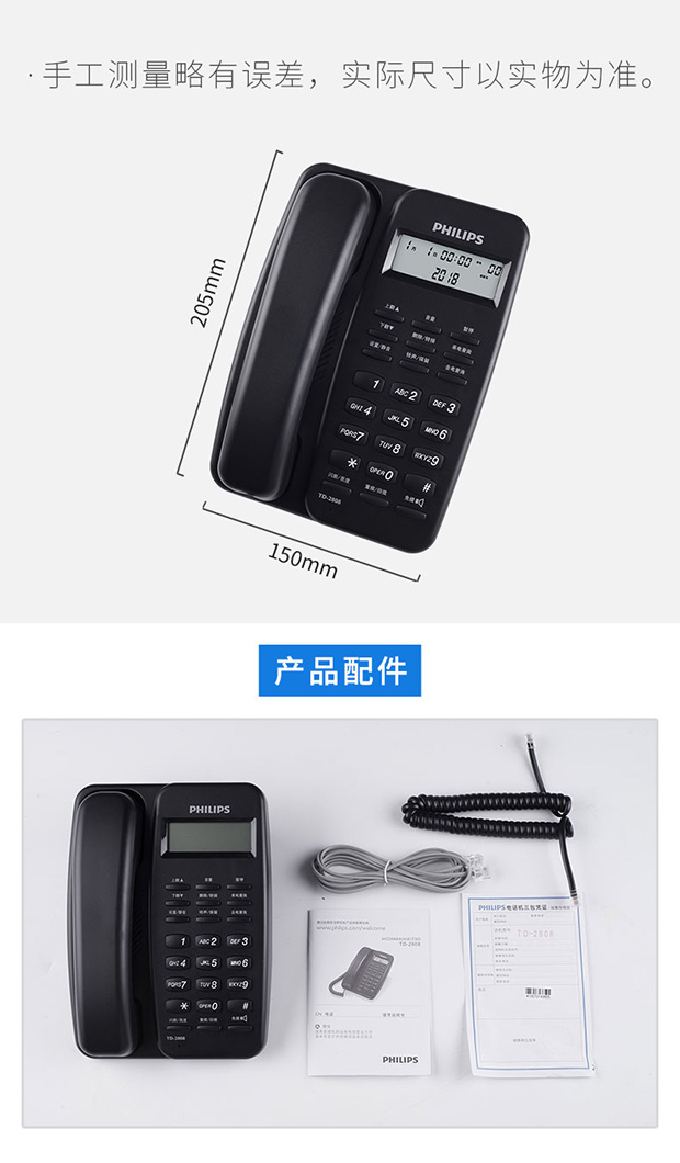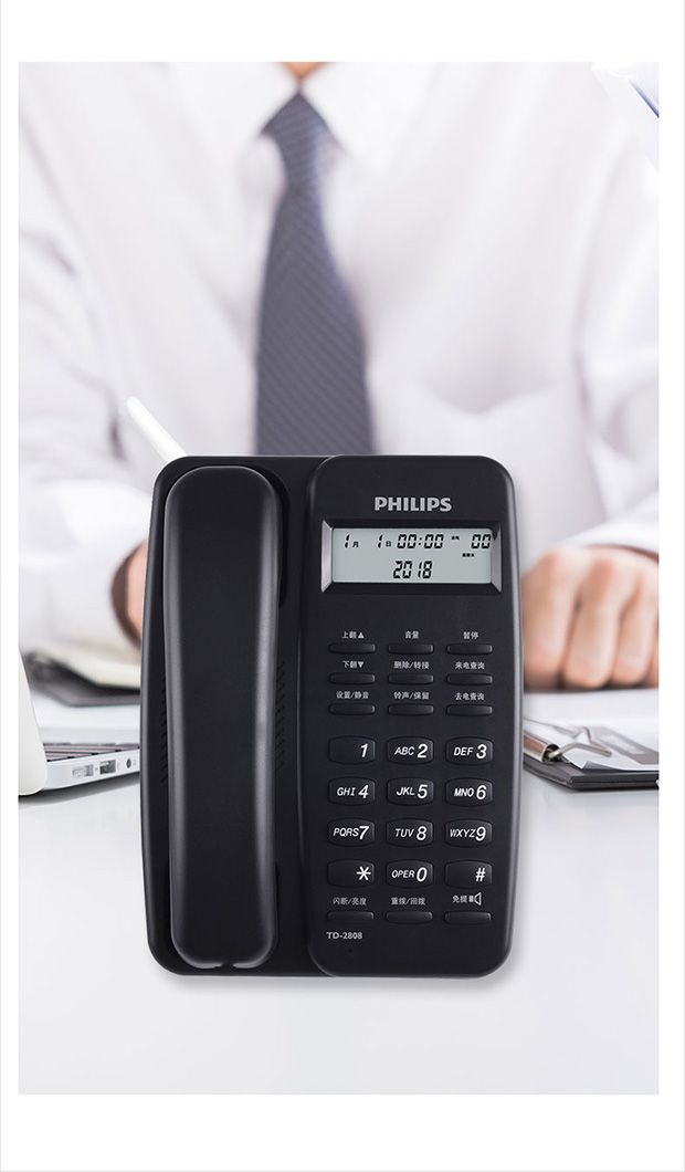 飞利浦(PHILIPS)电话机座机 固定电话 办公家用 免电池设计 来电显示 TD-2808 (黑色)