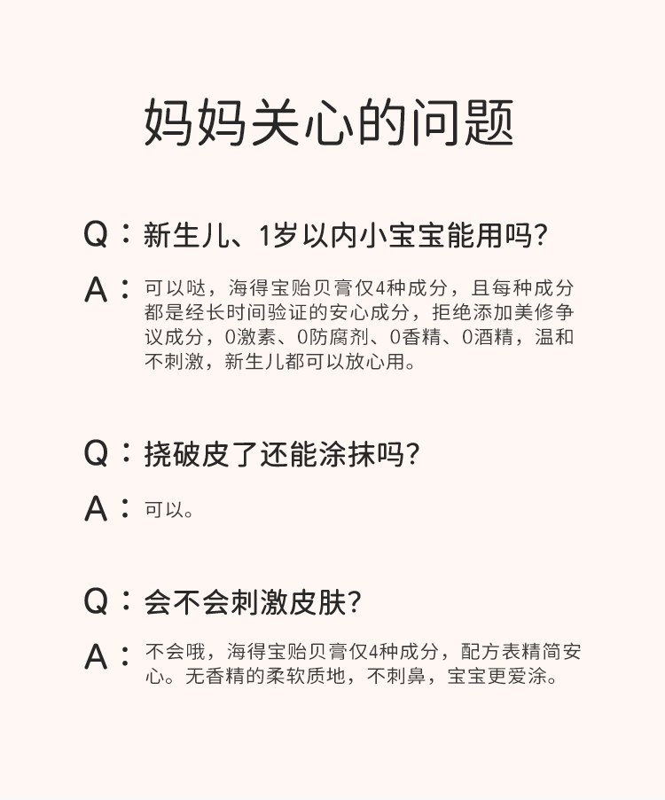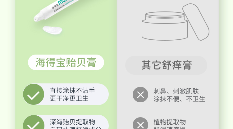 【产品介绍】 A、只有4种成分(世界成分最少的蚊虫叮咬止痒膏)极简配方,安全有效,特别适用于新生儿 B、止痒快,30秒止痒(凯普斯泰,海得宝专利无激素止痒成分) C、蚊虫叮咬止痒,功效升级虫咬性皮炎护理, D、凯普斯泰(止痒、抗菌、消炎、海得宝专利贻贝提取物来自皮肤科的天然止痒抗炎成分) E、小红书种草爆款,天猫公域爆款2022年累计全渠道销售25万+支