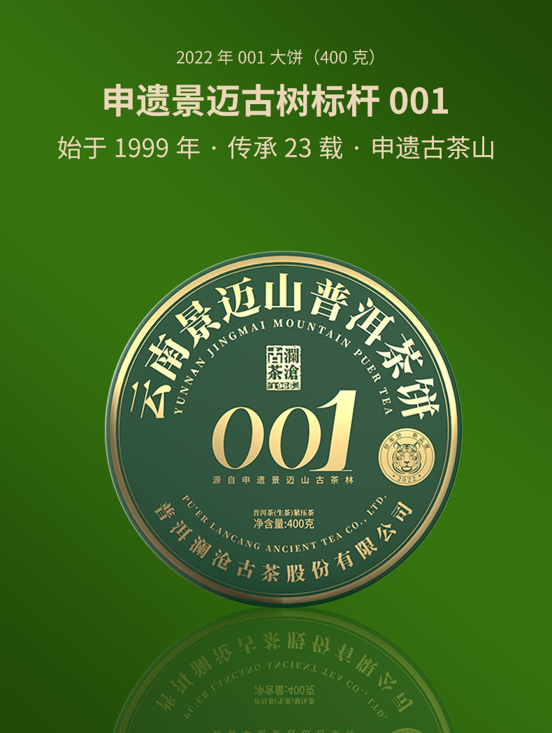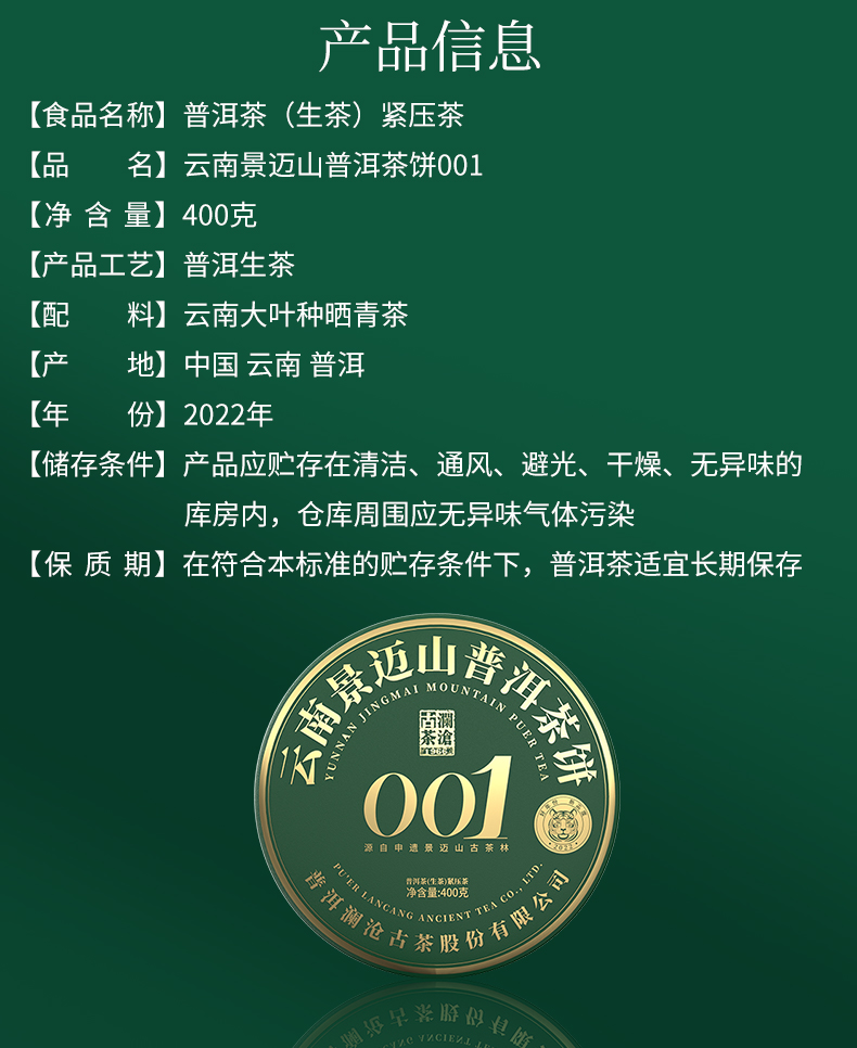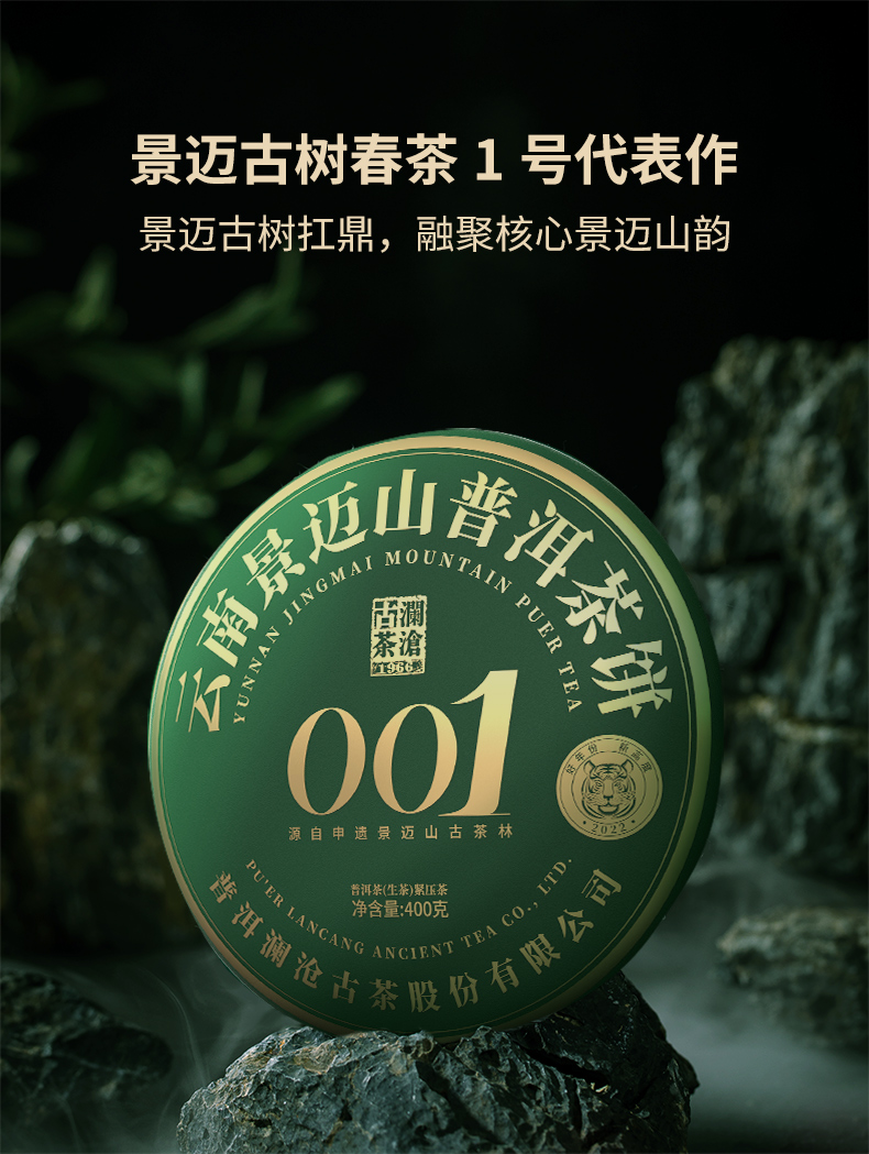 澜沧古茶2022年景迈001大饼普洱生茶400g/片(1提拍5片)