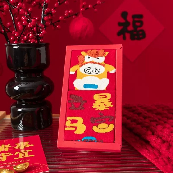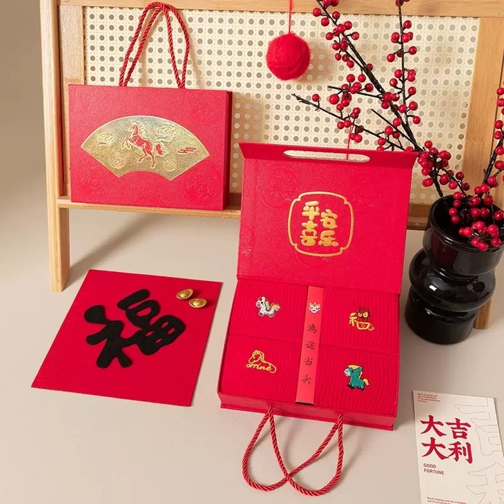 经典手提礼盒分为“快乐马”“平安马”“好运马”三个款式,内含4双正红色袜子,适合全年龄段,尤其受长辈欢迎。