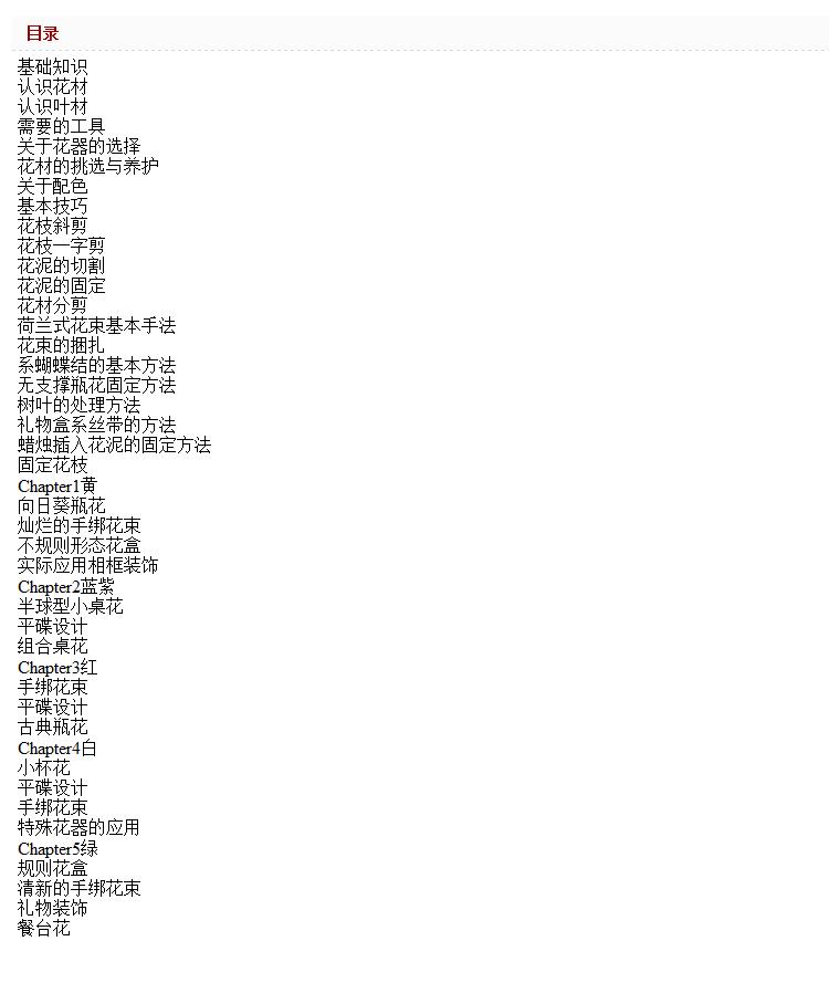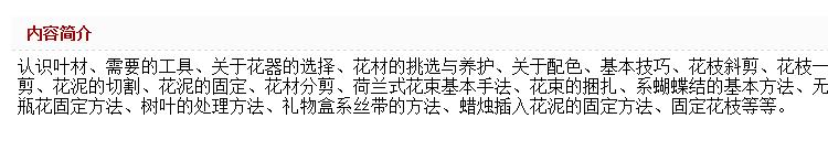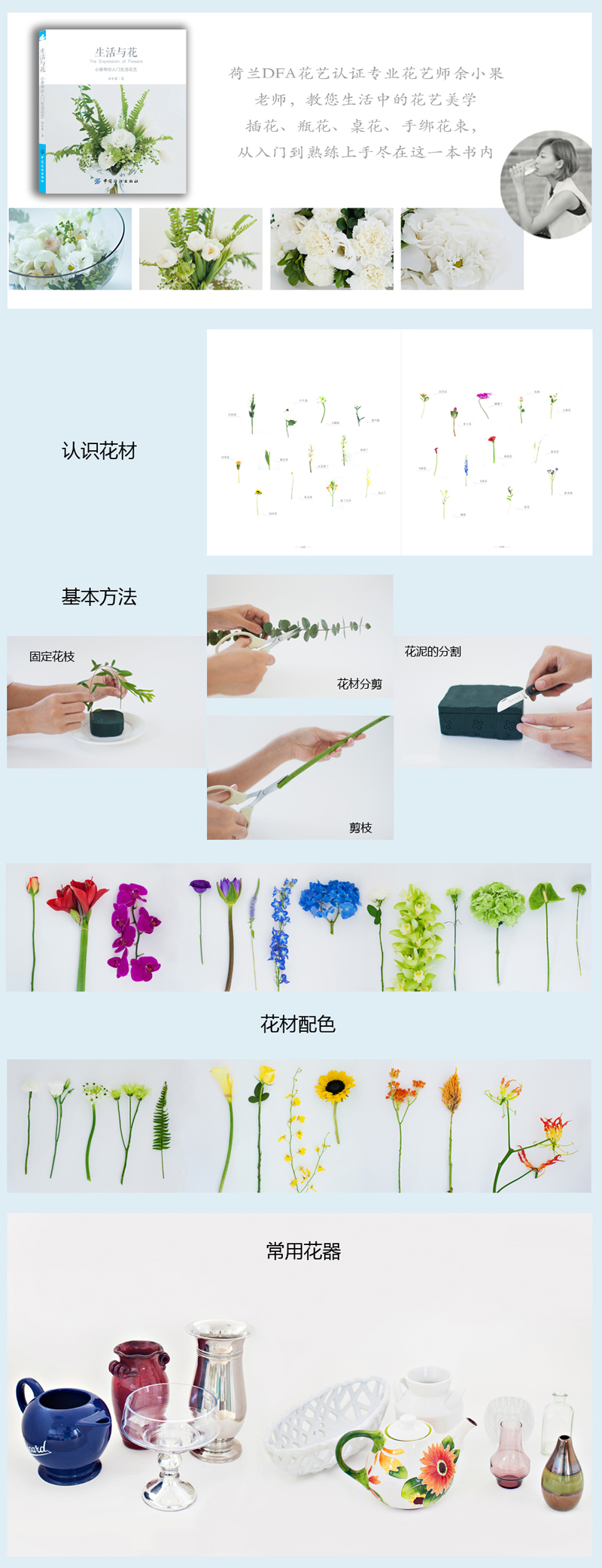 0123456789《生活与花:小果带你入门生活花艺》一书不是一本传统意义上的“插花”书,而是一本生活花艺书。书中的作品包括瓶花、桌花、手绑花束以及礼品装饰,每一个作品都将花艺的美学完美的融入到日常生活中,比起传统的插花书更加“贴地气”,更实用。书中涵盖了将近15种花艺操作技巧和20种表现形式,无论是初学者还是花艺爱好者都一定可以从书中找到有价值的信息。作者遵循正宗欧式花艺审美来创作,呈现的作品沿袭目前花艺领域流行的花艺风格,图片精良;除了花艺作品,作者将一些花艺的理念和美好的生活态度都融入其中,传达一种优雅的氛围,带您入门生活花艺美学。
