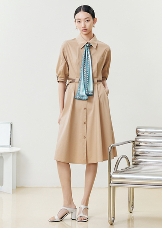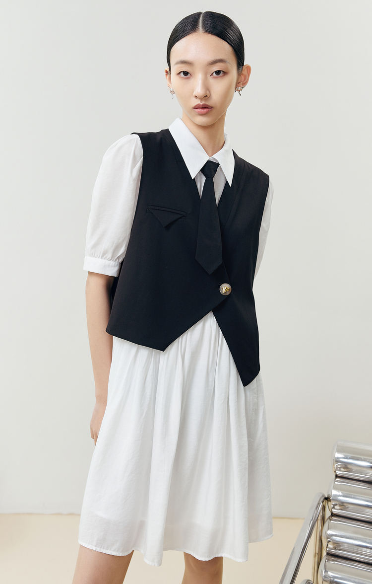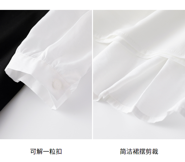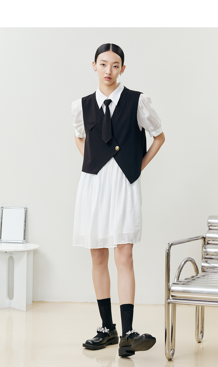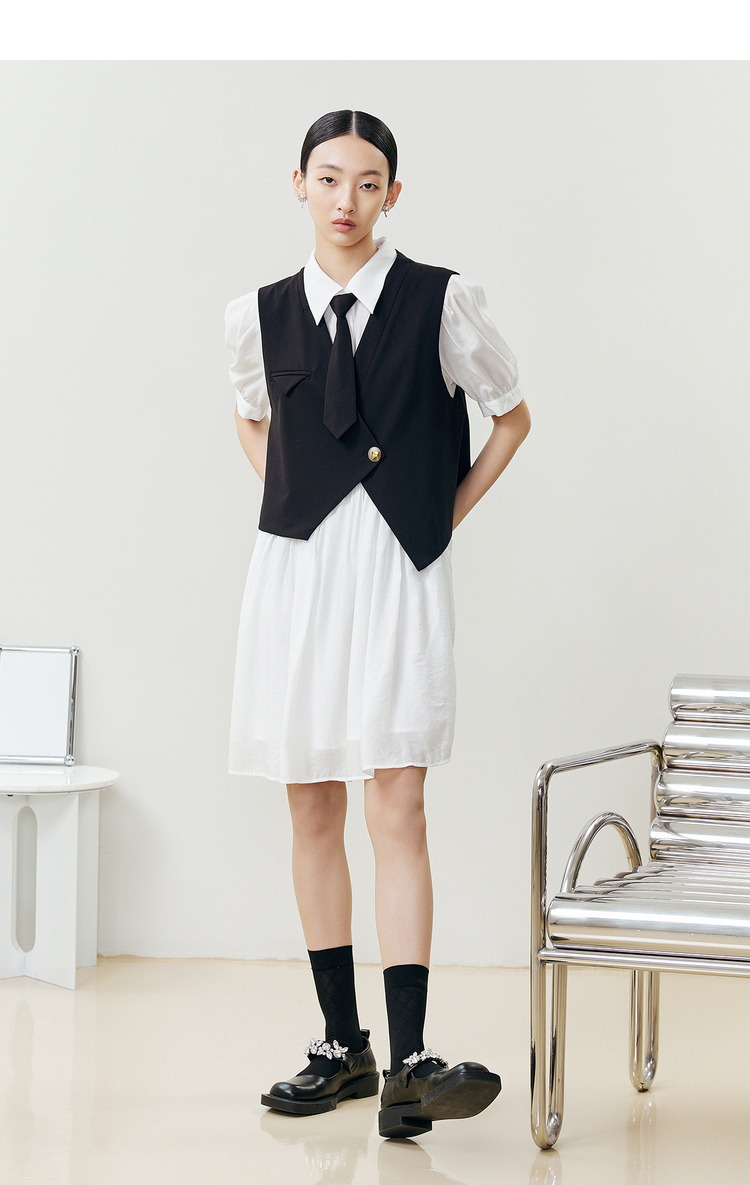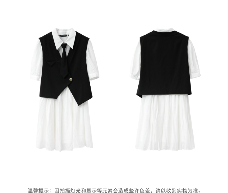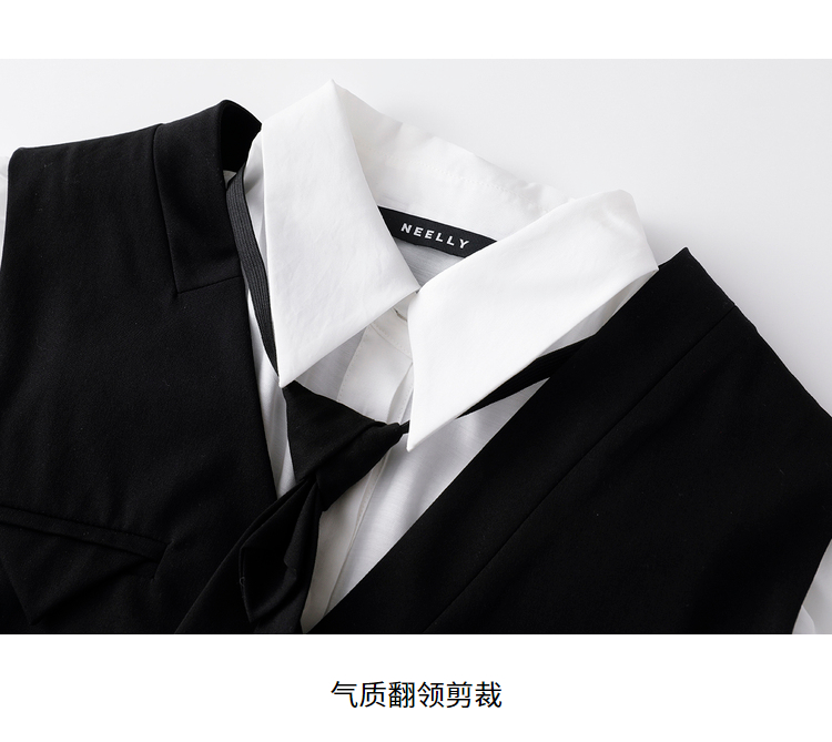 NEELLY纳俪假两件连衣裙女可脱卸领带衬衫式A字裙泡泡袖中长款N22041Y01018