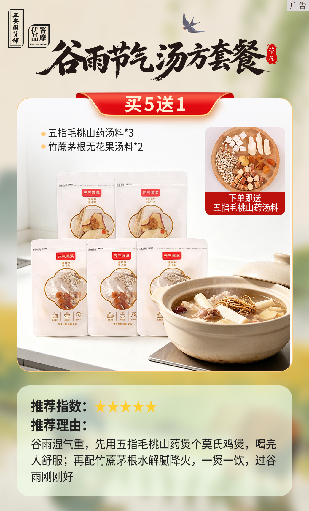 【谷雨时节汤方】先逐湿后降火 五指毛桃山药汤料*3包+竹蔗茅根无花果汤料*2包(送:五指毛桃山药汤料*1包,到手共6包)
