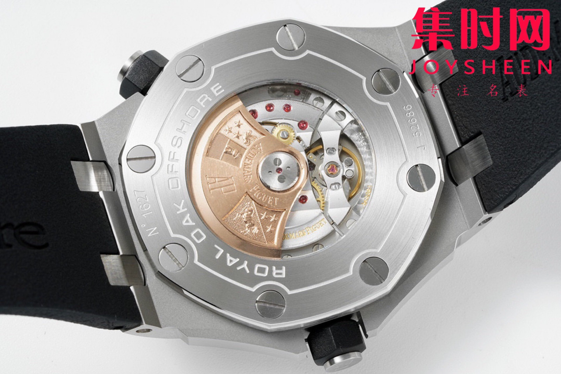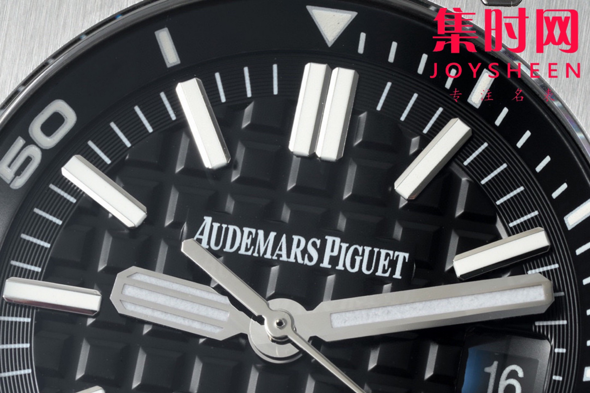 4.亮黑的格纹表盘,超大的格纹是爱彼的设计特色,粗胖的时针长短以及内部镂空处理都与原版一致,更加锋利无毛刺