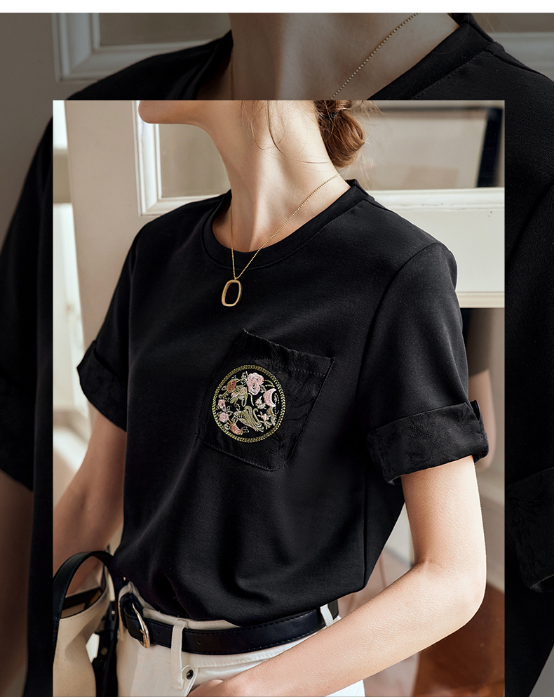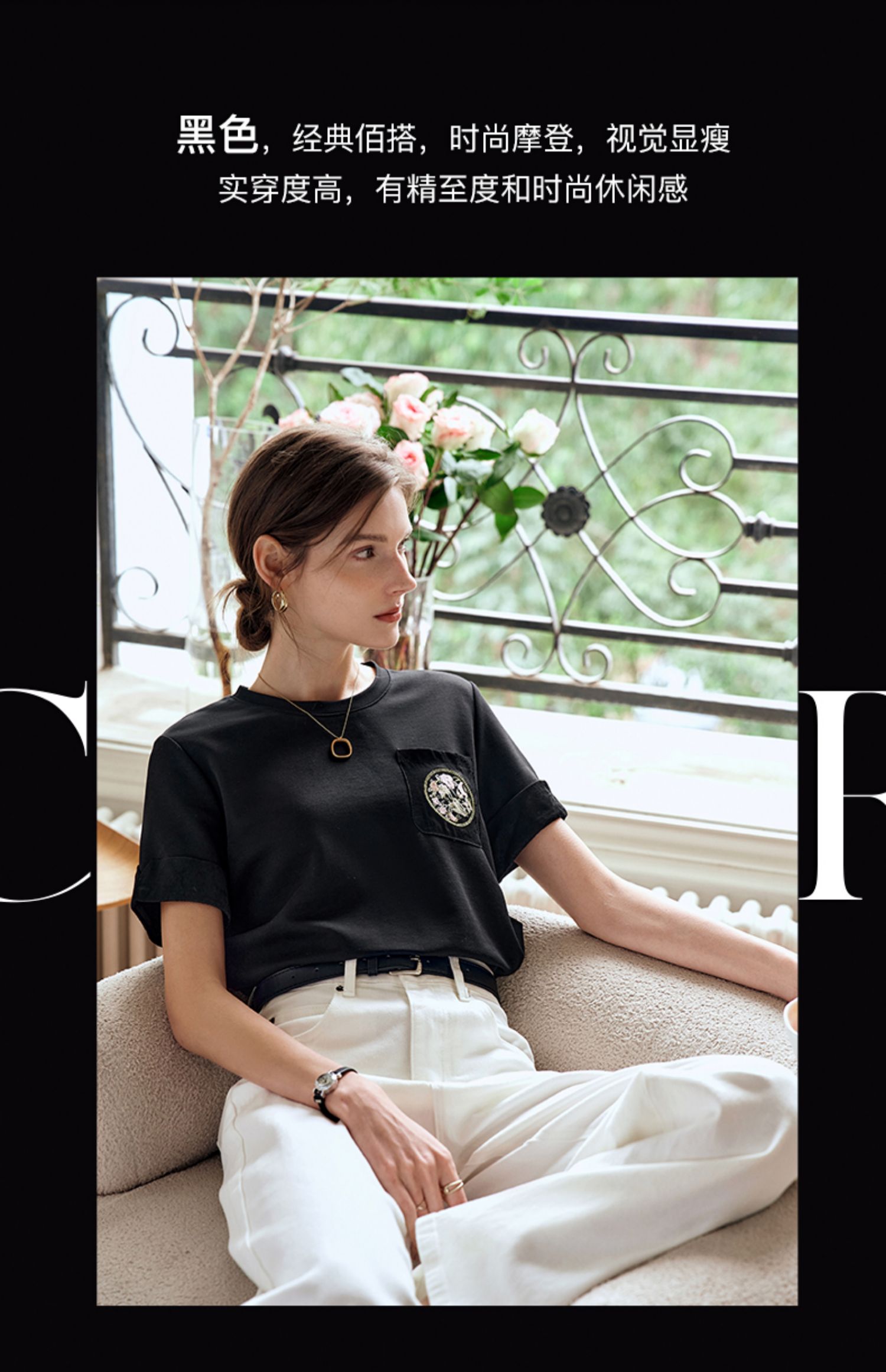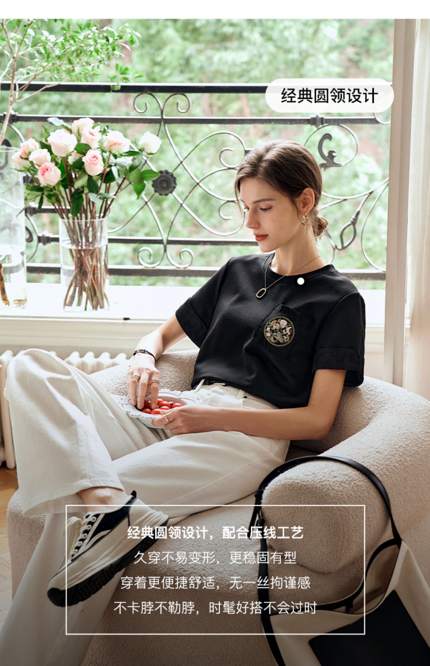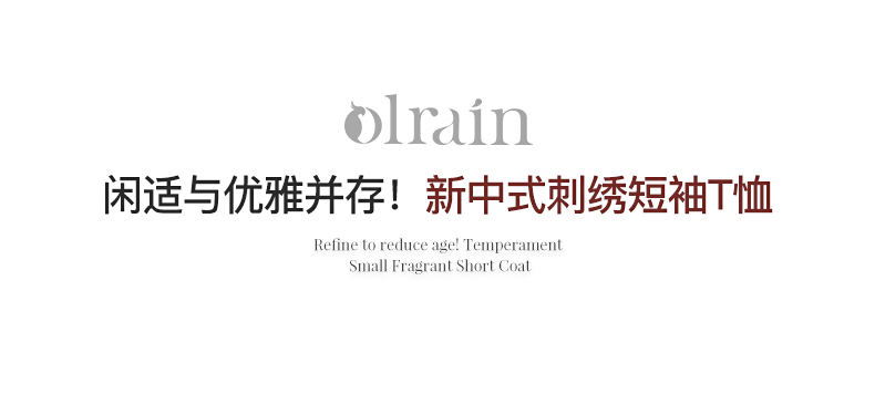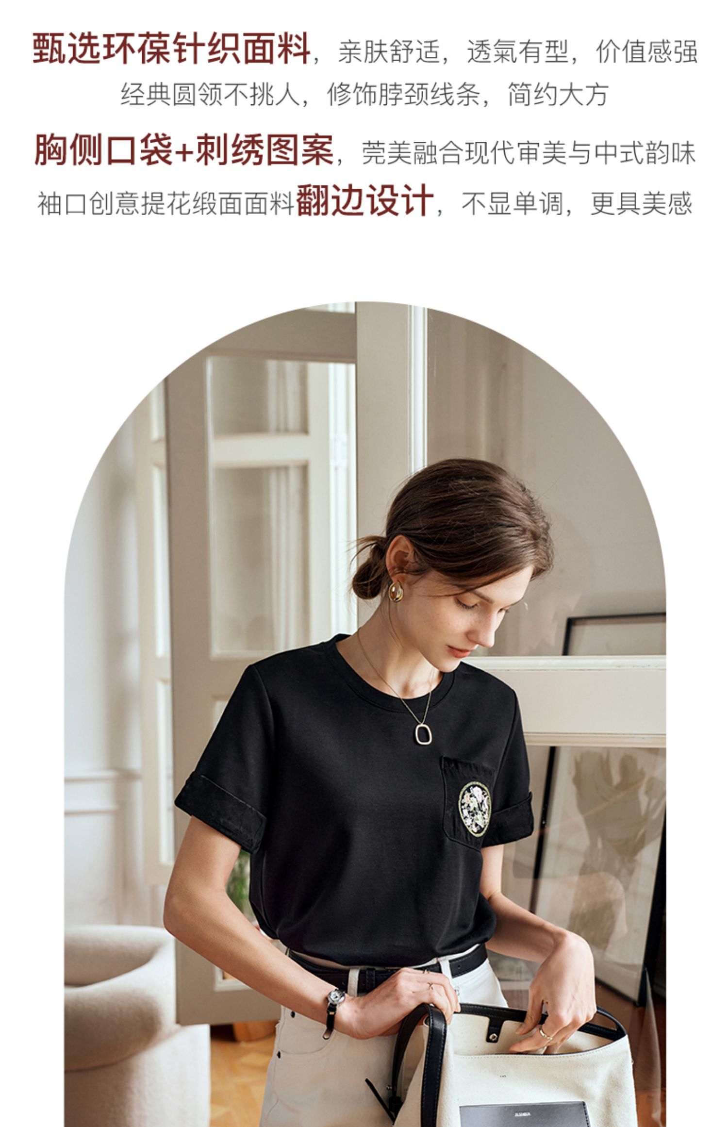 OLrain欧芮儿新中式黑色T恤女夏季2024年新款宽松刺绣短袖上衣
