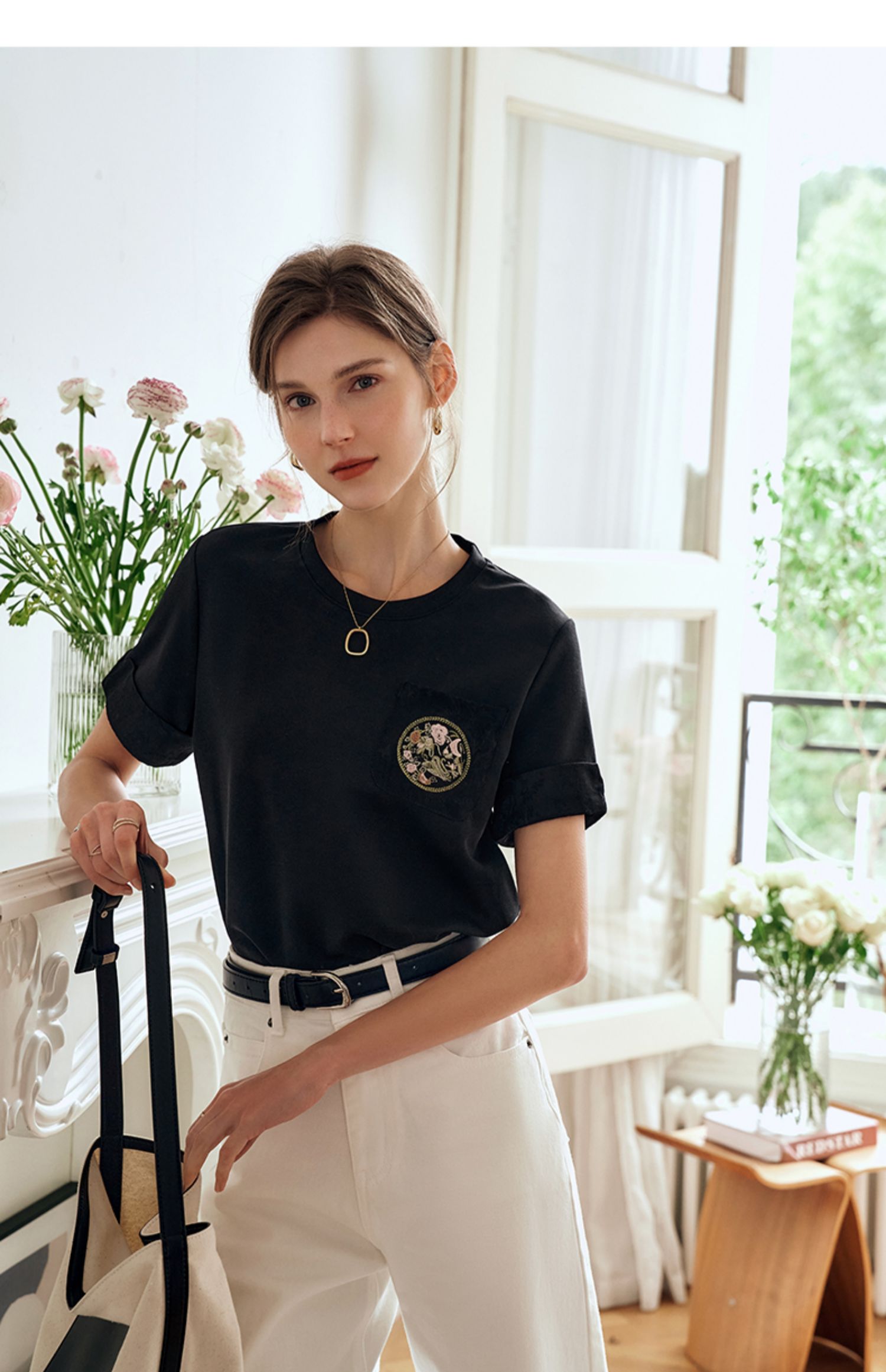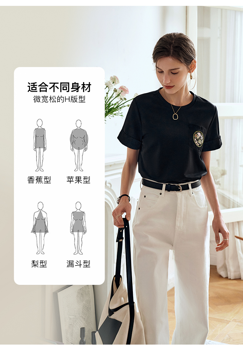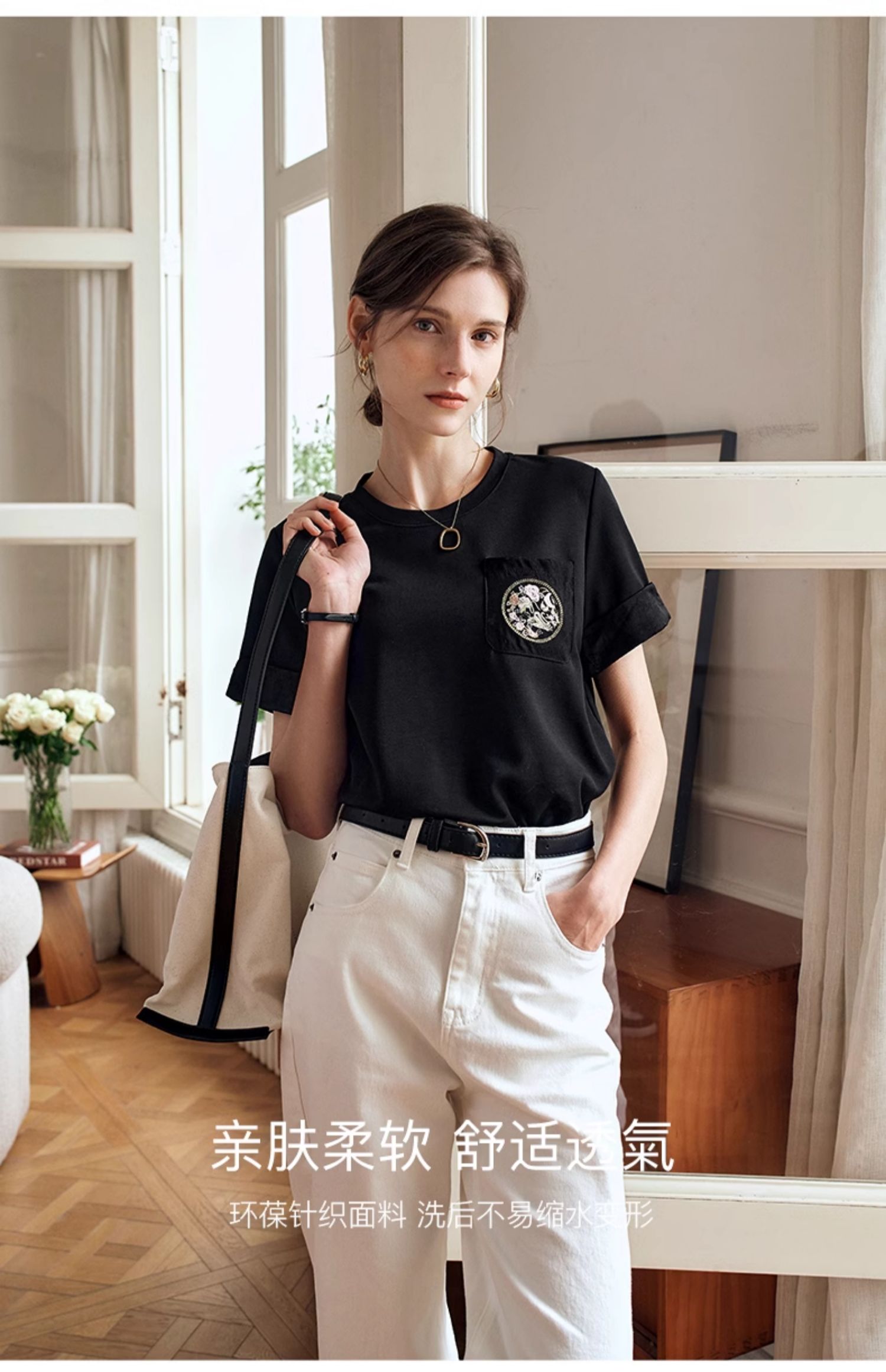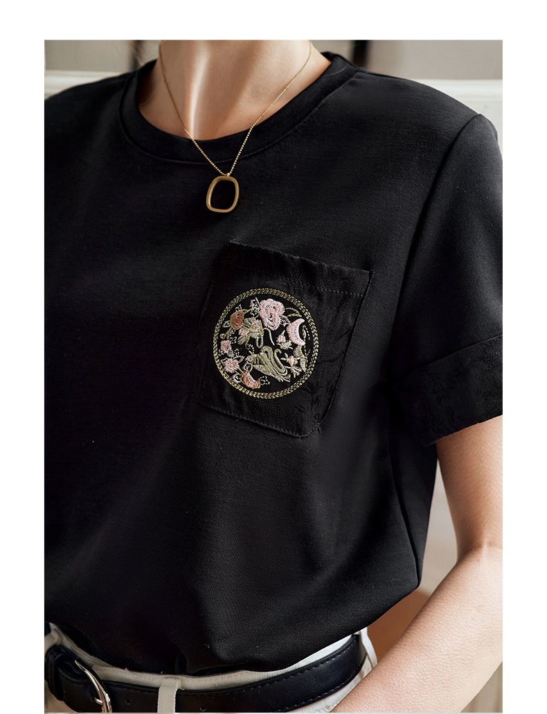 OLrain欧芮儿新中式黑色T恤女夏季2024年新款宽松刺绣短袖上衣