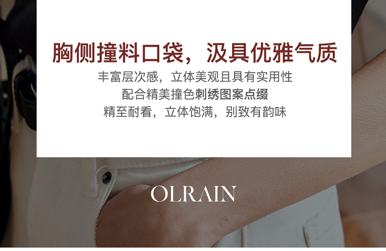 - “精致”是欧芮儿olrain品牌文化的核心,欧芮儿认为,精致的女人,不但要外在动人,更要内在迷人,内外兼修,有魅力、有气质、有内涵,自信而不自傲,优雅而不矫揉,自有万种风情而不轻浮,更不故作矜持。