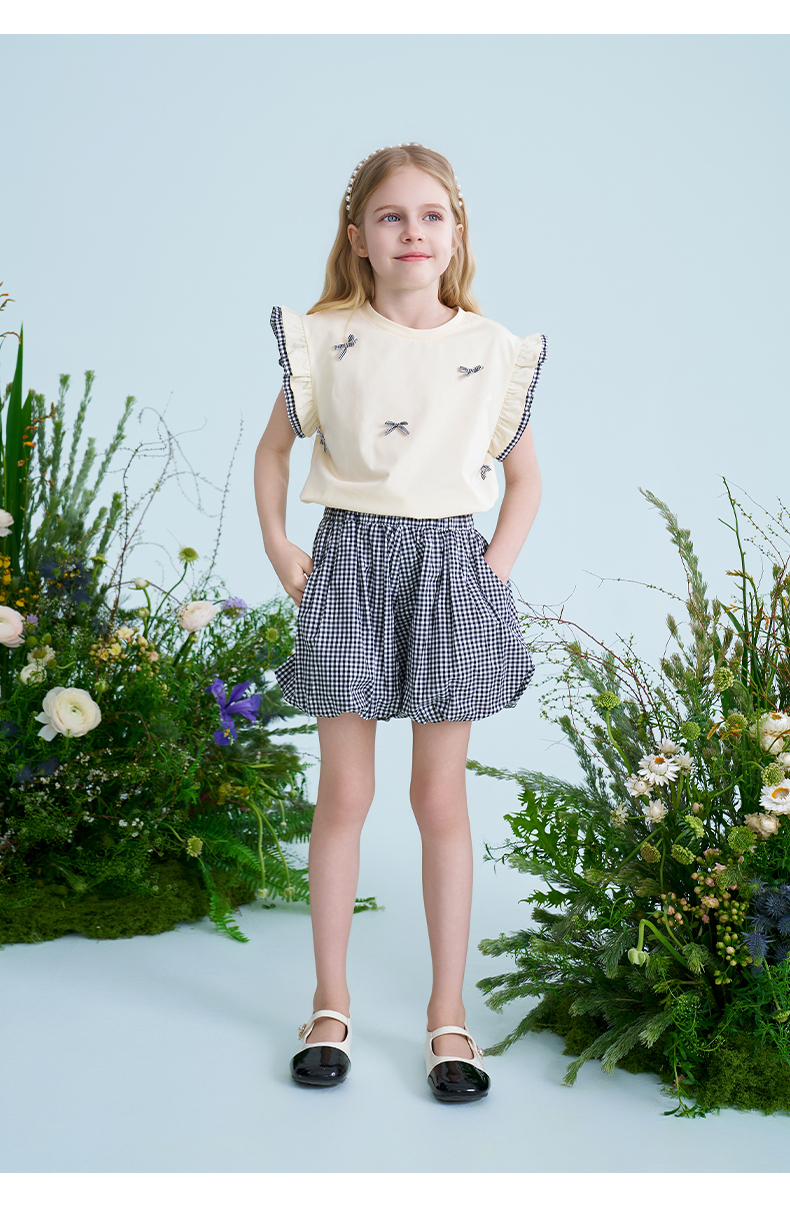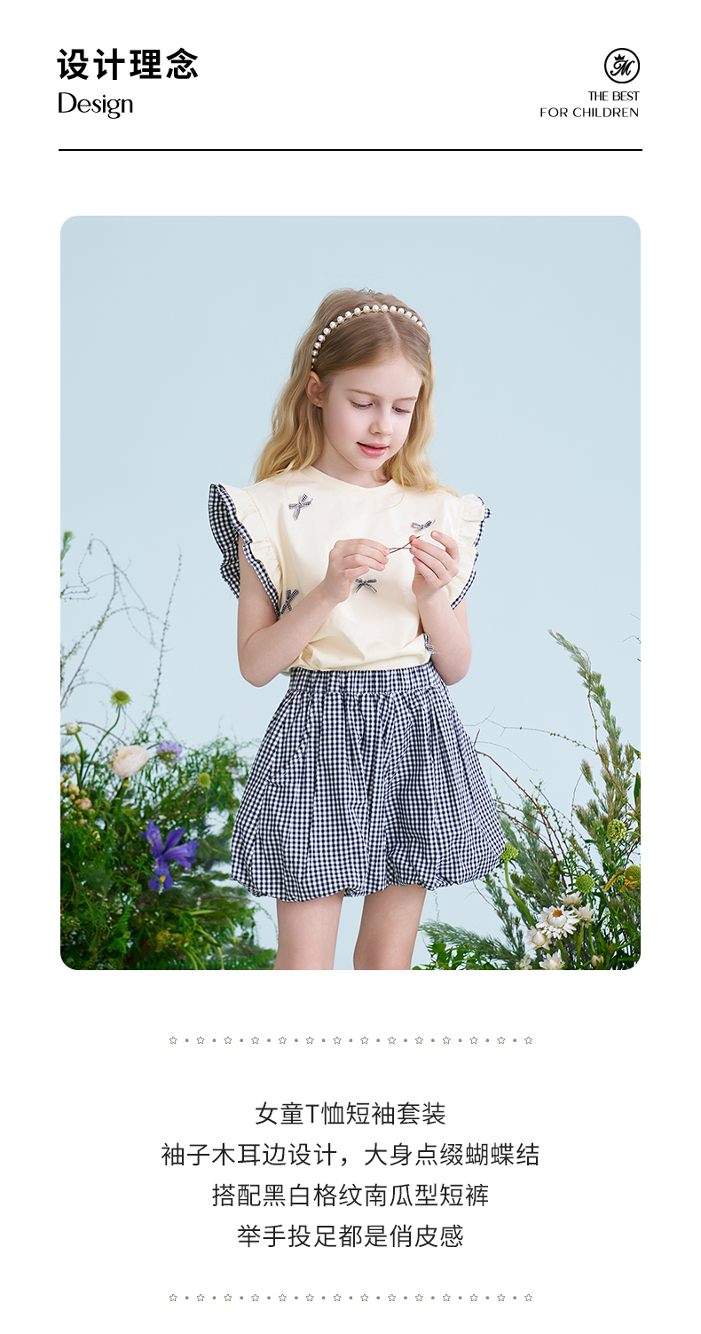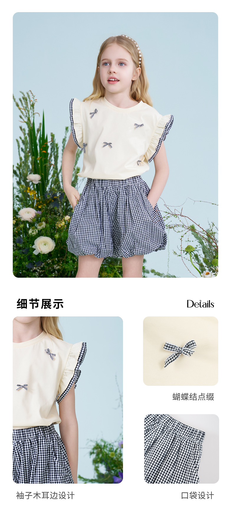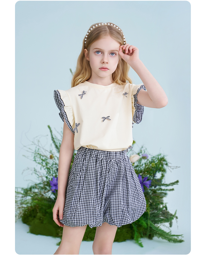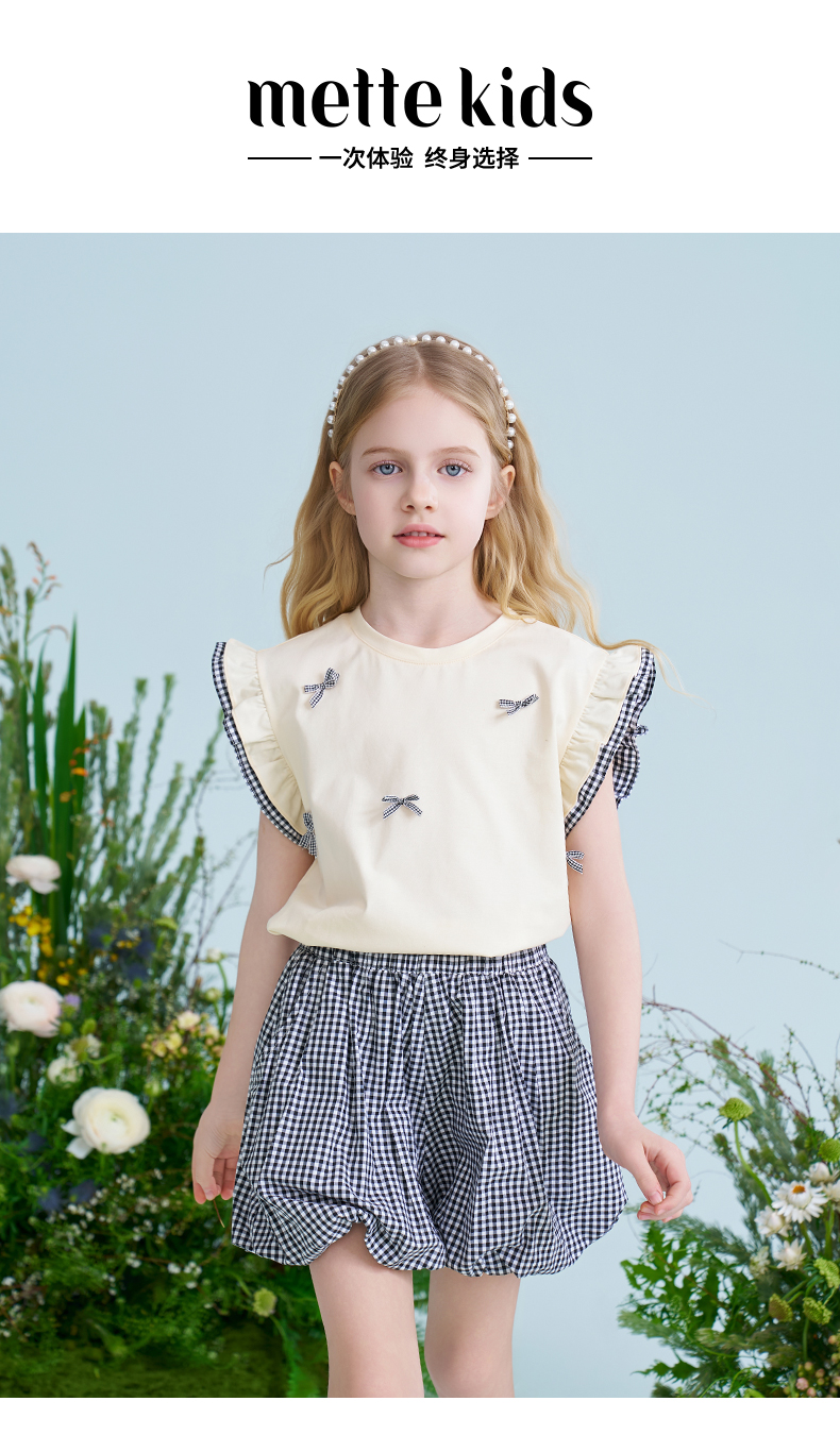 mettekids儿童T恤2025夏季新款女童洋气上衣格子短裤中大童套装