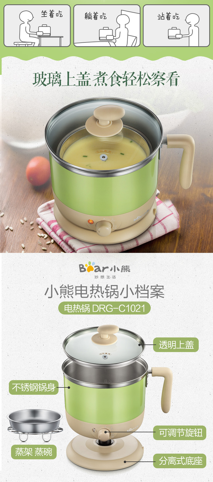 小熊电热锅DRG-C1021多功能电热杯学生宿舍电煮锅煮面电火锅