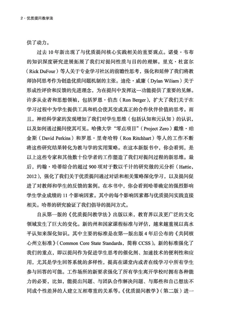大约三年前,作为一名小学校长,我读了《优质提问教学法》(第一版),与一个成功的教师合作阅读、反思和对话。我们的讨论促使我们对使用优质提问促进学生参与方面的思考发生了重大转变。在过去的两年里,我们已经在学区开展合作,使每个校园都能理解和使用《优质提问教学法》。我们的历程包括学习和反思,因为我们致力于提高学生的参与度并实现高水平的学习。《优质提问教学法》(第二版)将使所有教育者都踏上这个历程;其中的研究基础更加严谨,视频示例非常有助于看到提问实践的实际效果。教师在设计提问、考虑学生会如何回答、使用轮流回答方式吸引更多学生的参与,并与学生一起反思学习结果方面变得更加合作、更有目的性。作为一个有25年经验的老教育工作者,看到最成功的资深教师在提高学生学习方面转变他们的思维和实践,这是一种快乐。