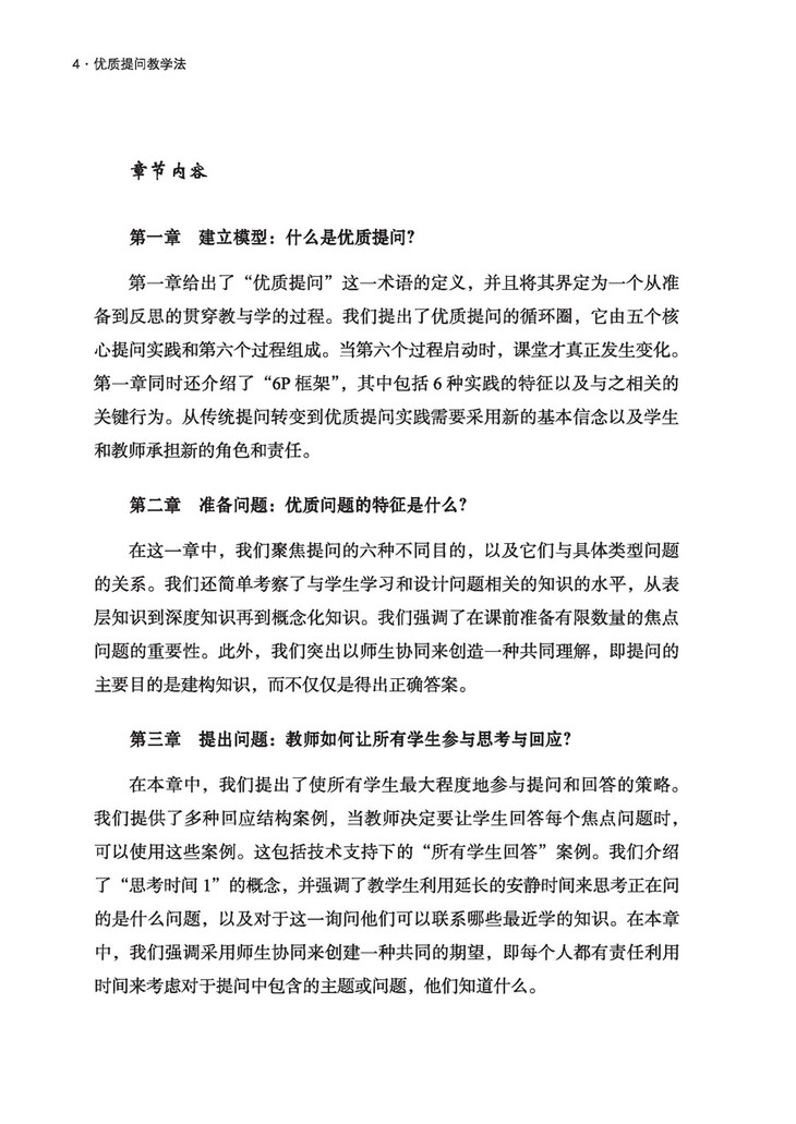 与第一版不同的是,第二版重点探讨了优质提问的“6P框架”,即准备问题(prepare the question)、提出问题(present the question)、促进思考(prompt student thinking)、处理回应(process student response)、打磨实践(polish questioning practices)和师生协同(partner with students)。书中有较多的实例及分析,有助于读者领会和掌握优质提问教学法的精髓。