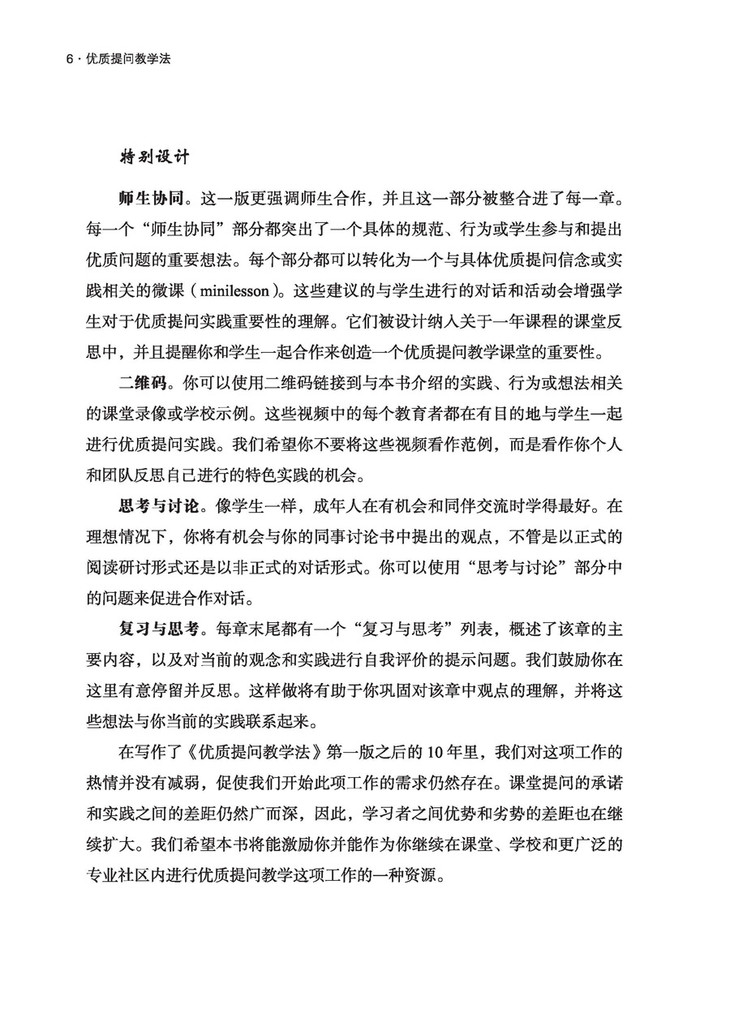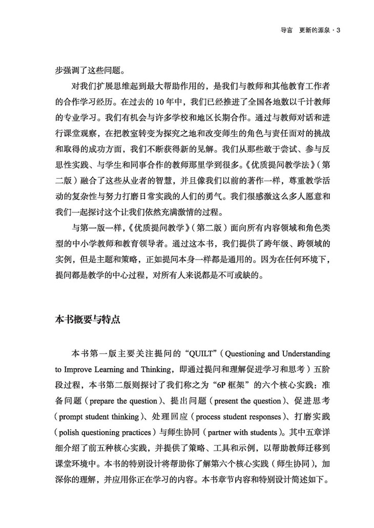 要提出能刺激学生学习和成长欲望、培养学生好奇心的问题,需要学校和课堂文化的彻底改变。“6P框架”为那些想要进行这一历程的教师提供了一张地图,从准备发人深省的问题,到对学生的回答显示出兴趣,再到与学生进行根本的合作。第二版的特别之处在于,包括了与课堂提问示例视频相关的二维码和体现在整本书中的“师生协同”建议,为教育工作者提供了将“6P框架”纳入备课和课堂教学的具体方法。优质提问教学法中包含的基于研究的策略、有用又有效的步骤以及富有洞见的提示,提供了通过优质提问促进学生思考的方法。