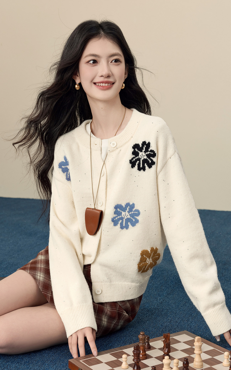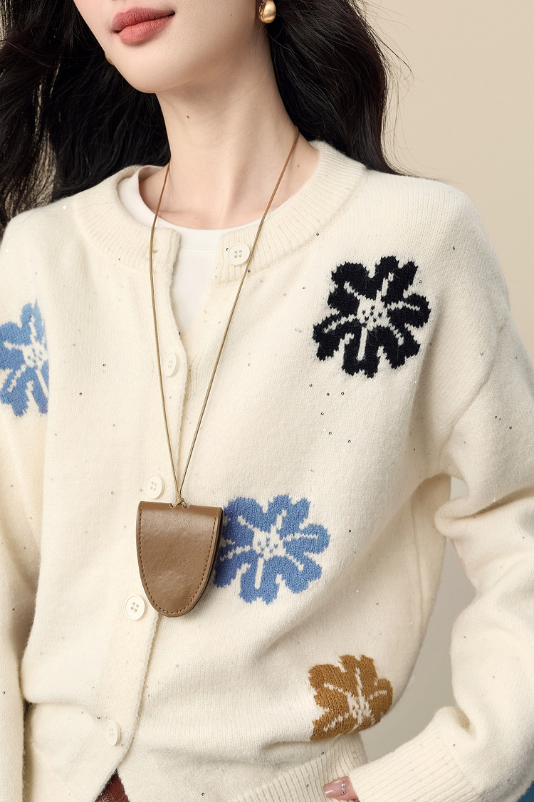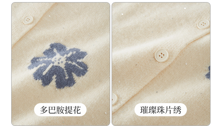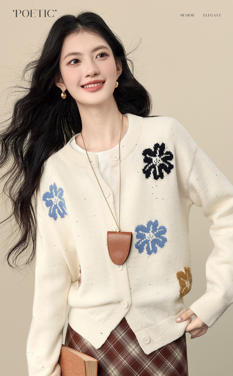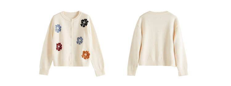 【12/17新品】熙世界独特漂亮珠片绣花朵毛衣女短外套秋冬圆领长袖软糯针织开衫