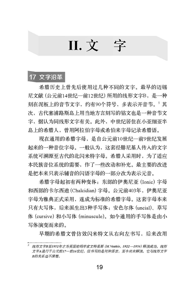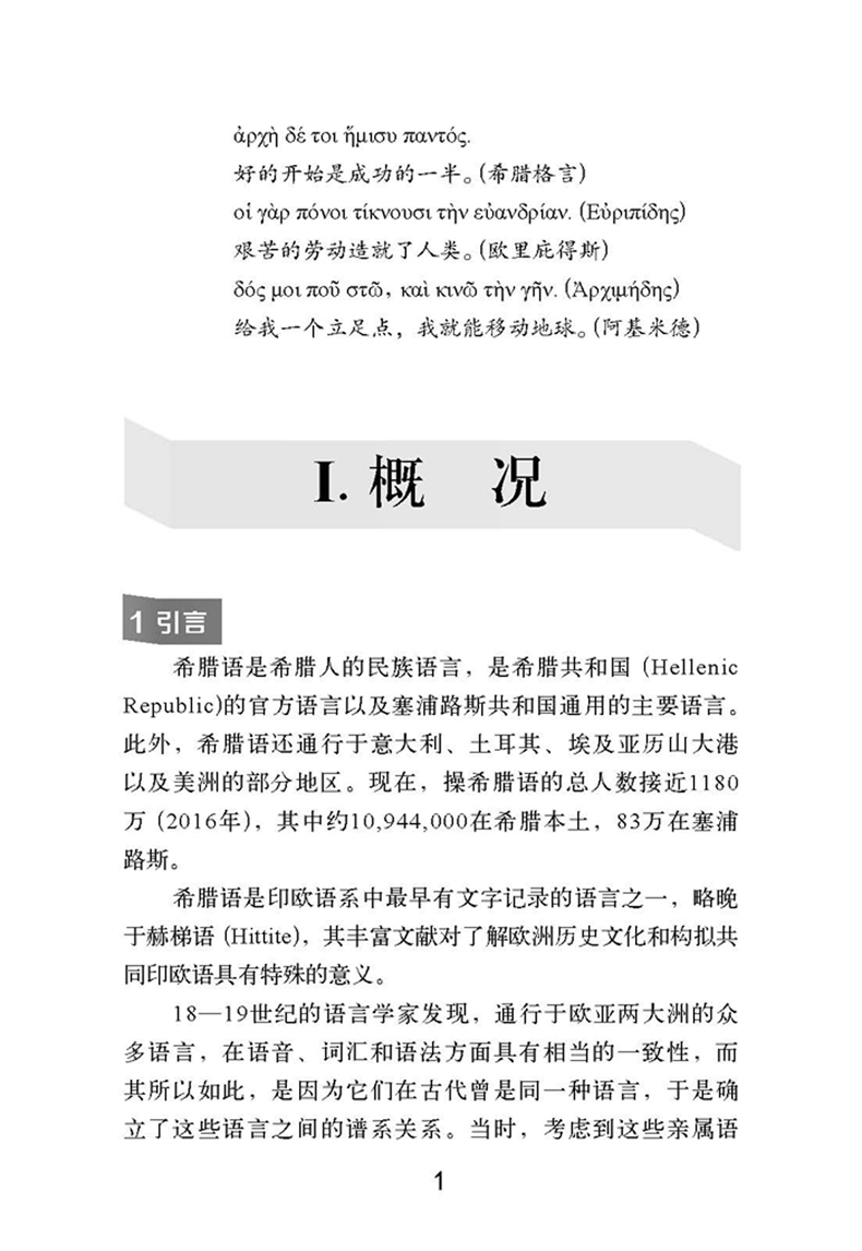 书中在概述印欧语系的基础上,介绍了希腊语的历史背景、文字沿革、语音、形态、构词和句法。每条语法规则都有足够的例证,所有例句都附译文,单词的形式和意义都有注释,有些地方还借用英语来辅助解释。书中凡有关联的内容都注明参见的节码,以便于通读或选读、精读或浏览。书末附有现代希腊语简介(见附录Ⅱ)、术语索引、希腊语词汇索引、汉语—希腊语词汇表以及英语词汇索引。