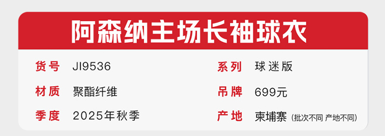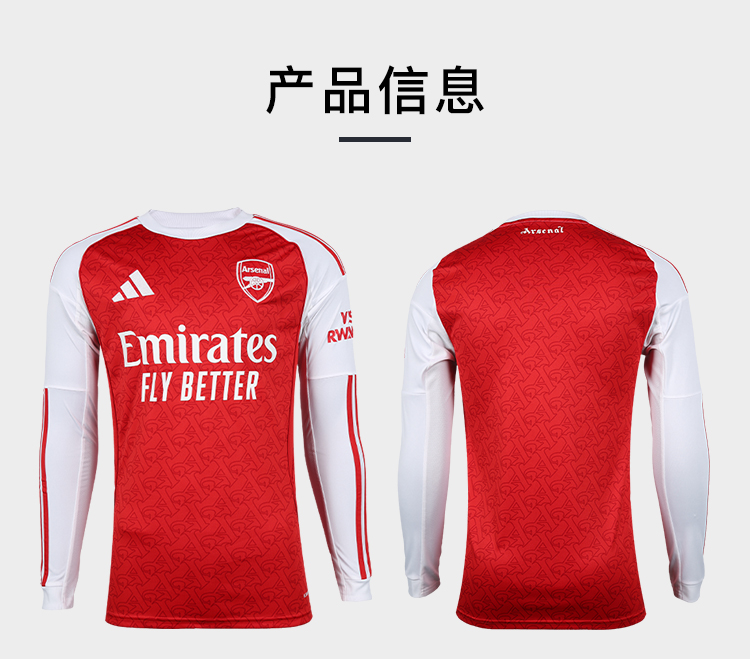 小李子阿迪达斯25/26赛季阿森纳球迷版主场长袖球衣成人男JI9536