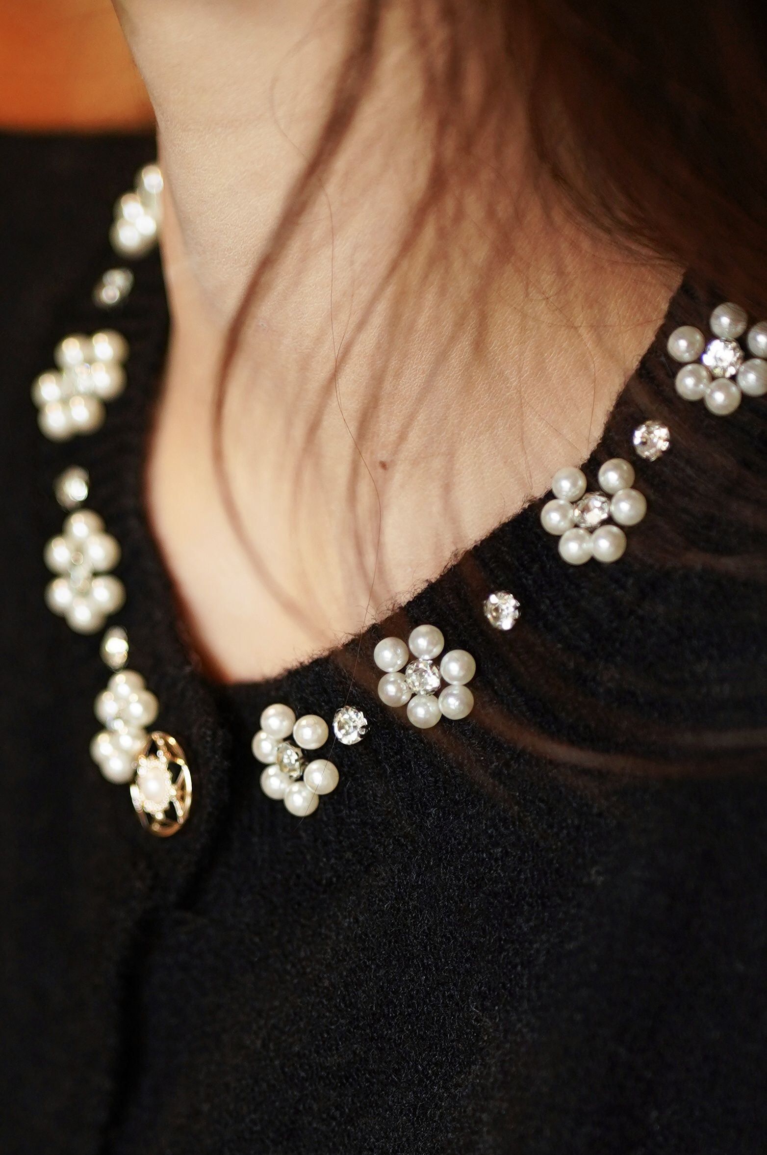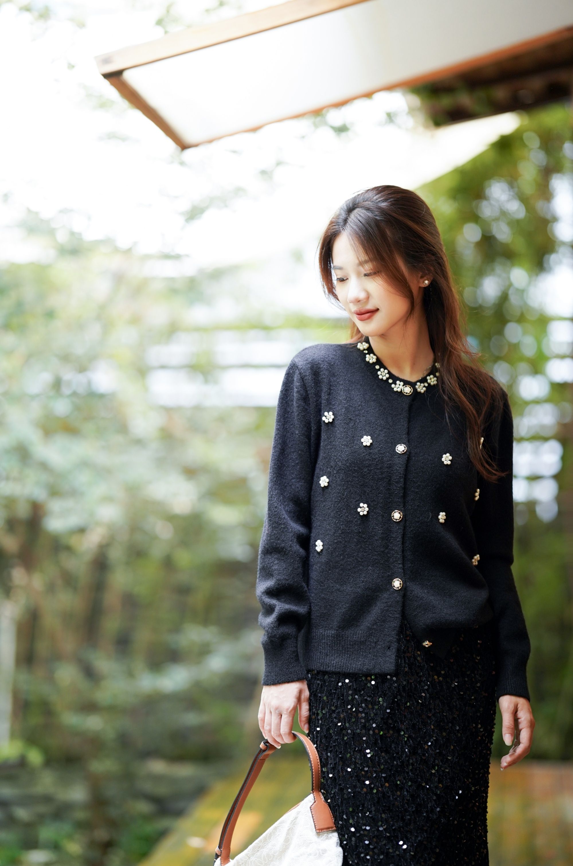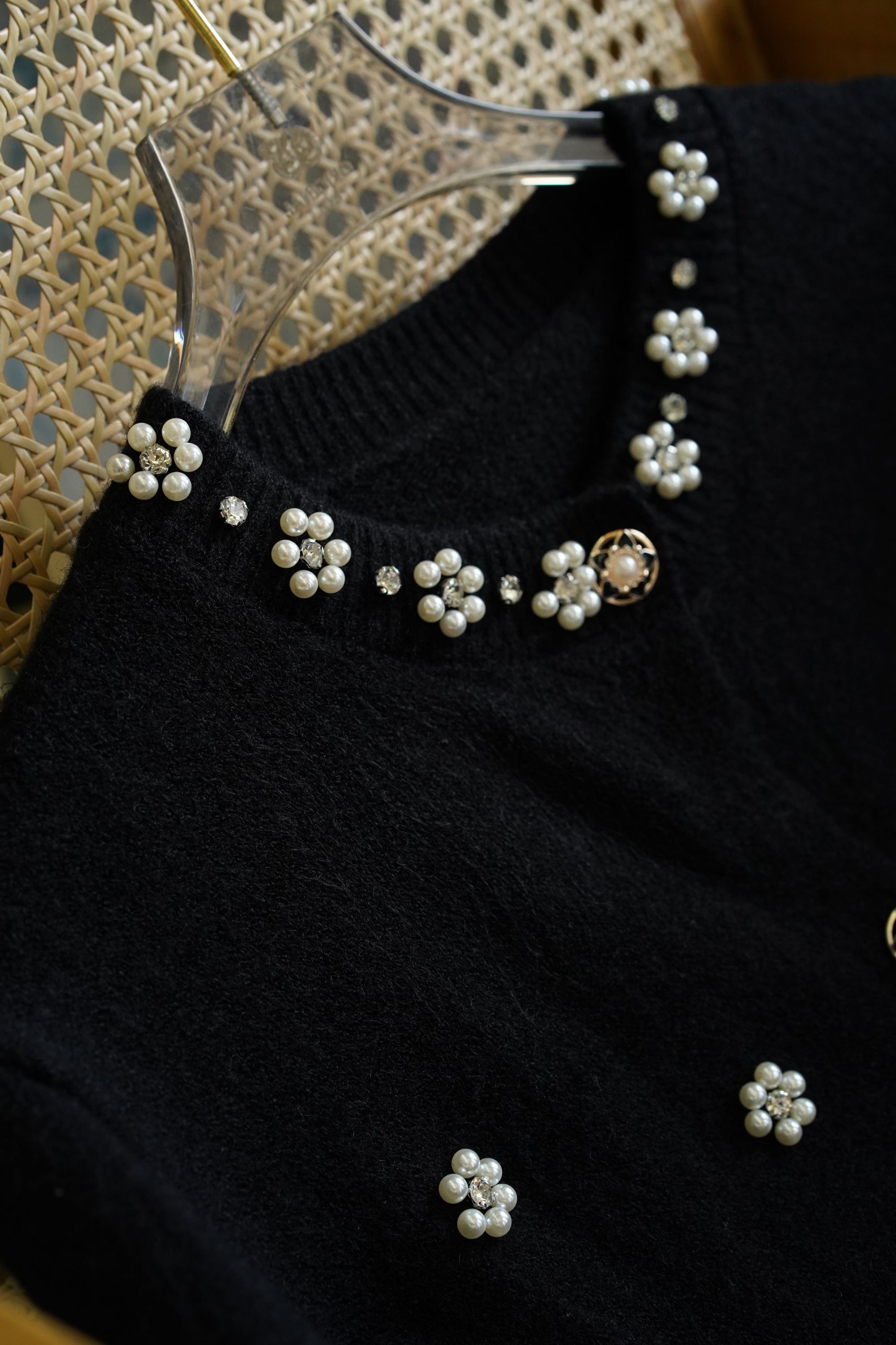惊艳全场的黑色钉珠钻石高定开衫‼️‼️花朵样式钉珠【LONGNVFAIR 黑色珍珠钻石钉珠针织开衫】超显贵气‼️工艺感拉满了!还原香奶奶中古感~