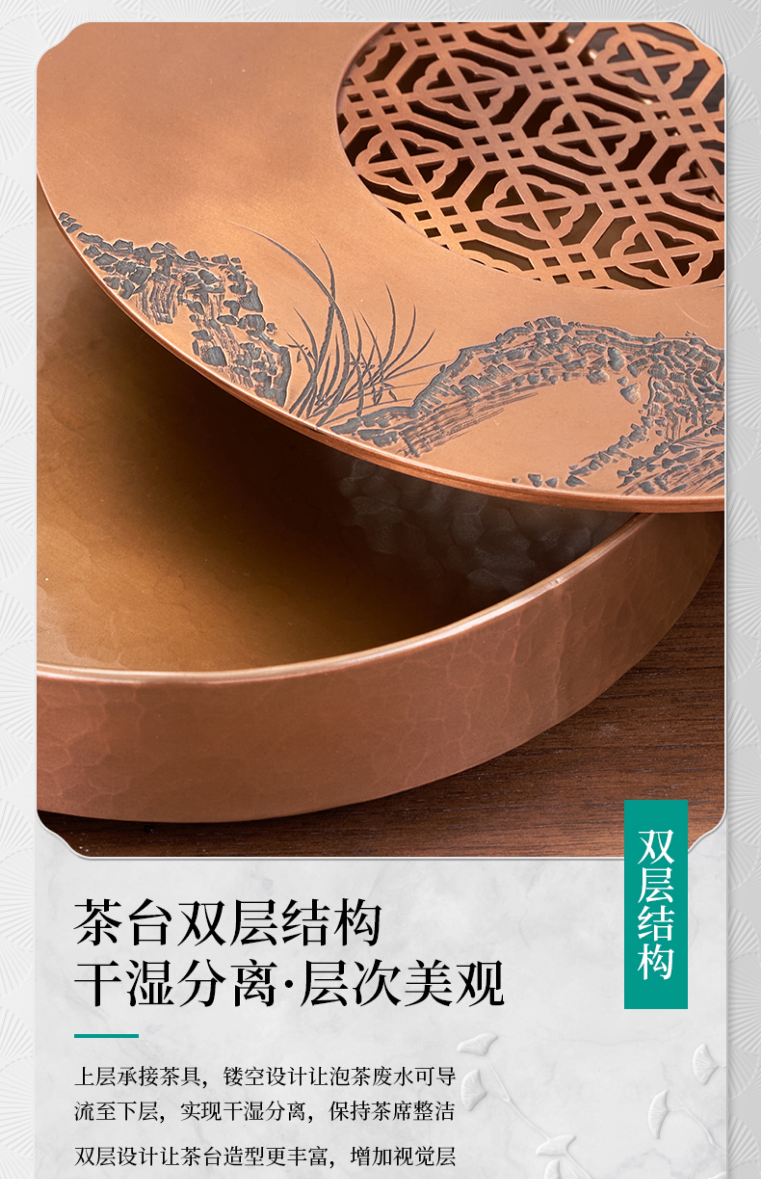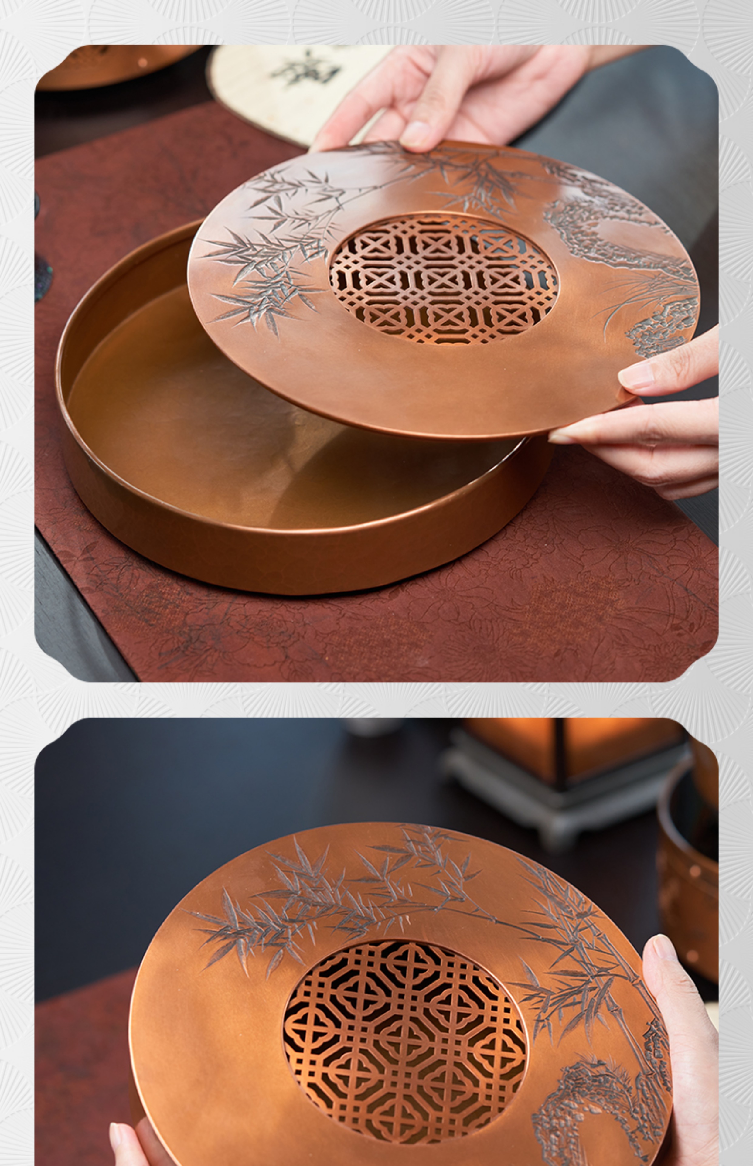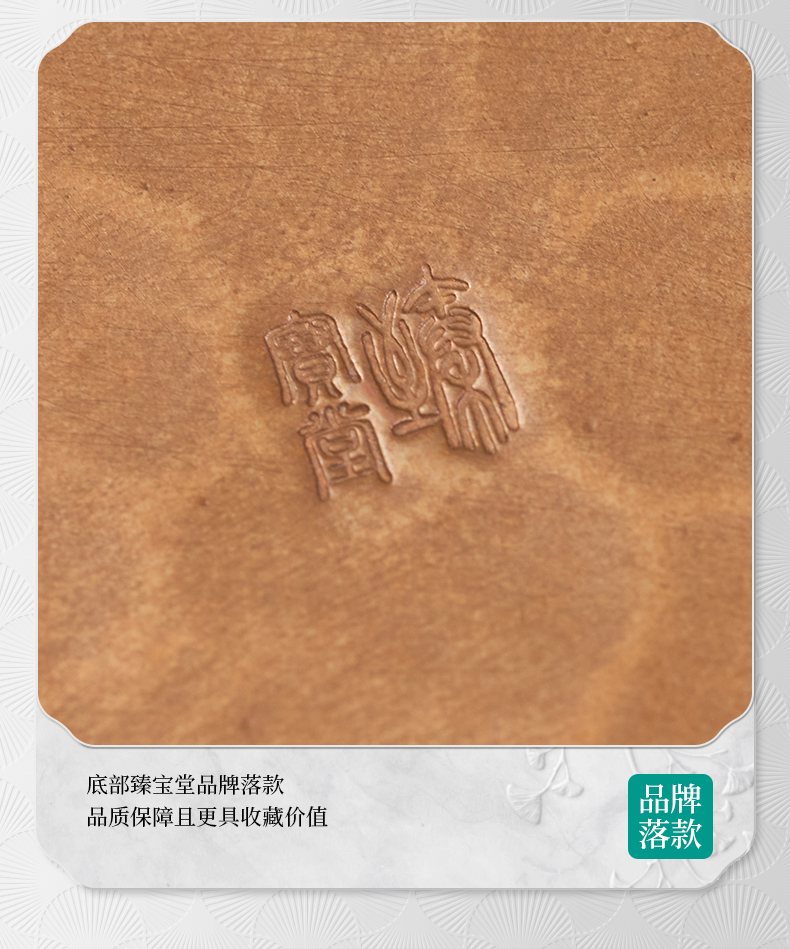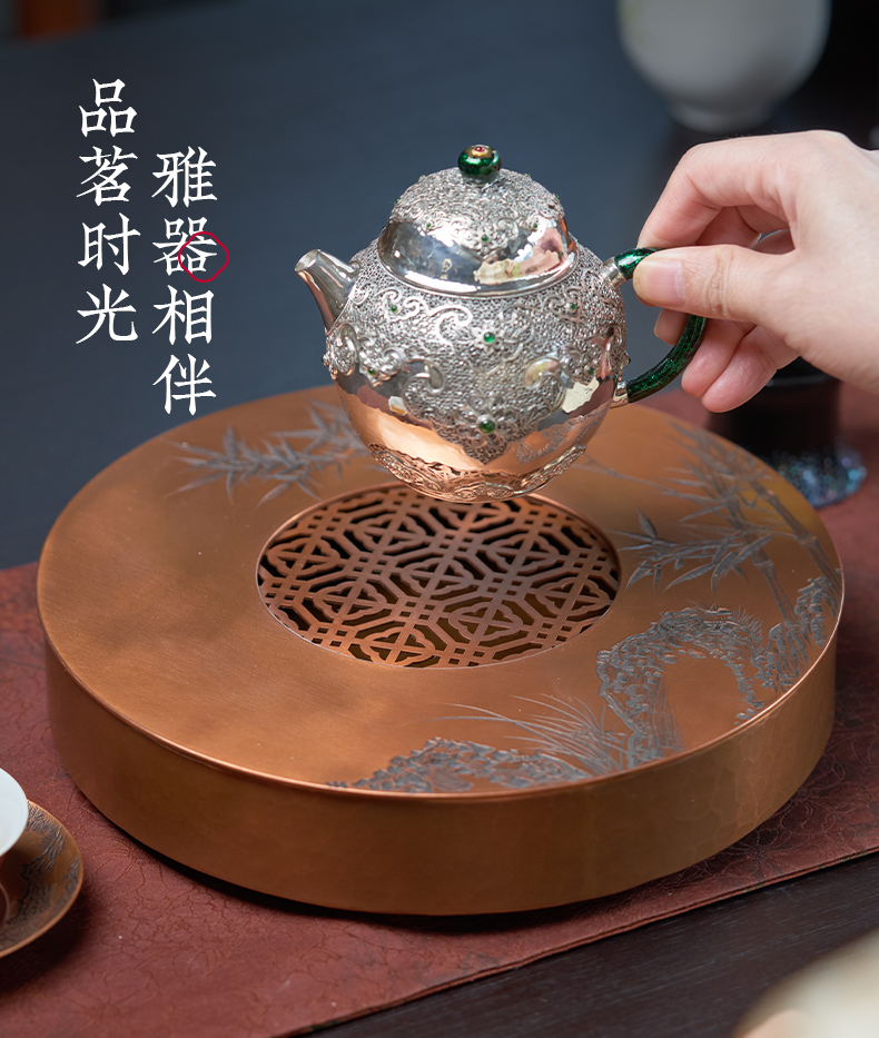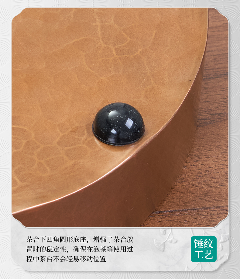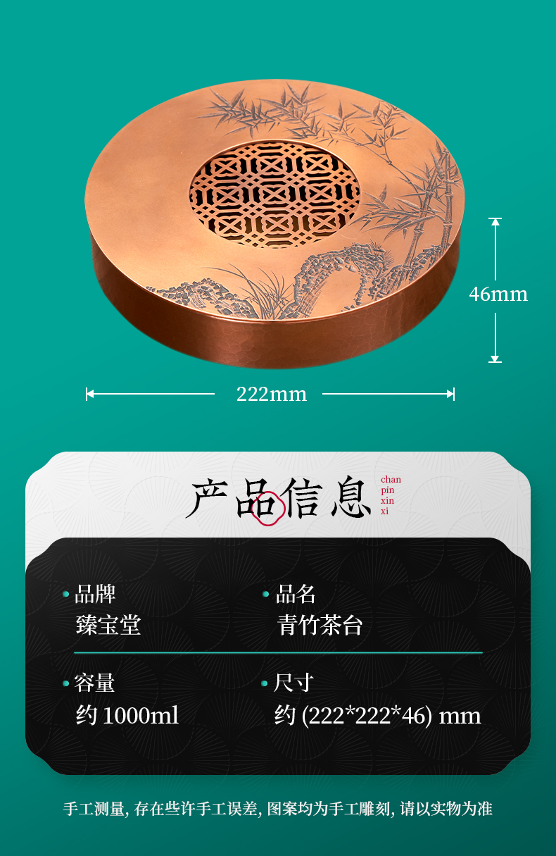 【样品特惠7折,仅1件,无货退款】臻宝堂茶台圆形铜干泡台纯手工錾刻青竹小号茶盘储水养壶茶具配件青竹茶台