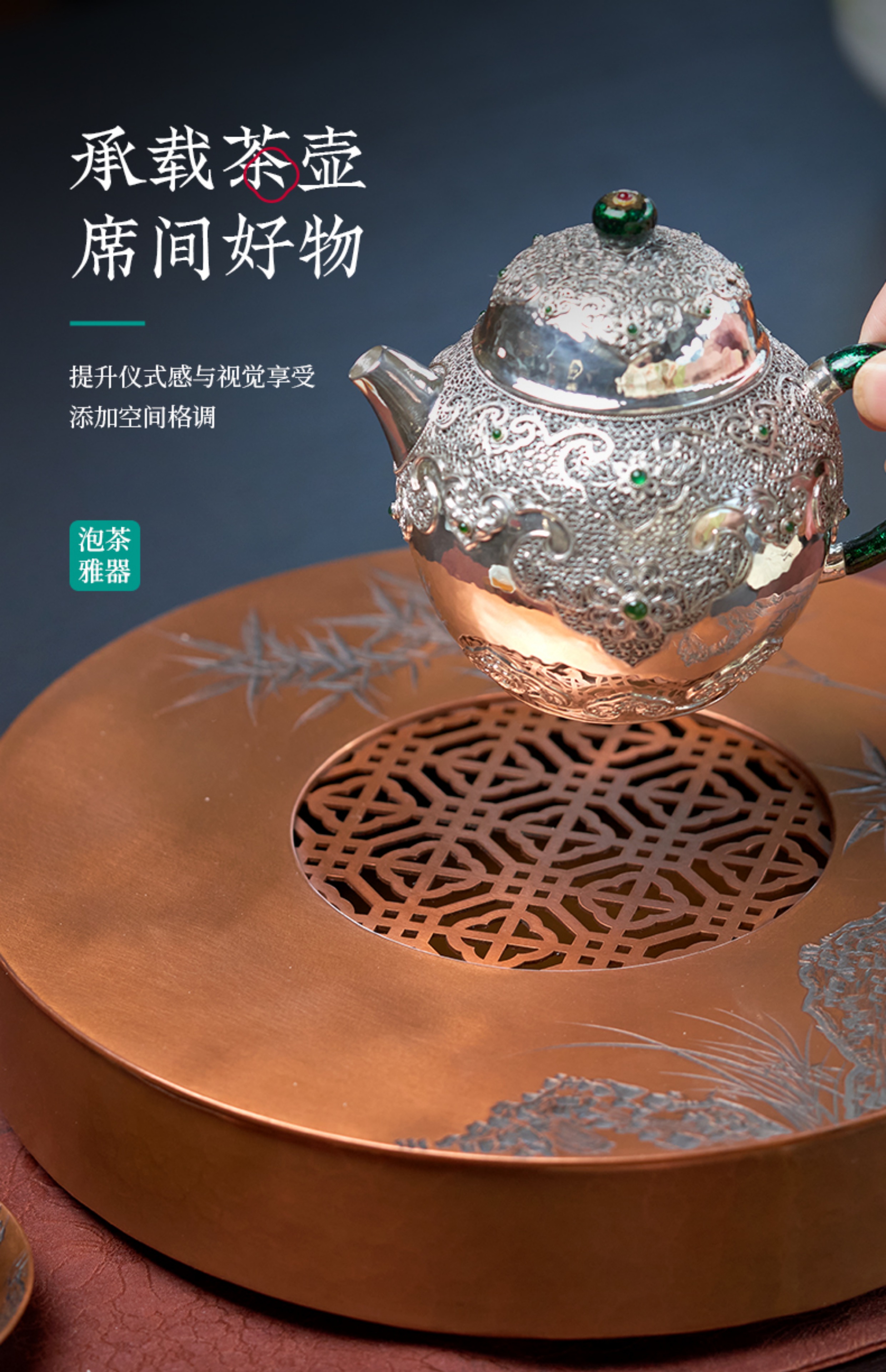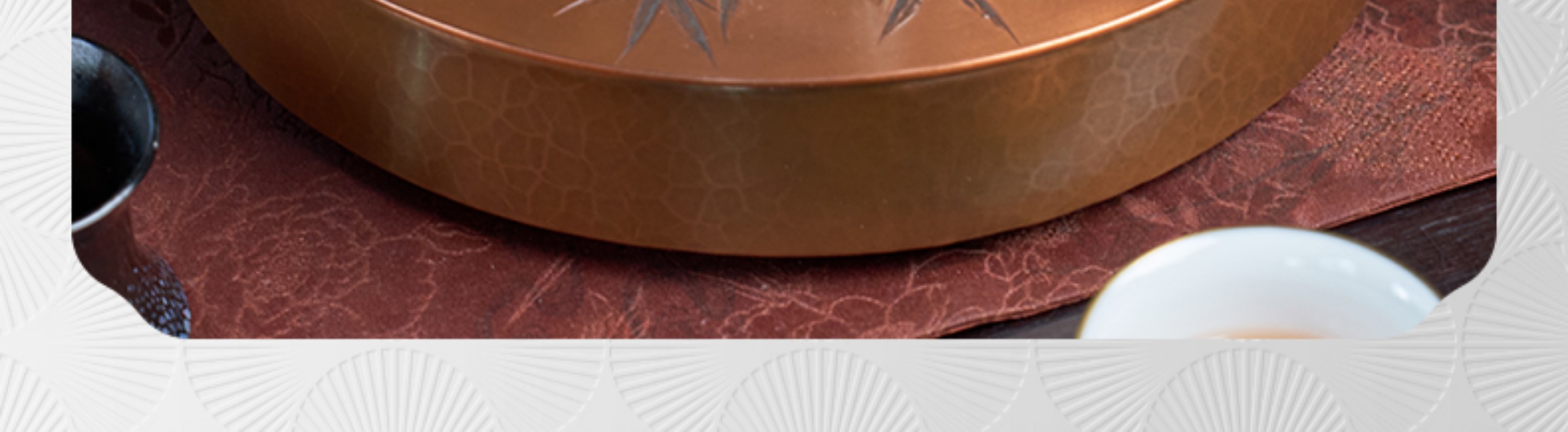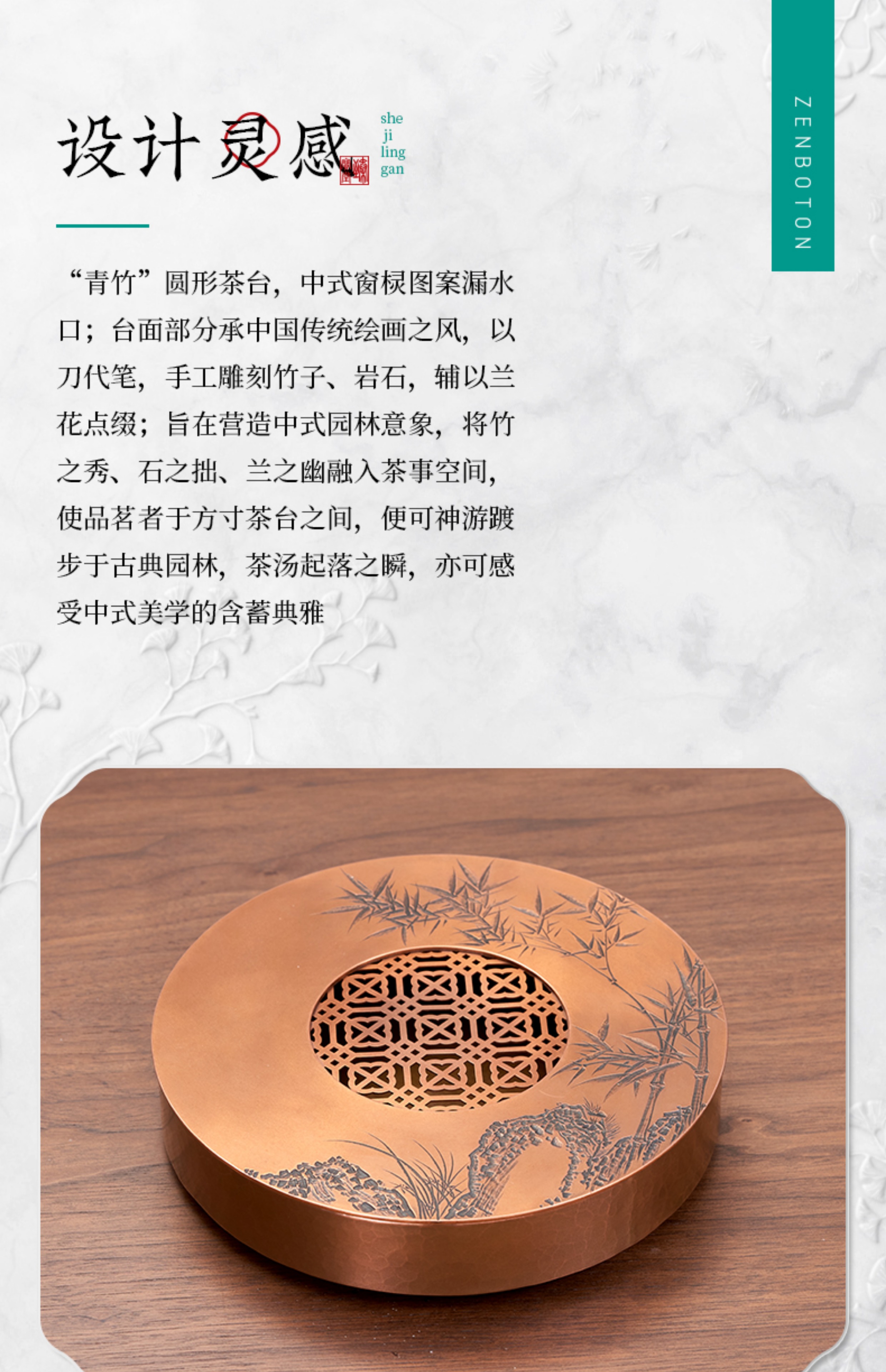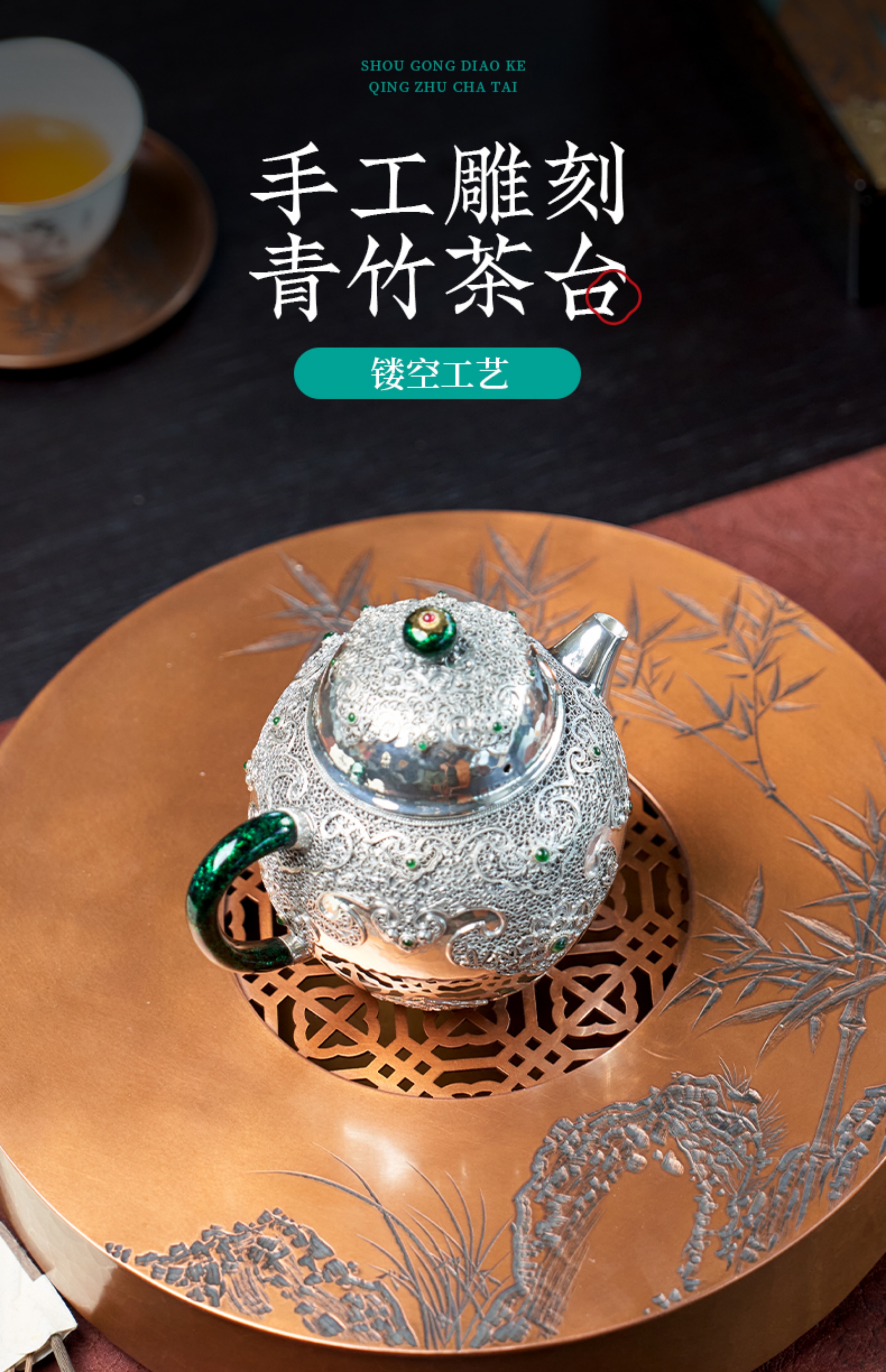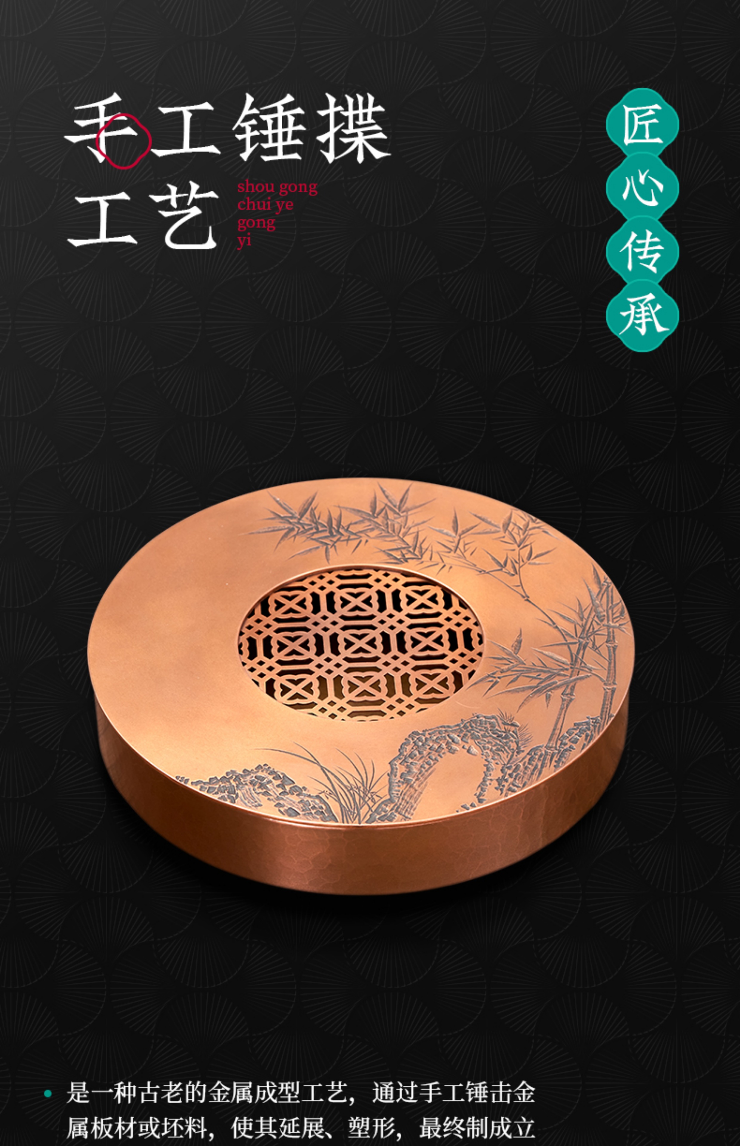 【样品特惠7折,仅1件,无货退款】臻宝堂茶台圆形铜干泡台纯手工錾刻青竹小号茶盘储水养壶茶具配件青竹茶台