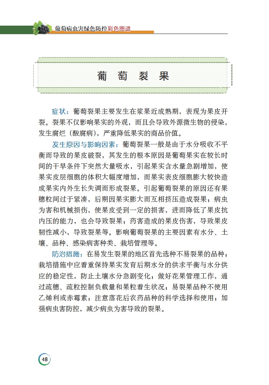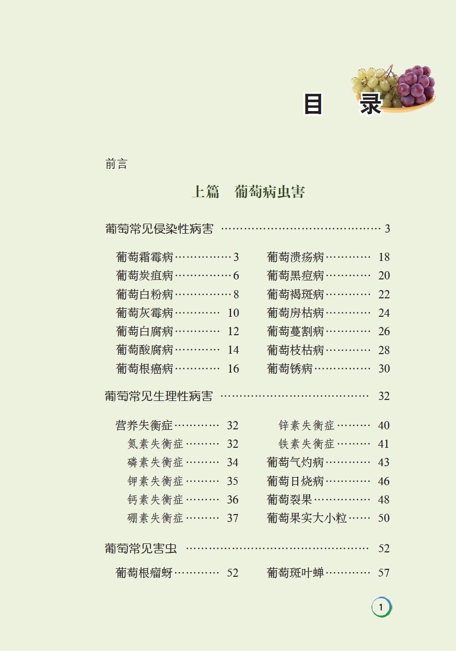 本书内容分上、下两篇,上篇为葡萄主要病虫害及防治技术,以图文并茂的形式介绍了葡萄生产上的主要病害、害虫及生理性病害的症状识别、发生规律与防治方法。下篇为葡萄病虫害绿色防控技术,主要介绍了农业防控技术、生态调控技术、理化诱控技术、生物防治技术、农药使用技术等,附有葡萄病虫害常用农药等内容。