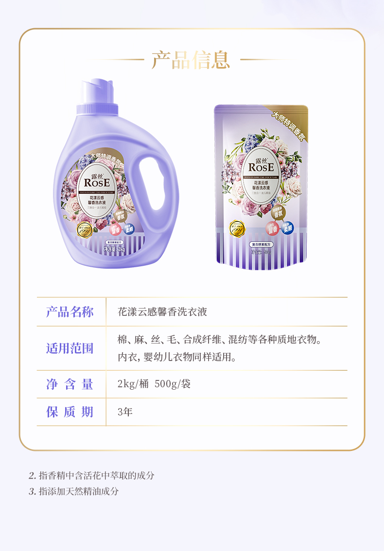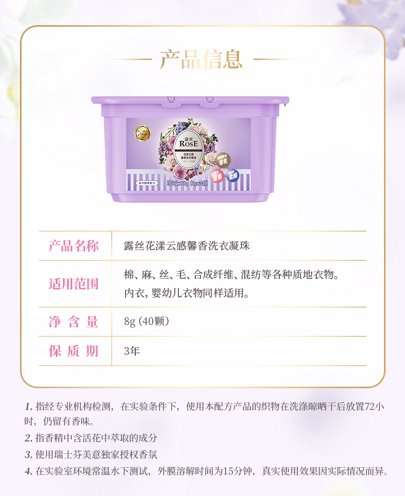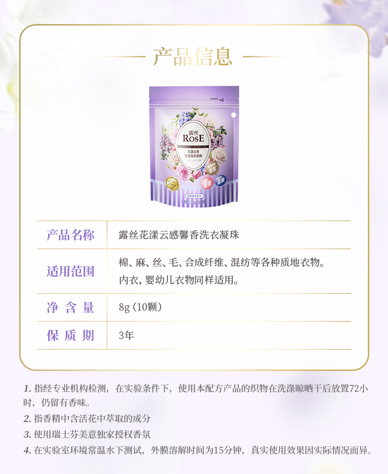 【品名】露丝小花漾云感馨香洗衣液/洗衣凝珠 大师特调香薰 到手22件 植物配方 深层去污 持久留香72h 【规格】2kg/桶,500g/袋,40颗/桶,10颗/袋 【产地】国内 【保质期】3年 【发货包装】独立包装箱 【发货地】浙江 【发货快递】圆通,中通,申通,邮政,韵达等随机发 【不发货区域】新疆、西藏、港澳台 【发货时效】48-72小时,周末节假日顺延 【特别提醒】赠品和正品是分开发货的 |