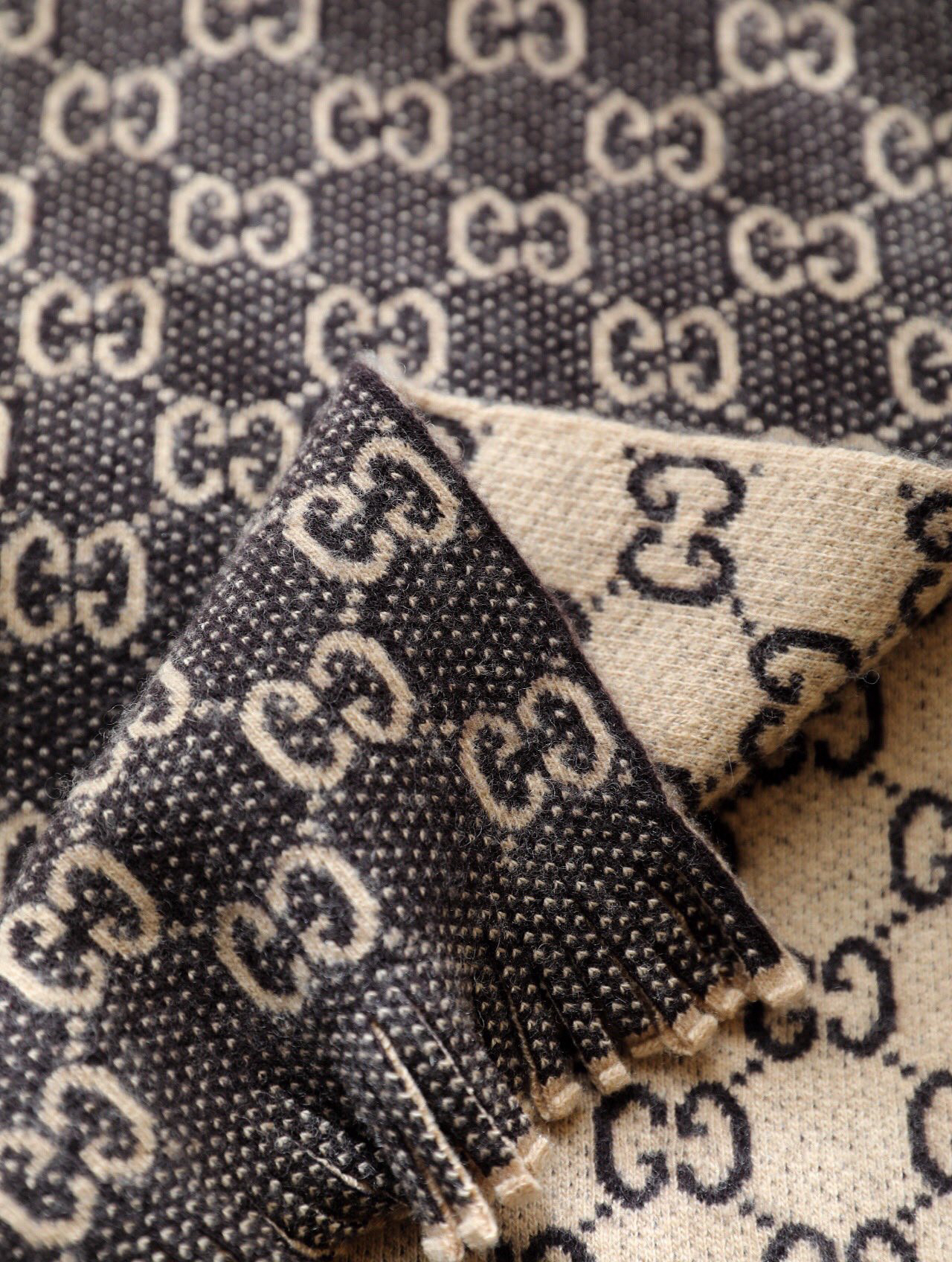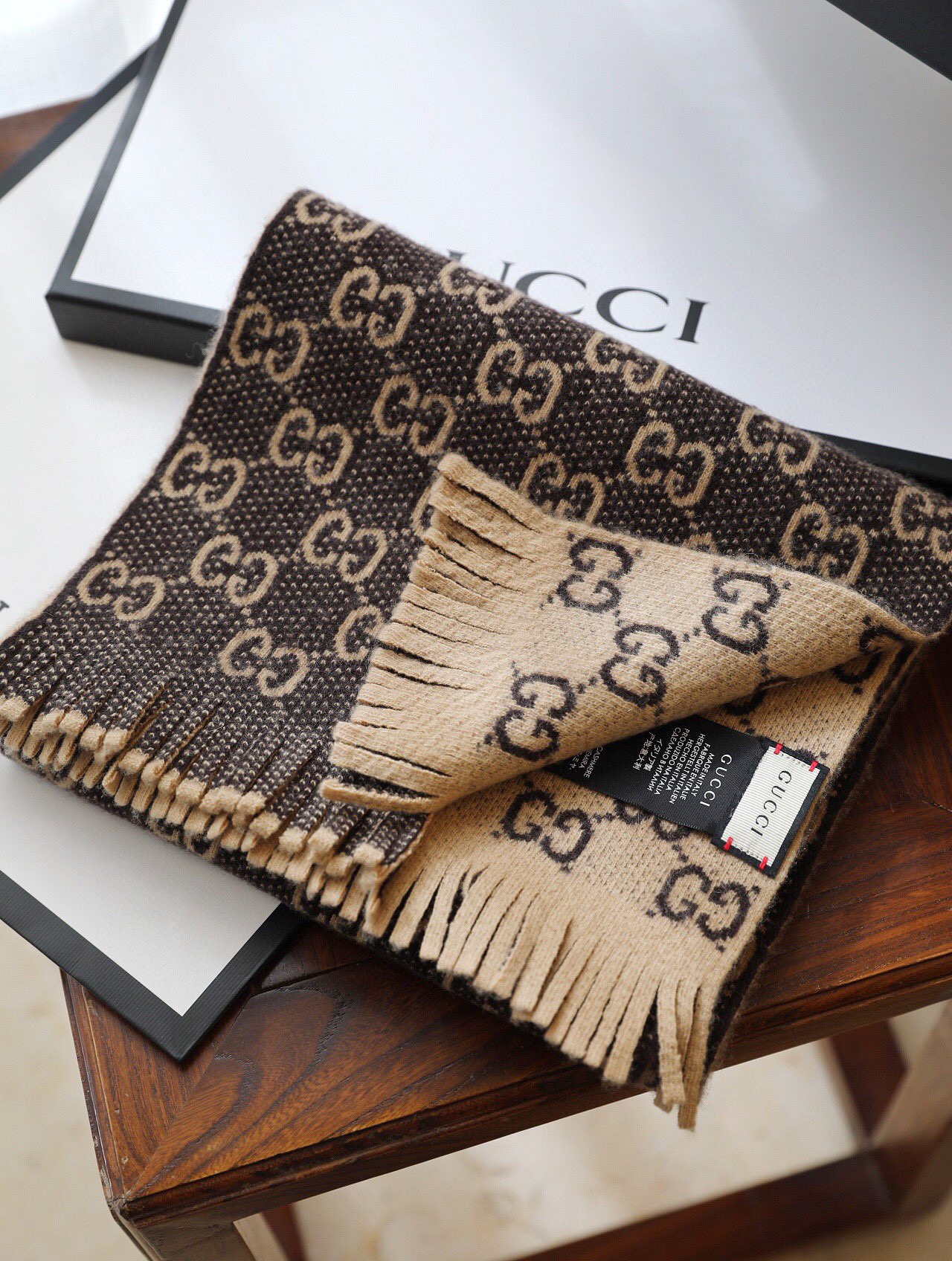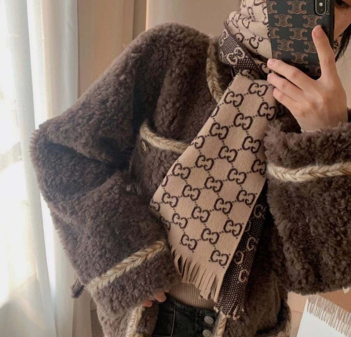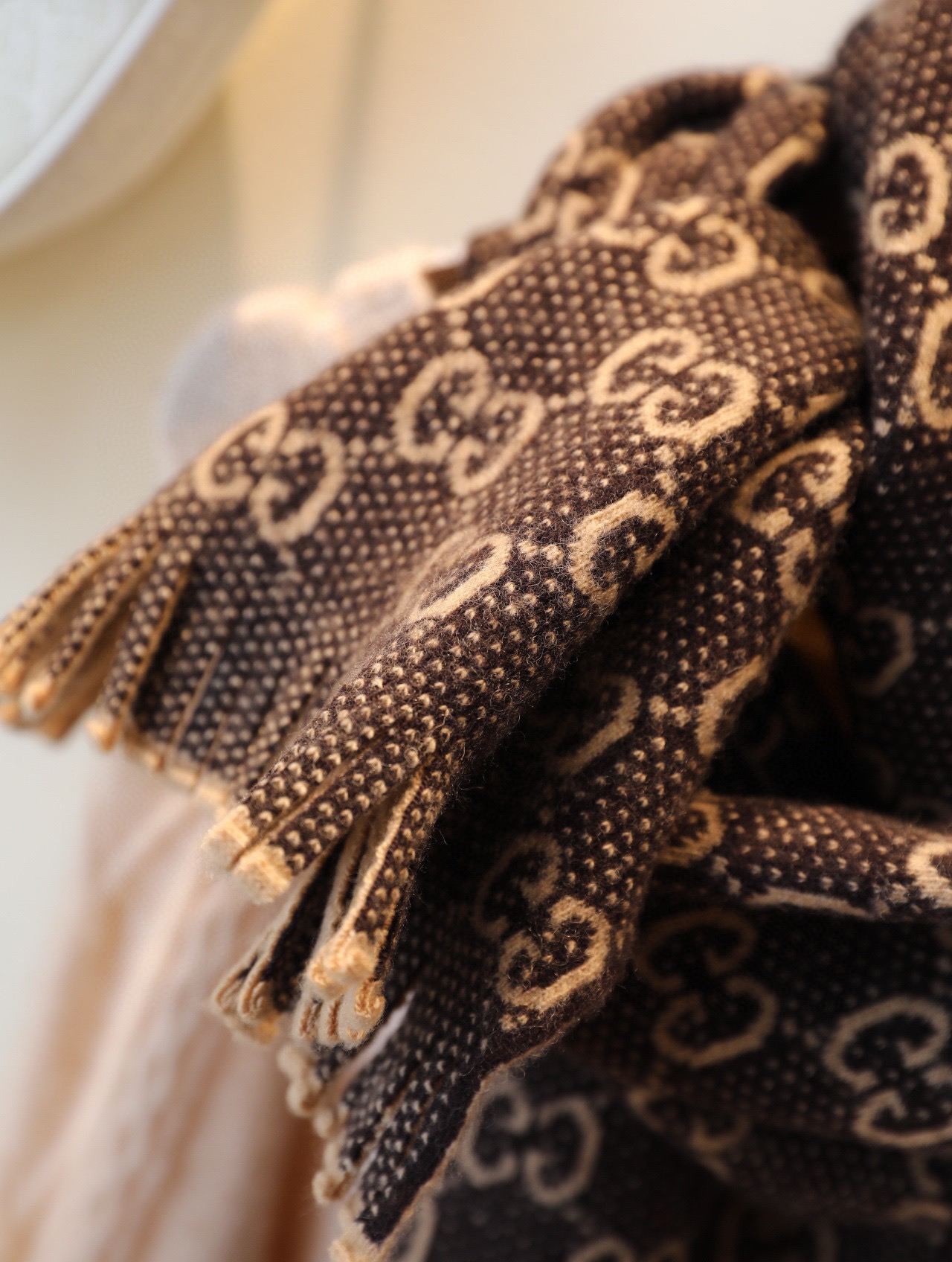 Gucci 双G字母交织图案。棕色GG提花羊毛,流苏饰边