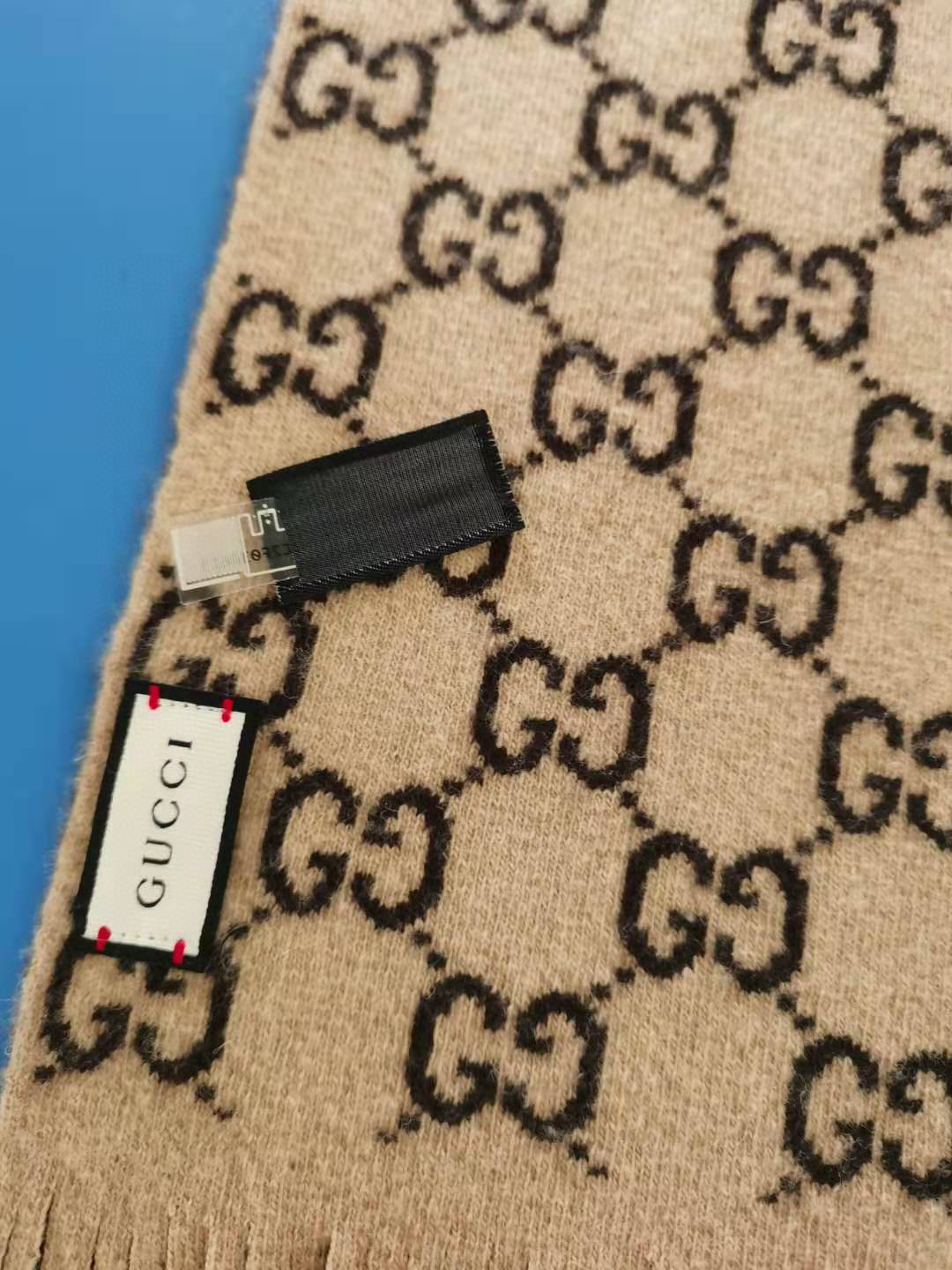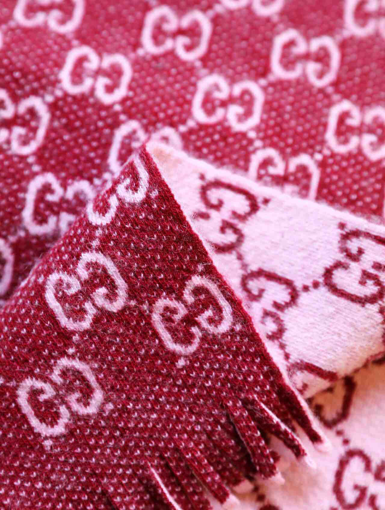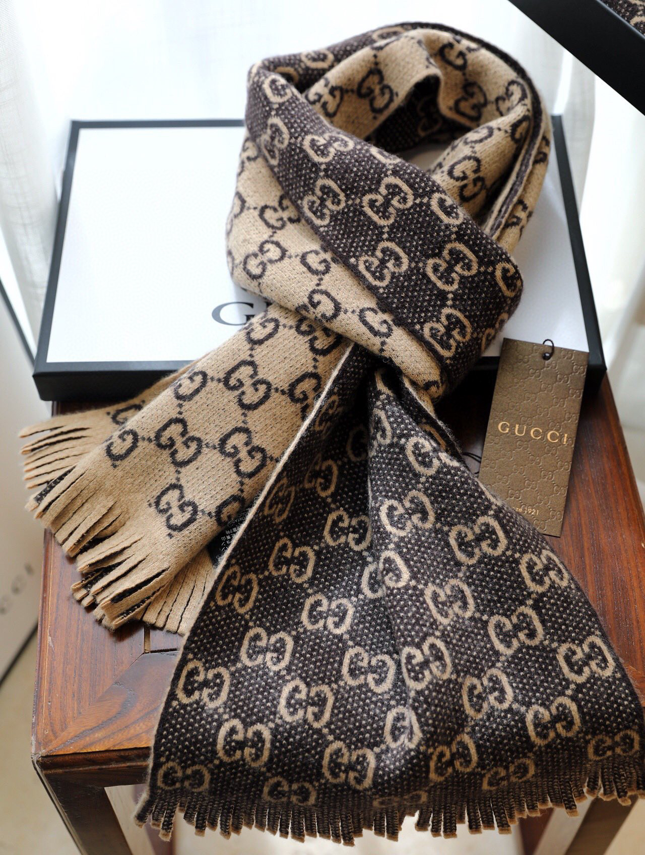 Gucci 双G字母交织图案。棕色GG提花羊毛,流苏饰边