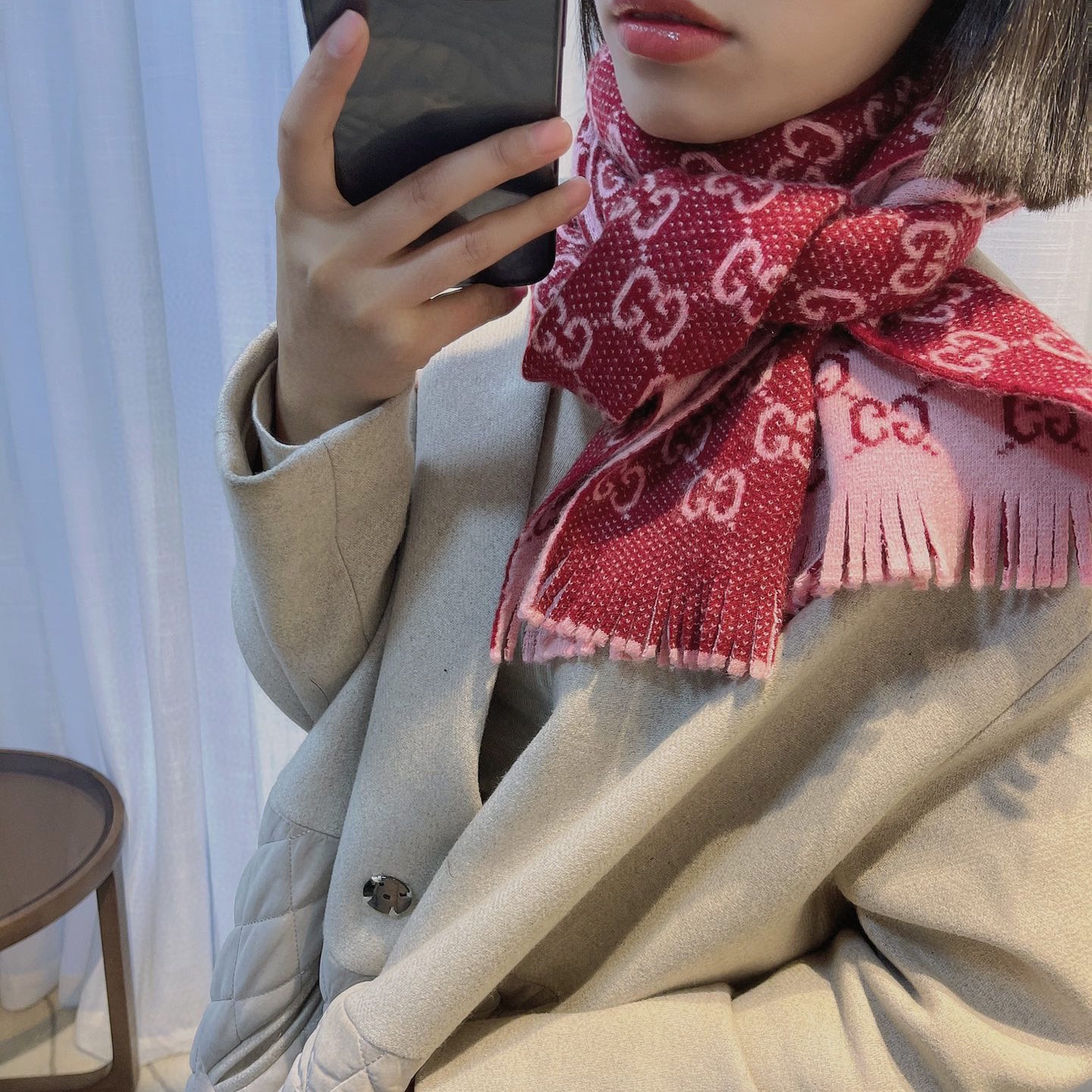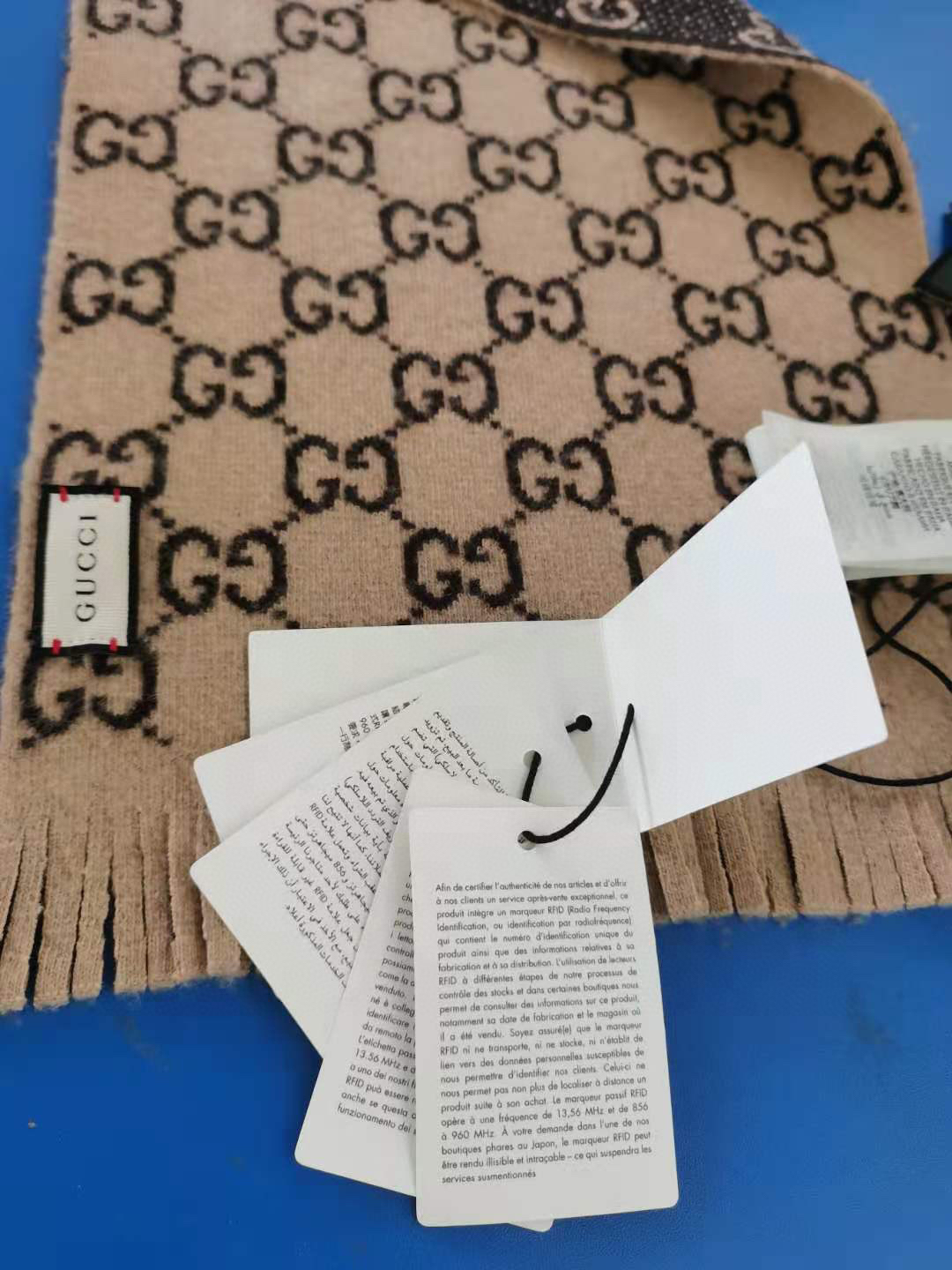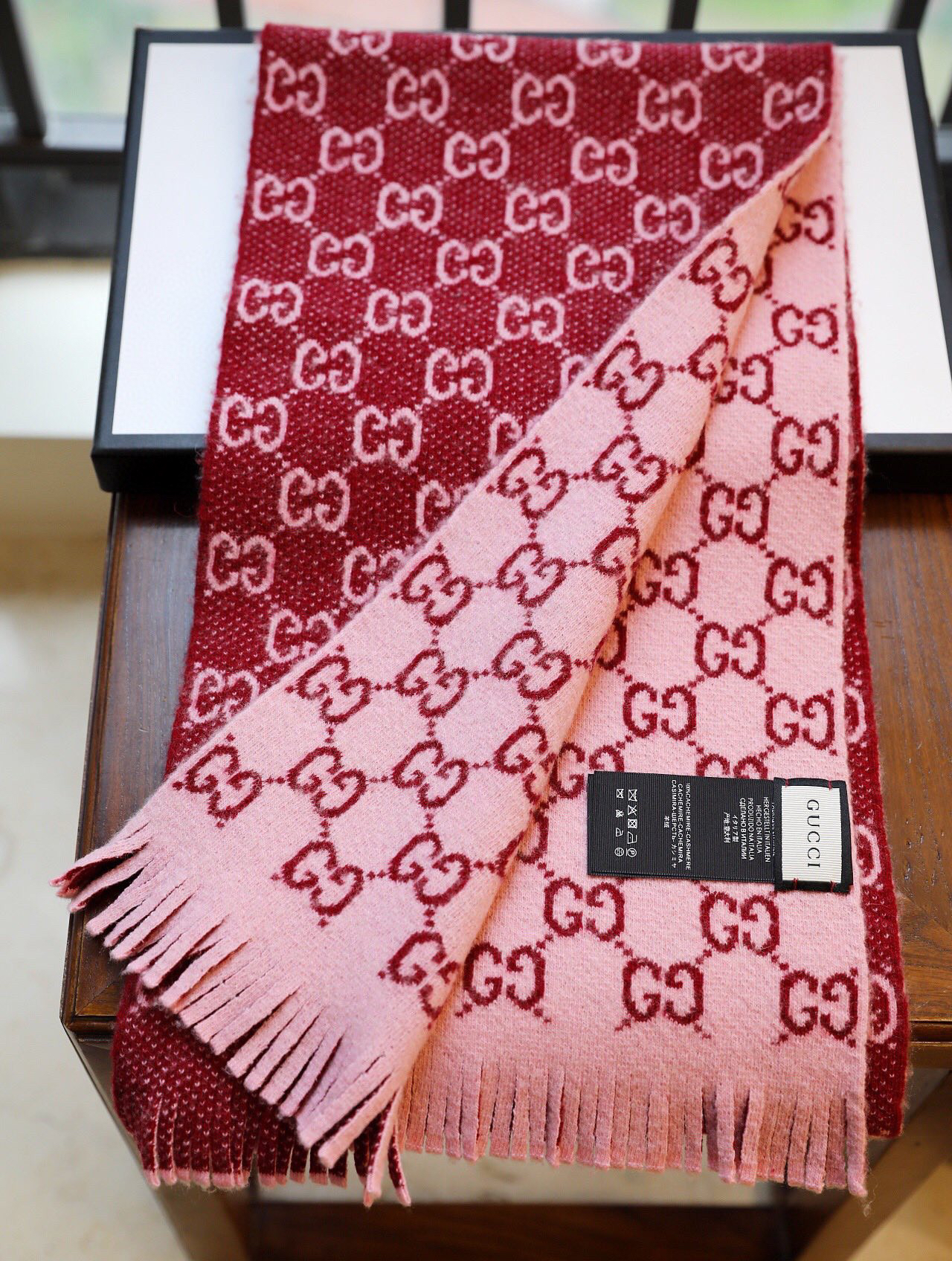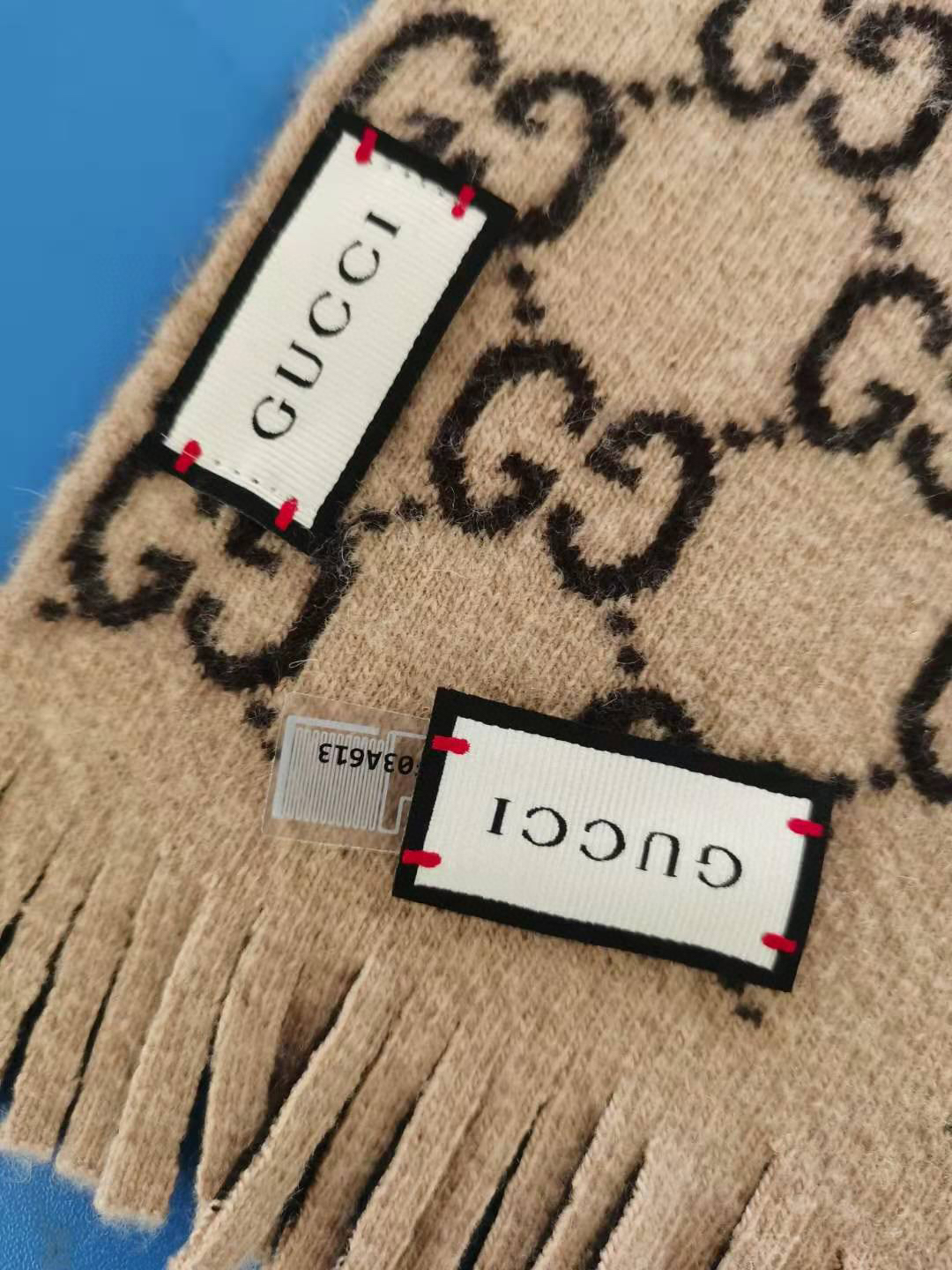 Gucci 双G字母交织图案。棕色GG提花羊毛,流苏饰边