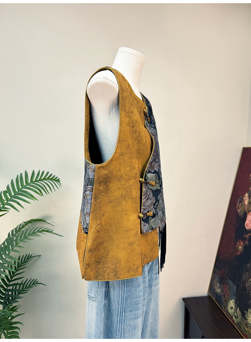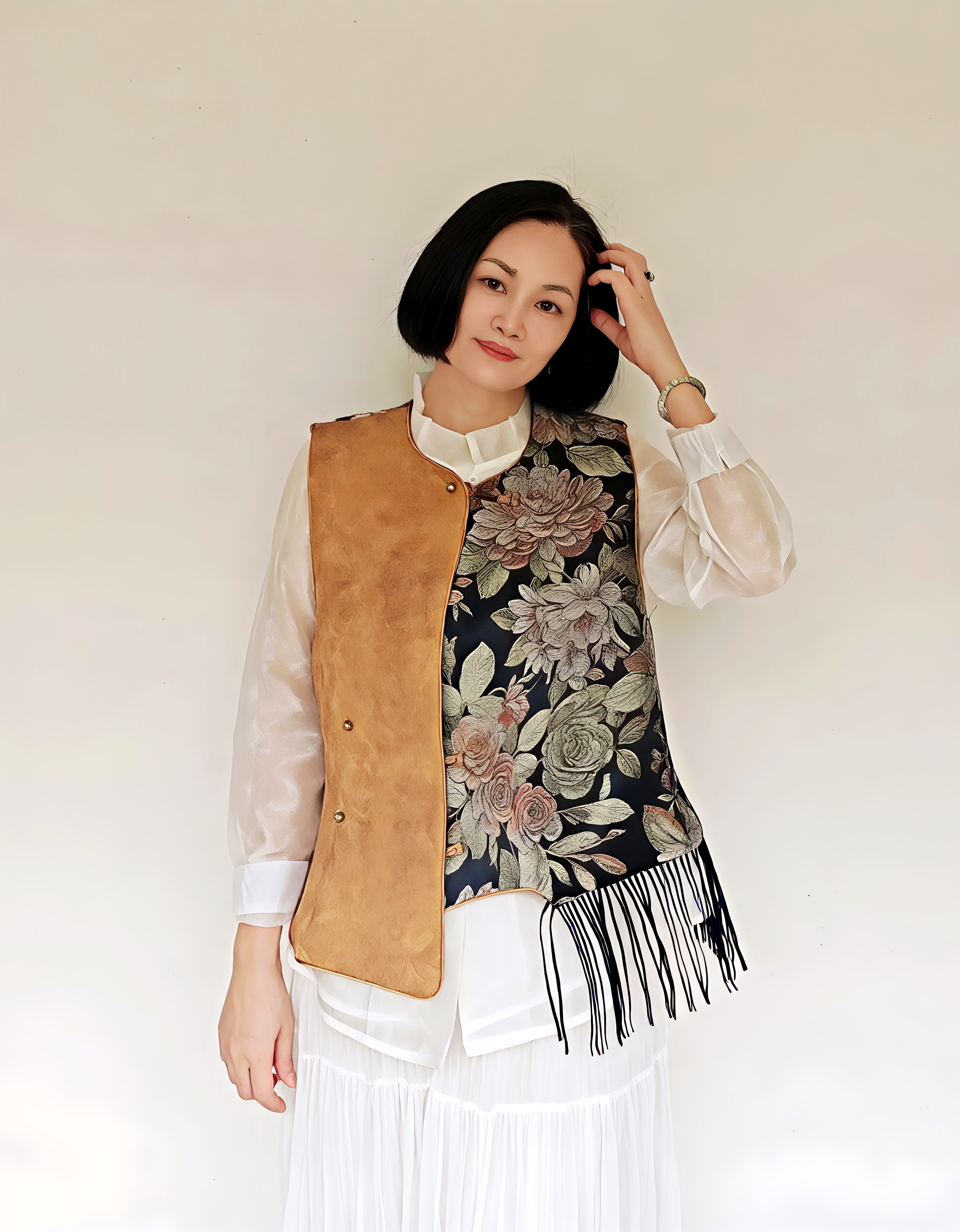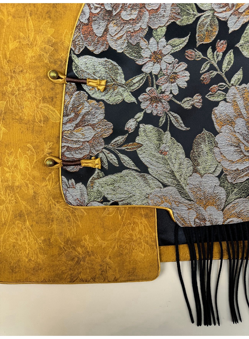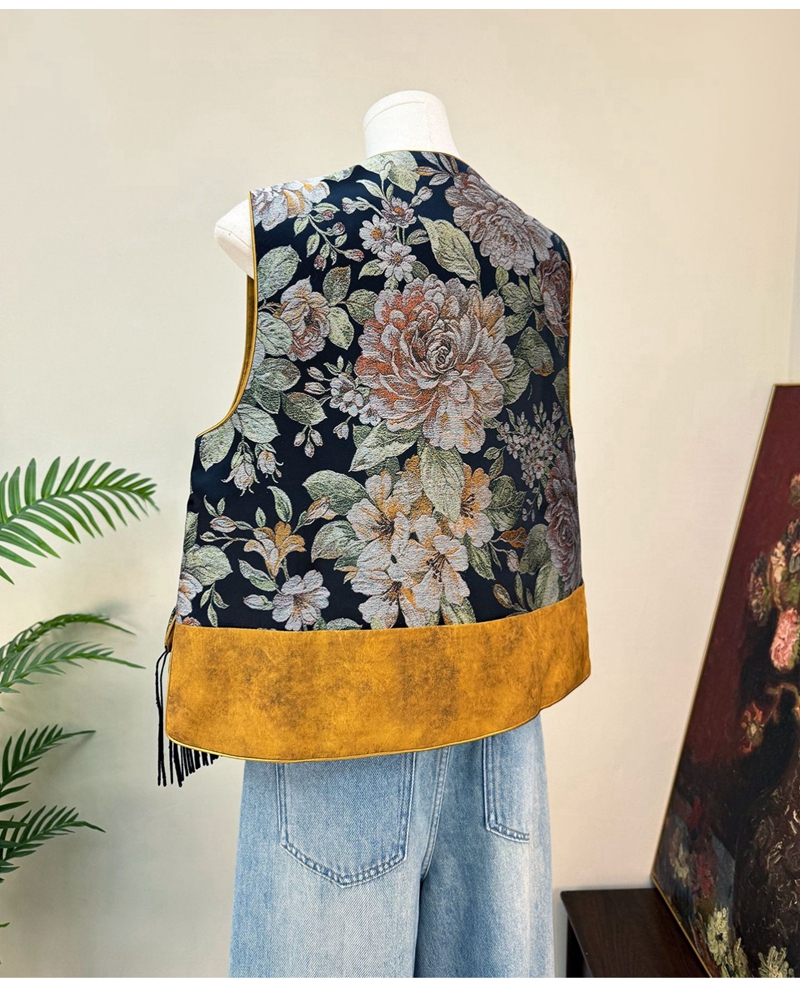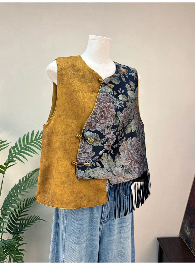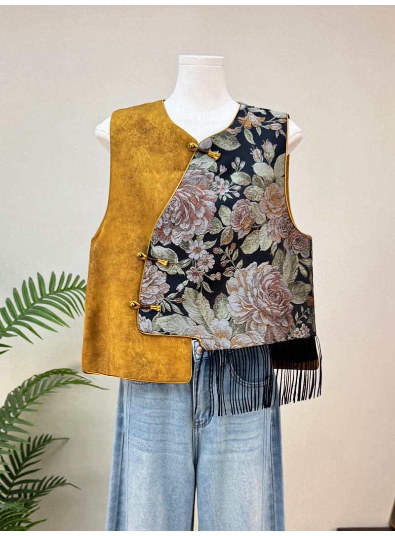 新中式撞色牡丹提花流苏圆领单排扣马甲