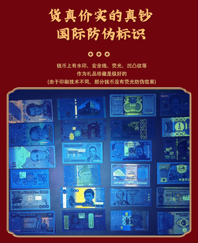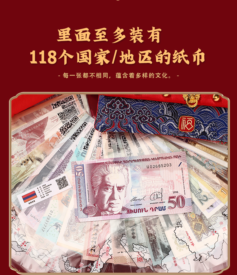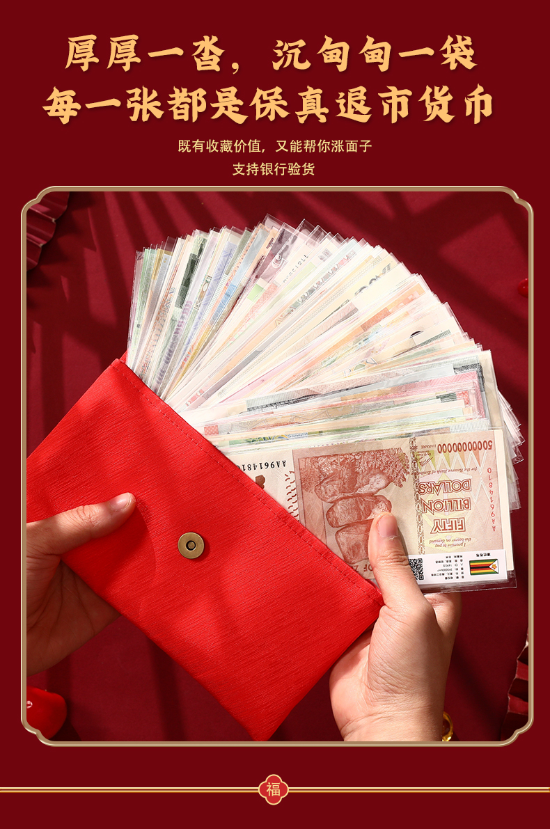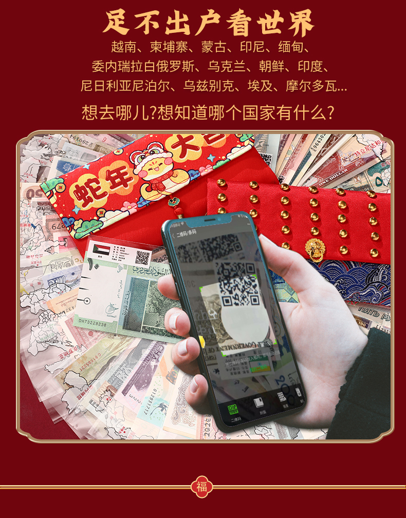 买纸币红包(除100国硬币福桶规格)即赠1张面值纸币+蛇年金箔卡+防伪灯