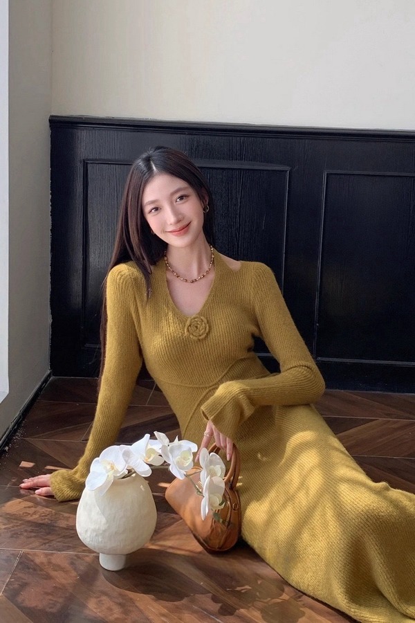 SIA SAYLOR 气质优雅挂脖花朵修身针织连衣裙 21803