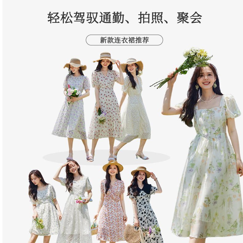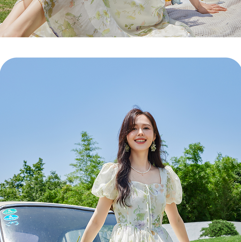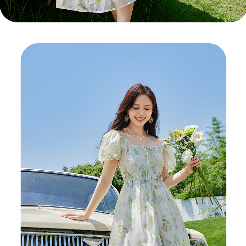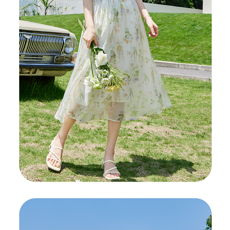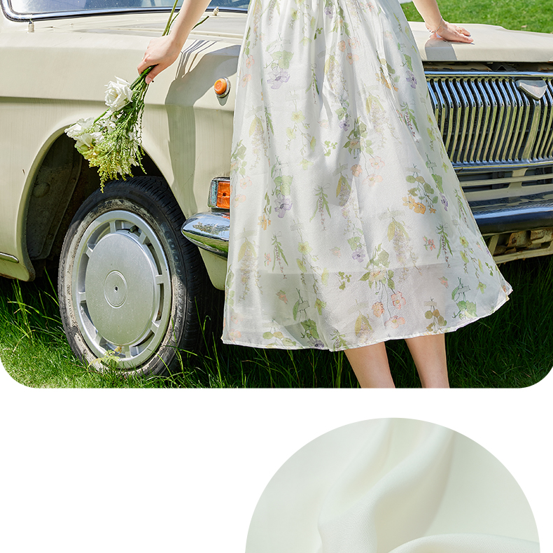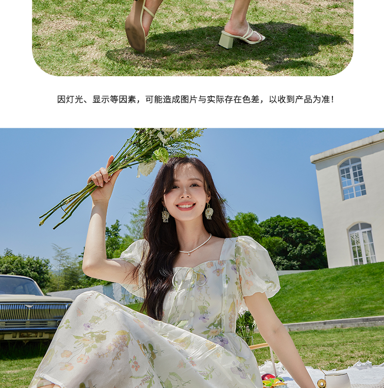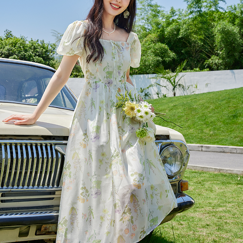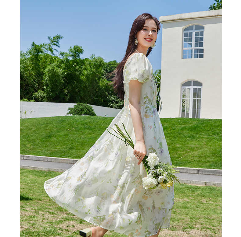 VICTORIA&VERA夏季新款法式复古长款碎花设计感仿缎面连衣裙