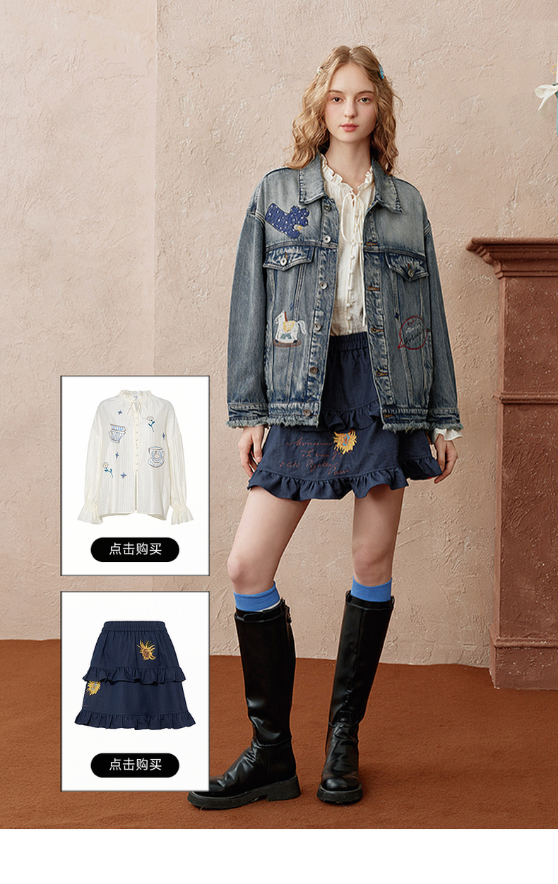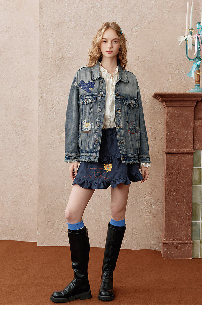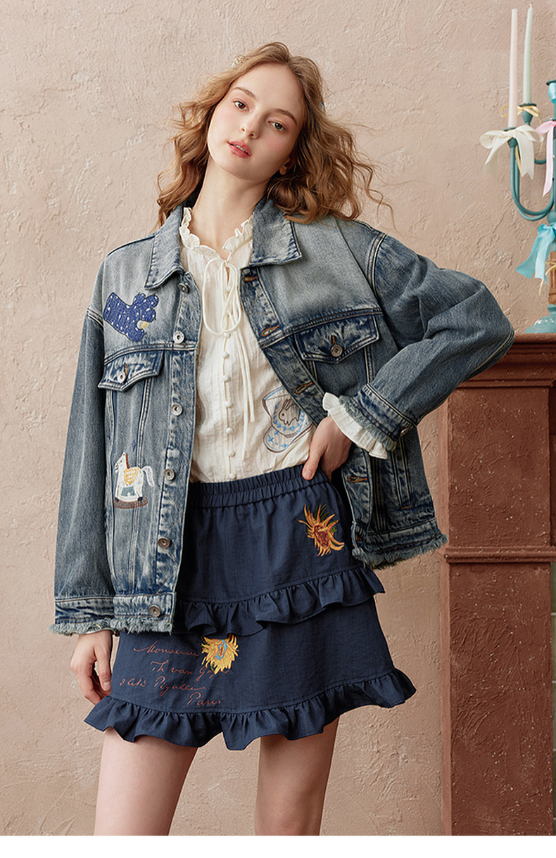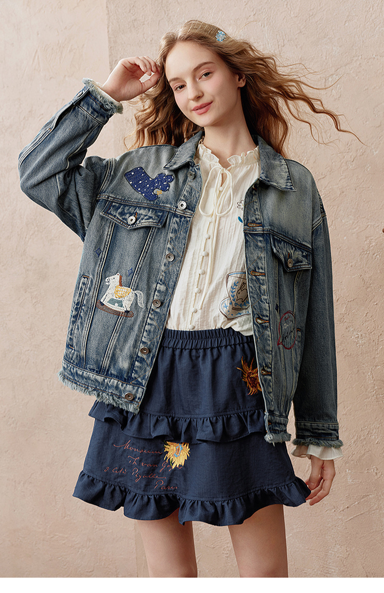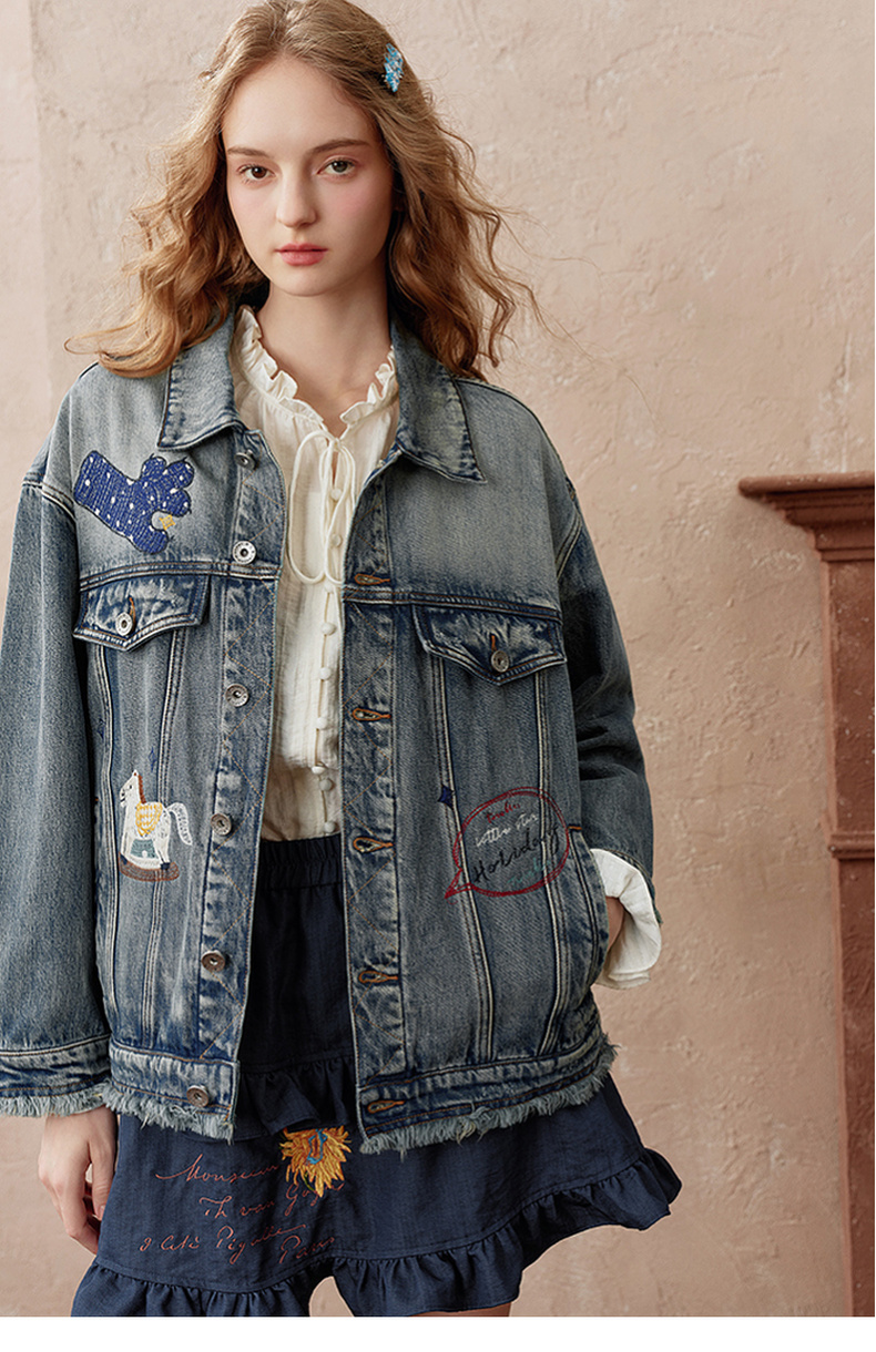 两三事 星芒绮章 2025秋季新款复古水洗毛边刺绣牛仔外套女宽松