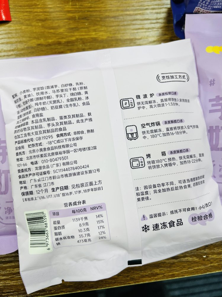 📄配料表也很干净:小麦粉、芋泥馅(荔浦芋、白砂糖、乳粉、稀奶油、黄油)、饮用水、马苏里拉干酪(原制于酪)、奶油干酪(原制干酪)、芋头丁、绵白糖、黄油(动物黄油)、纯牛奶(灭菌乳)、全脂乳粉、冰蛋黄(鲜鸡蛋、白砂糖)、奶豆腐(生牛乳)、食品加工用酵母、食用盐。