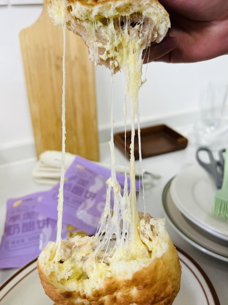 此外,还加入了粉糯香甜的芋泥和芋头丁芋泥来自甄选的正宗荔浦芋头精制而成!包裹进发酵的面团,经过高温烘烤张超级无敌好吃的芋泥奶酪饼就出炉啦!!