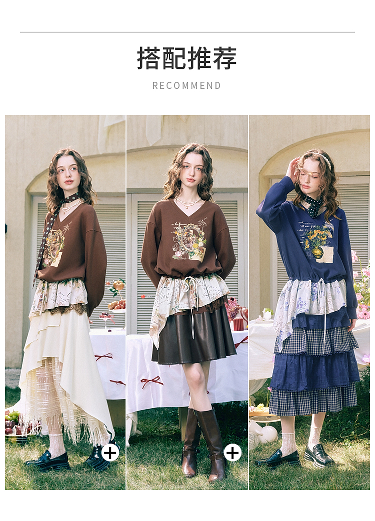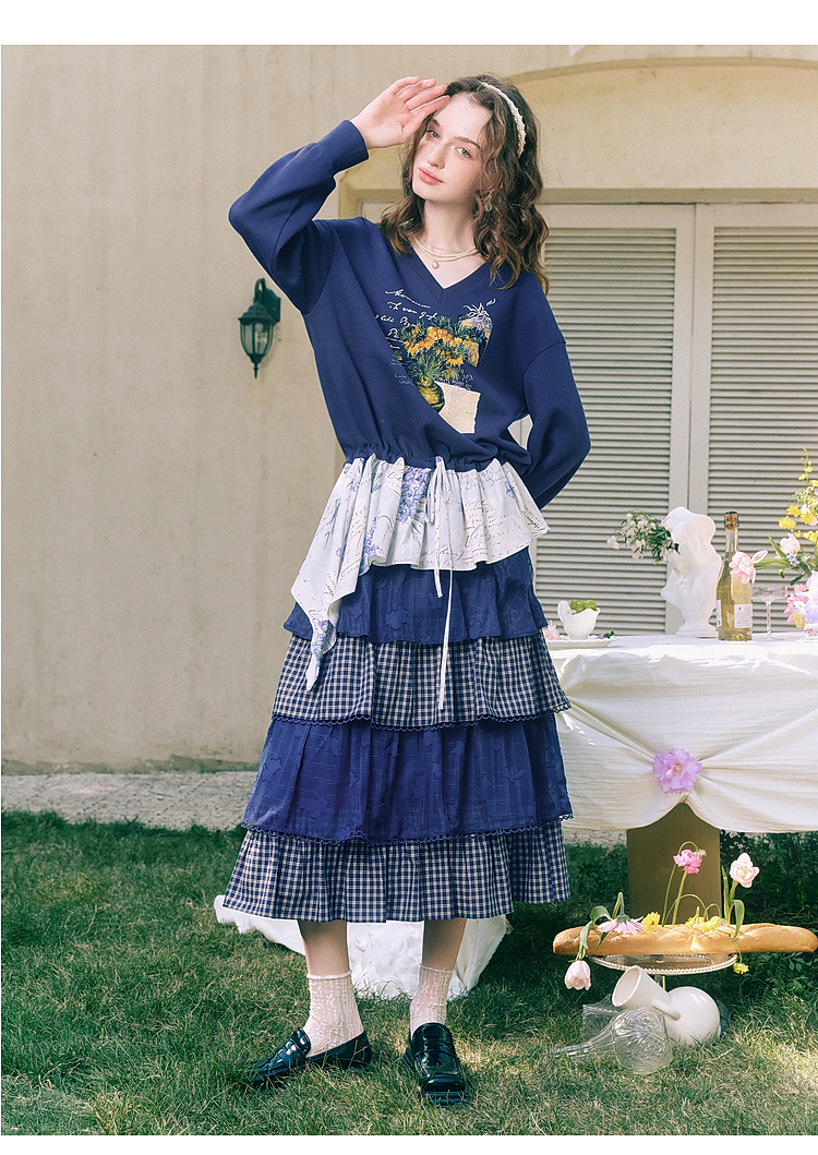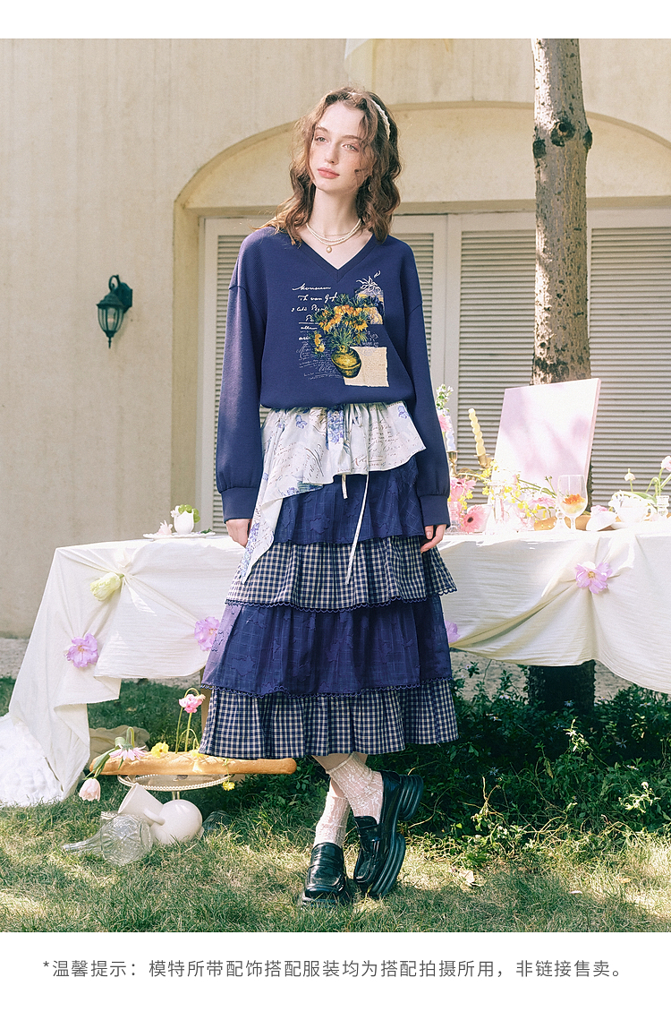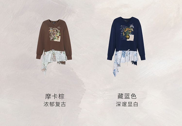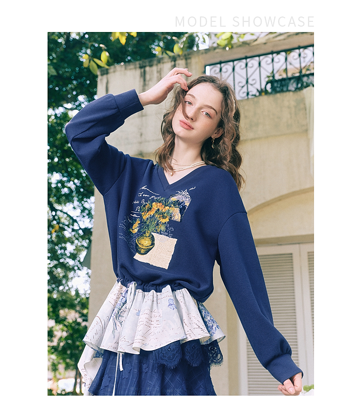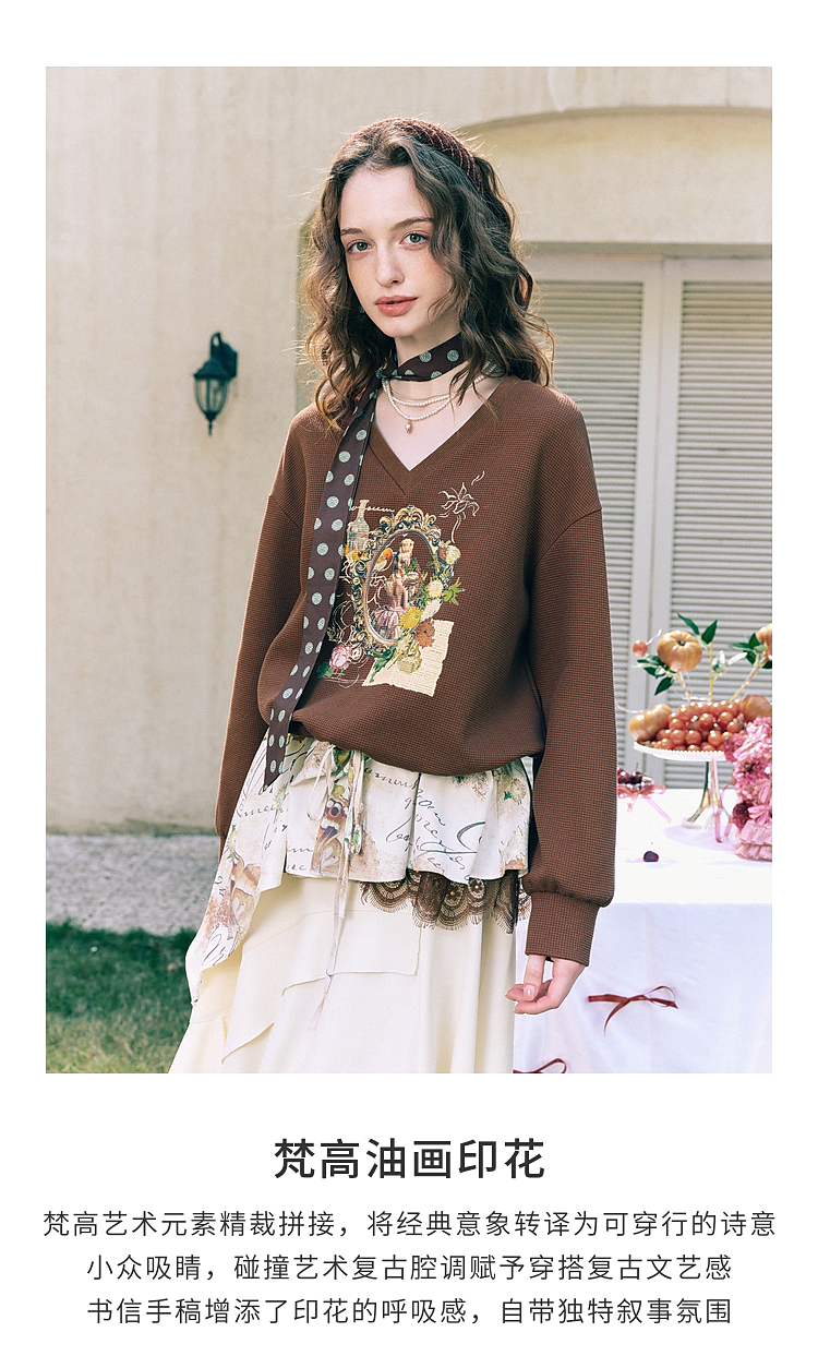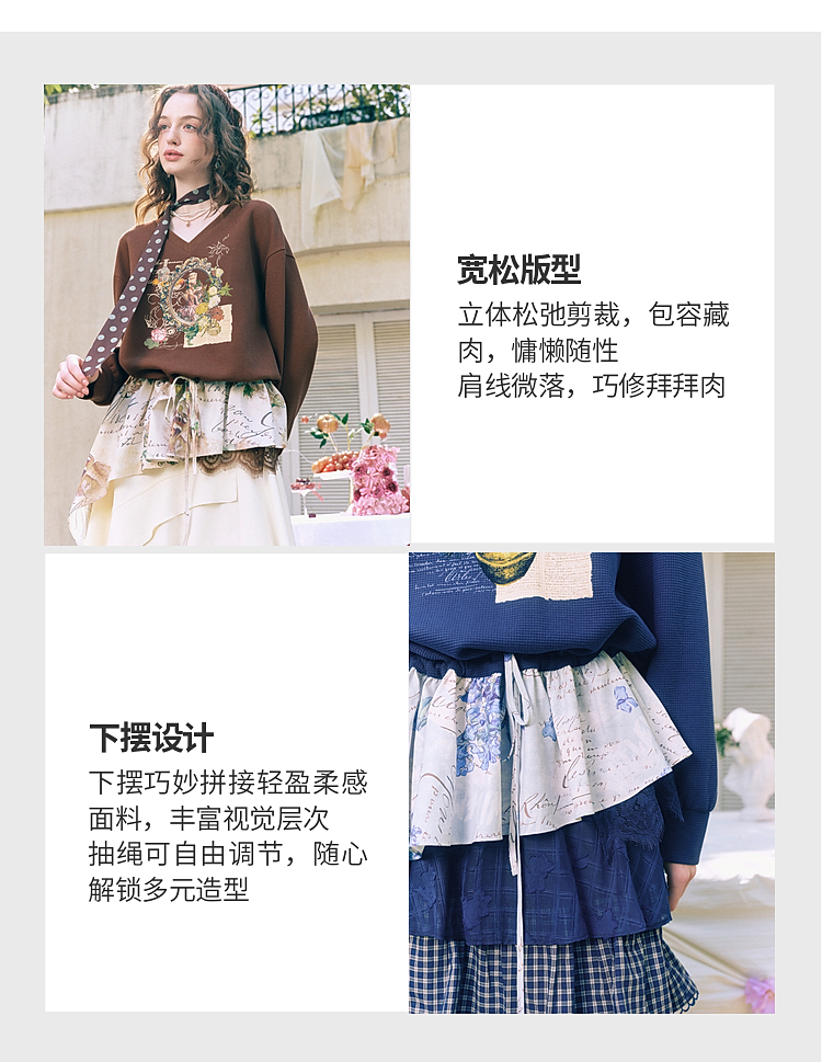 两三事梵高文艺星群旧梦2026春新款荷叶边下摆抽绳收腰印花卫衣女