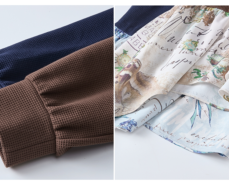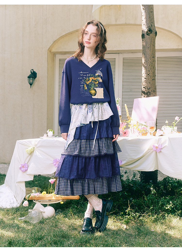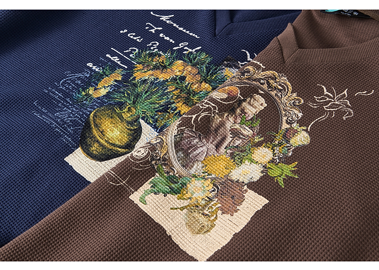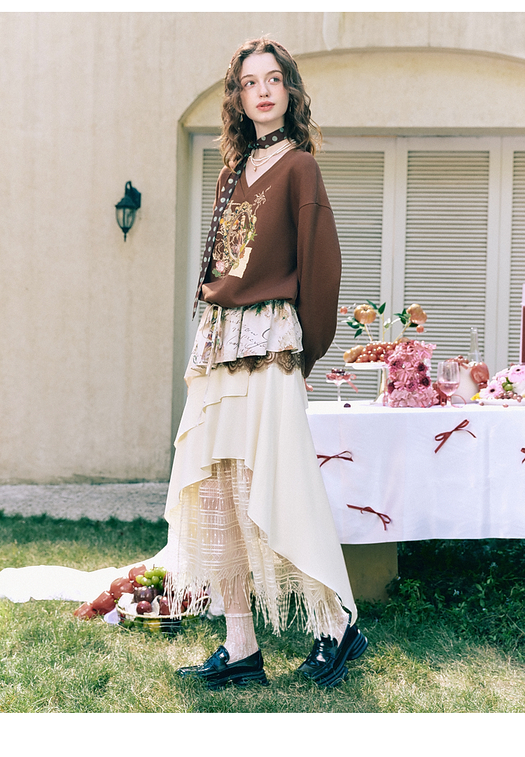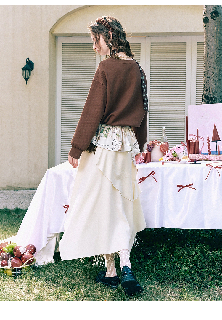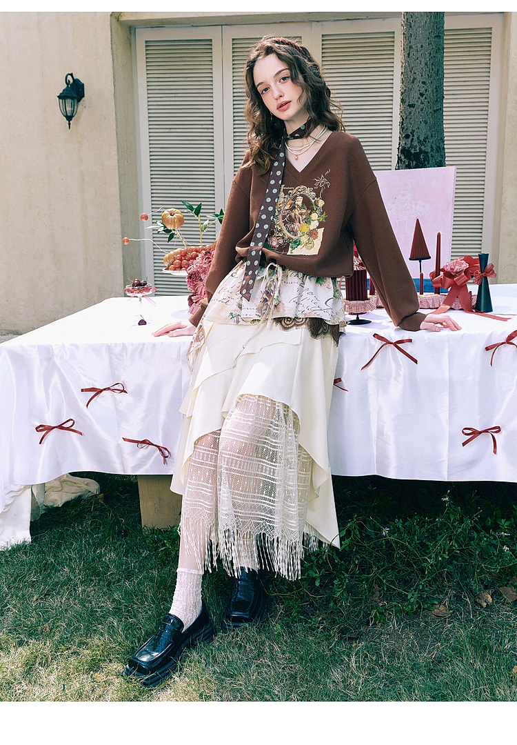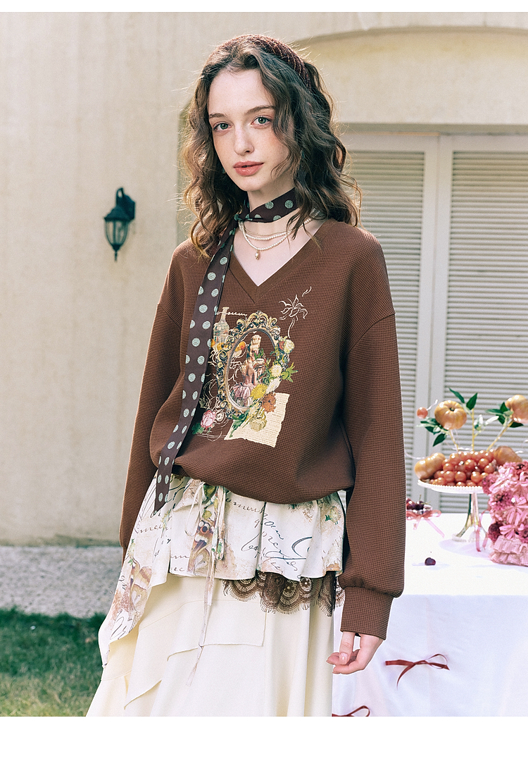 两三事梵高文艺星群旧梦2026春新款荷叶边下摆抽绳收腰印花卫衣女