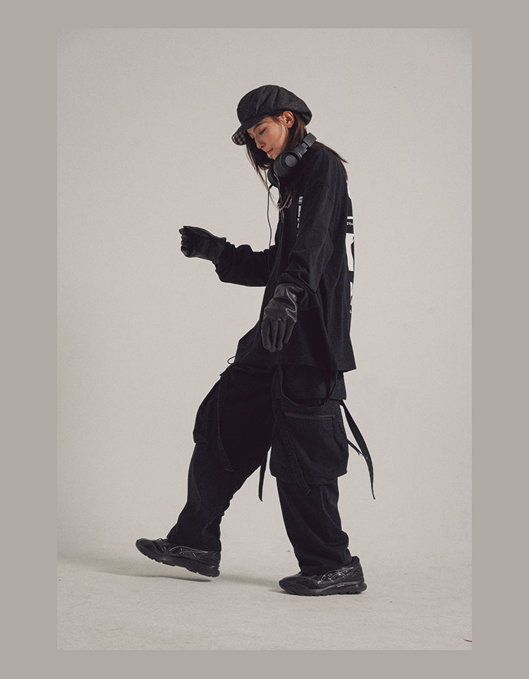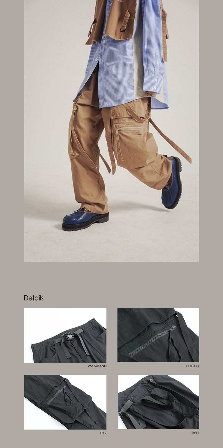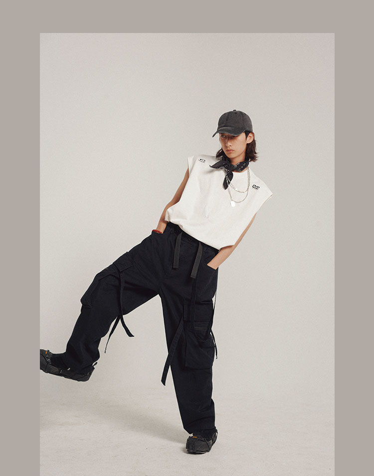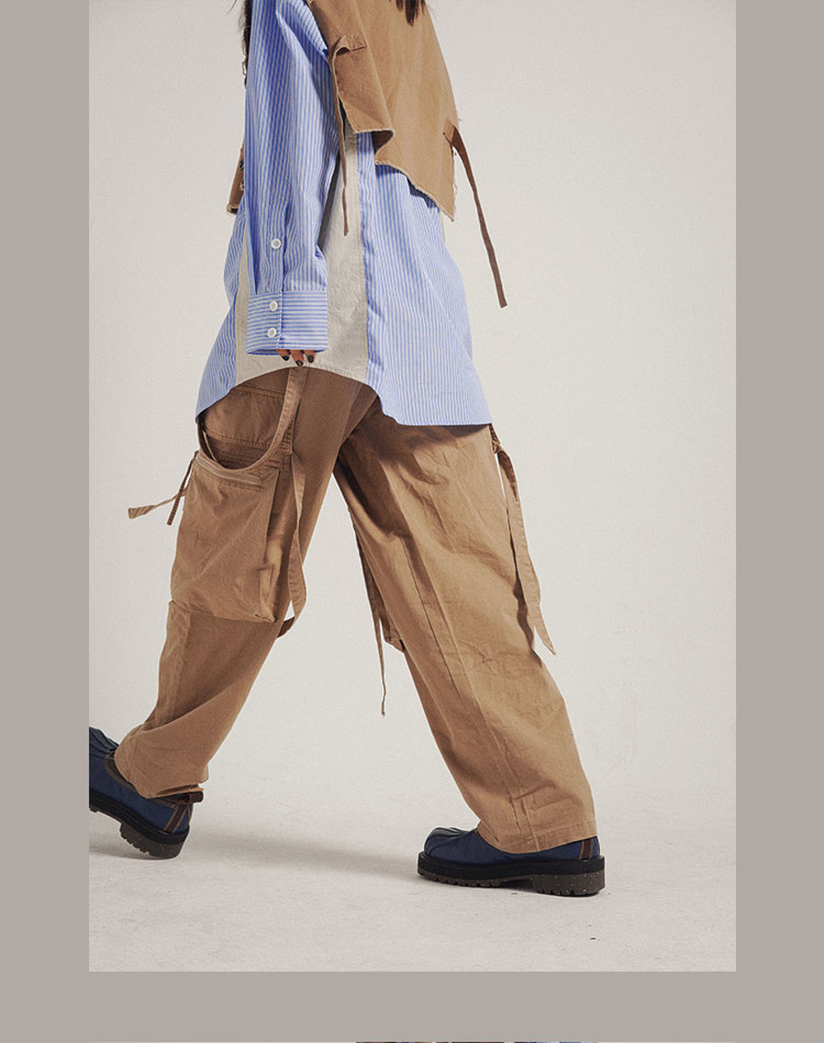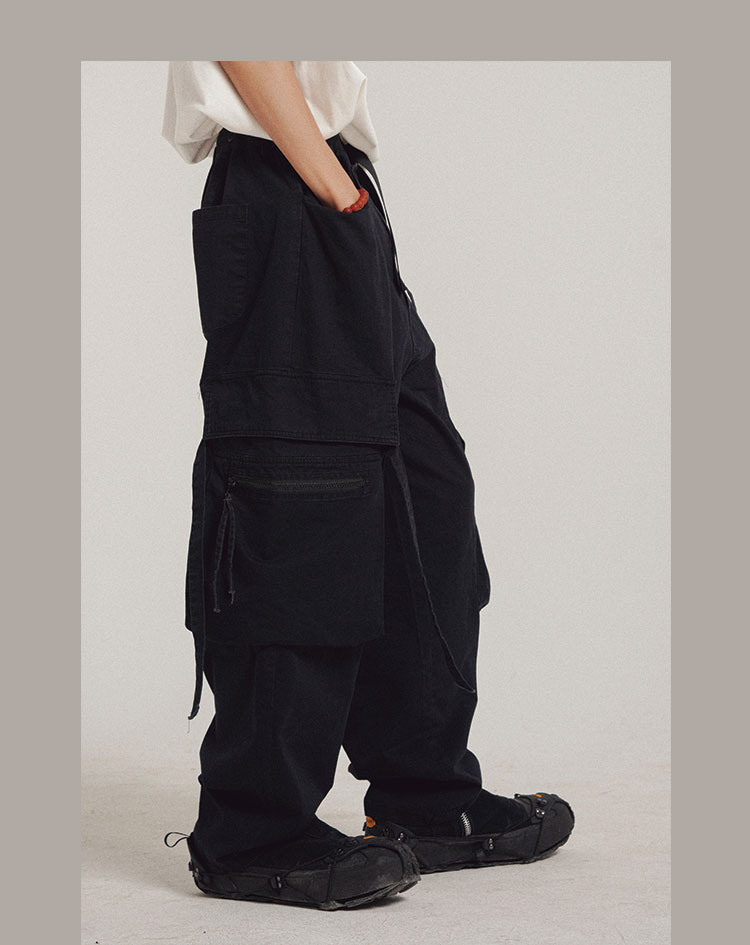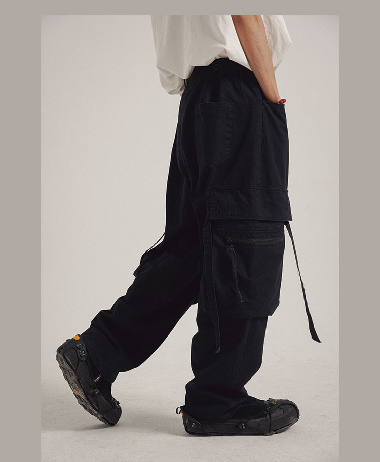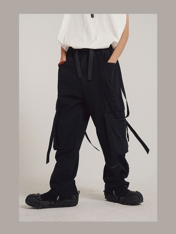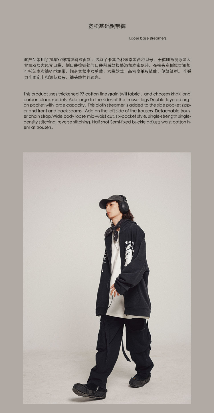 POH 可拆卸裤链飘带宽松多口袋直筒休闲长裤结构飘带工装裤子男装