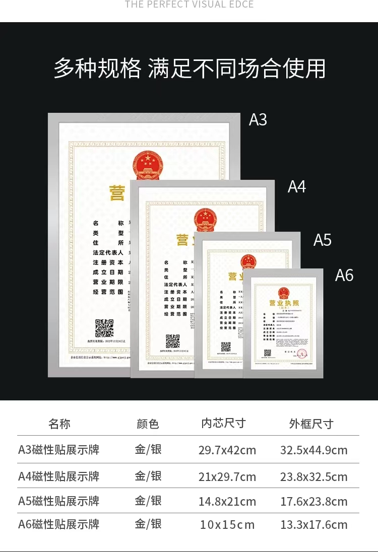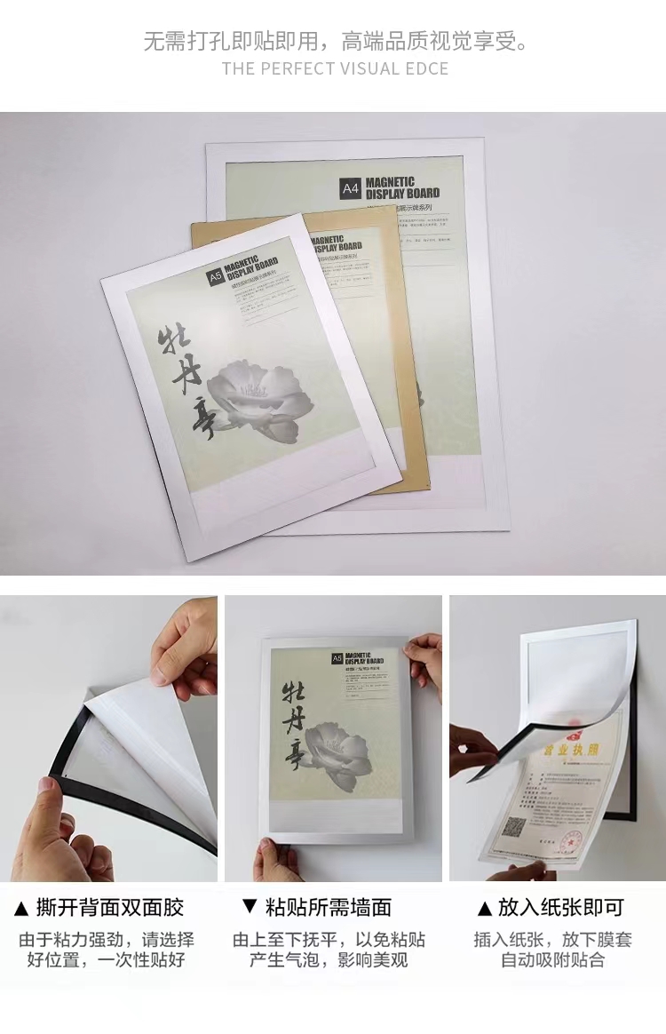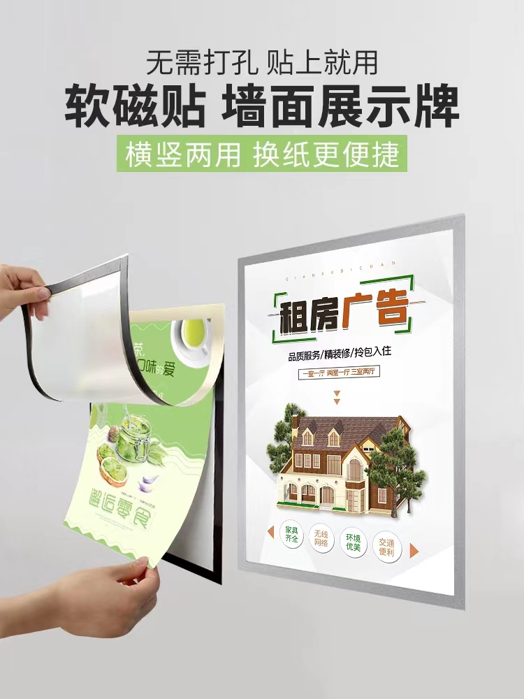 A4磁性即时贴展示牌A3营业执照框A6免打孔磁吸相框A5磁力文件贴中介贴橱窗软胶广告贴银色1个