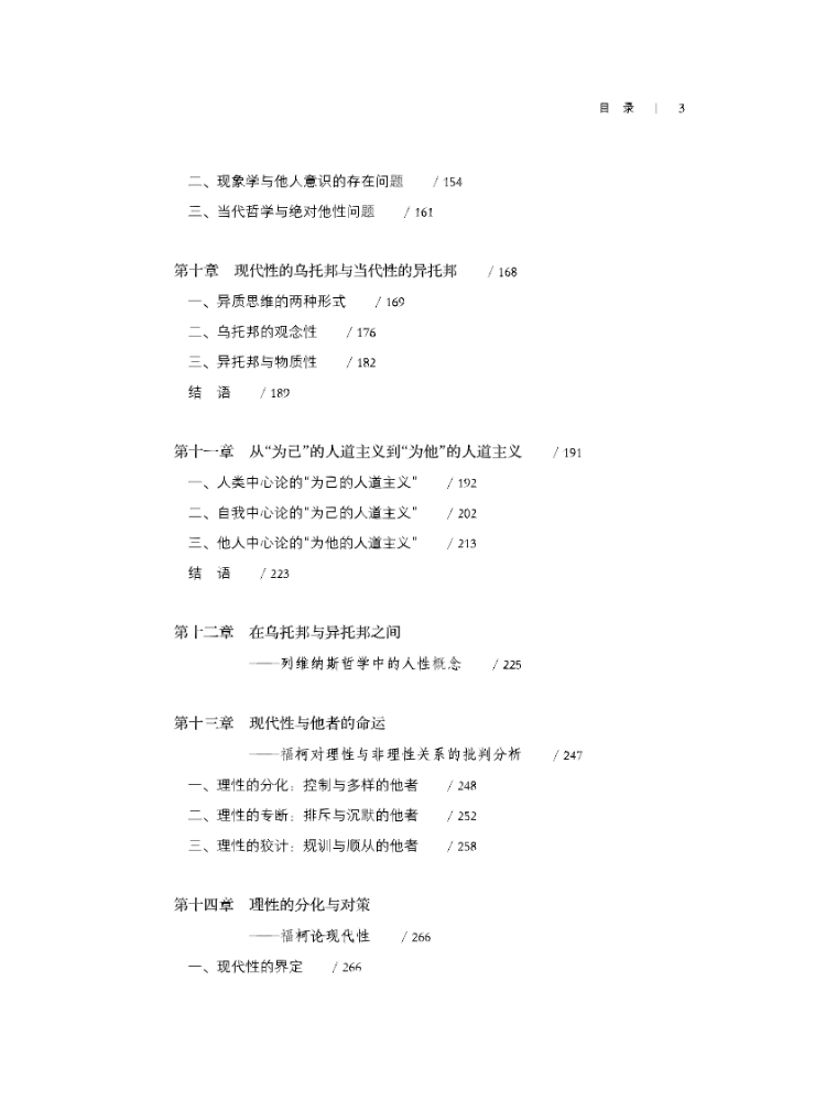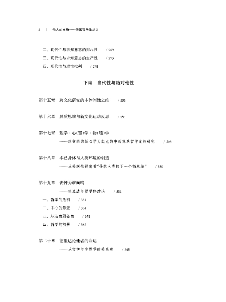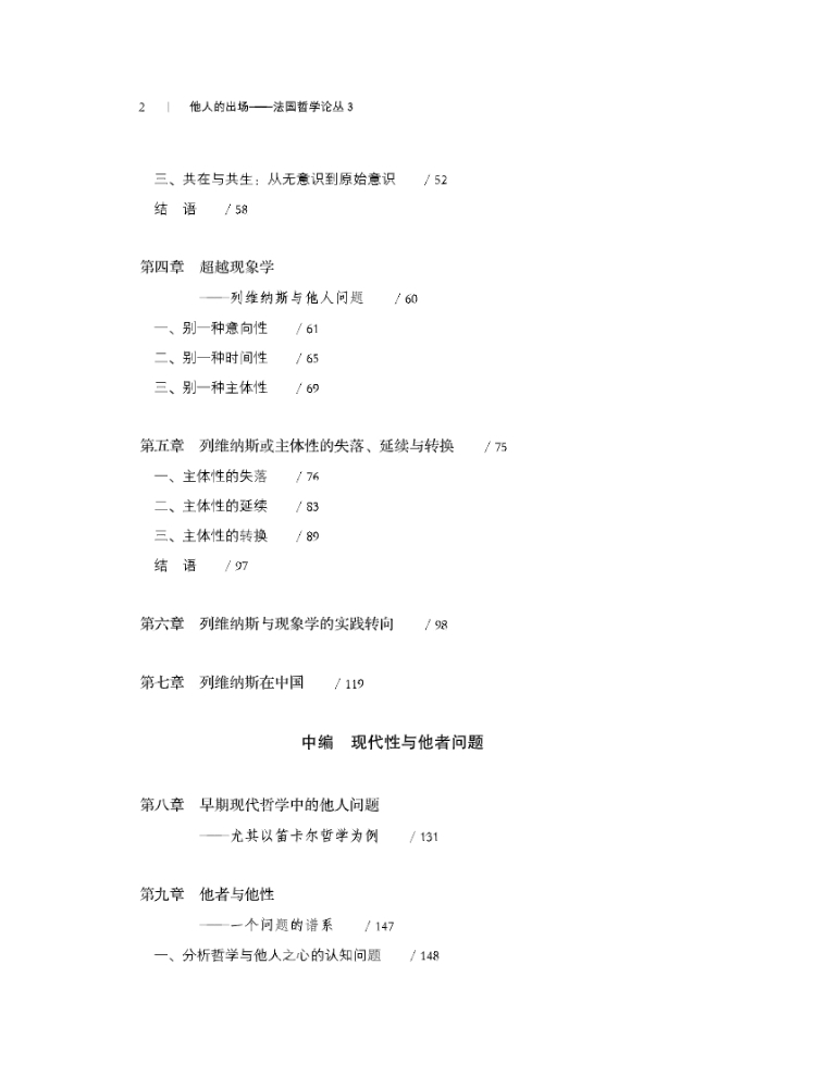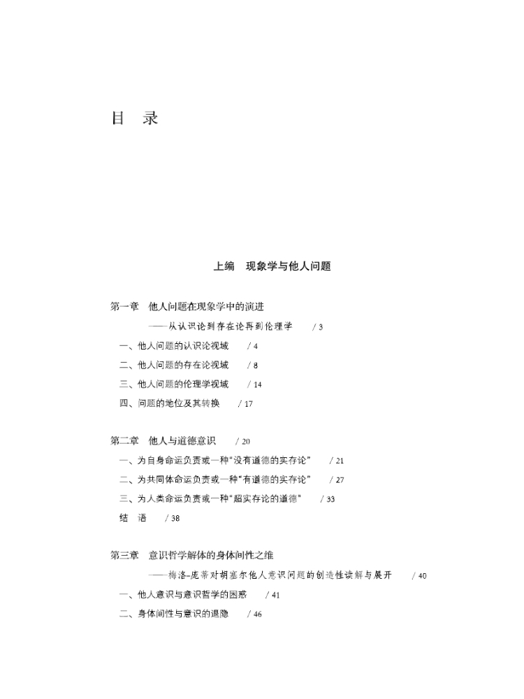 本书主要围绕法国哲学关于他人问题的相关探讨展开,同时涉及早期现代哲学和20世纪英美哲学的相关思想。全书分为“现象学与他人问题”“现代性与他者问题”“当代性与绝对他性”三个部分,从结构-后结构主义和现象学-实存主义回溯他人在现代性及其转折进程中的命运,表明了他人从不在场到逐步出场到绝对在场的变化。这一探讨涉及同一与他者、自我与他人的复杂关系,从多个角度展示了主体形而上学解体的他人-他者之维。梅洛-庞蒂关于共在、列维纳斯关于绝对他性、德里达关于非哲学文化或非西方文化乃至西方文化内部边缘文化的分析和论述,福柯关于他者在现代性进程的命运的思考都是关注的对象。