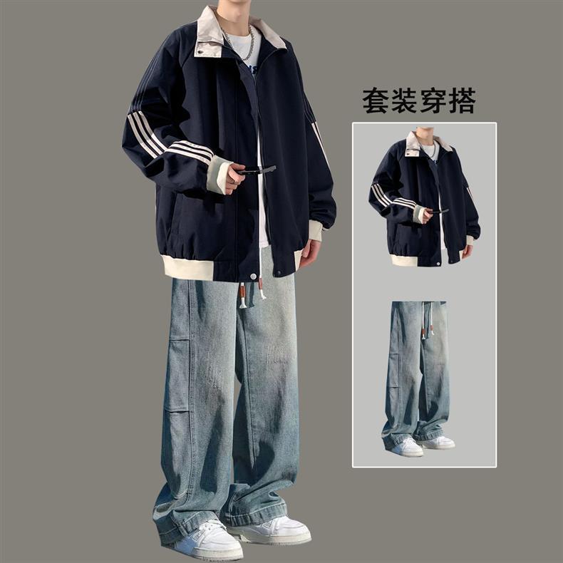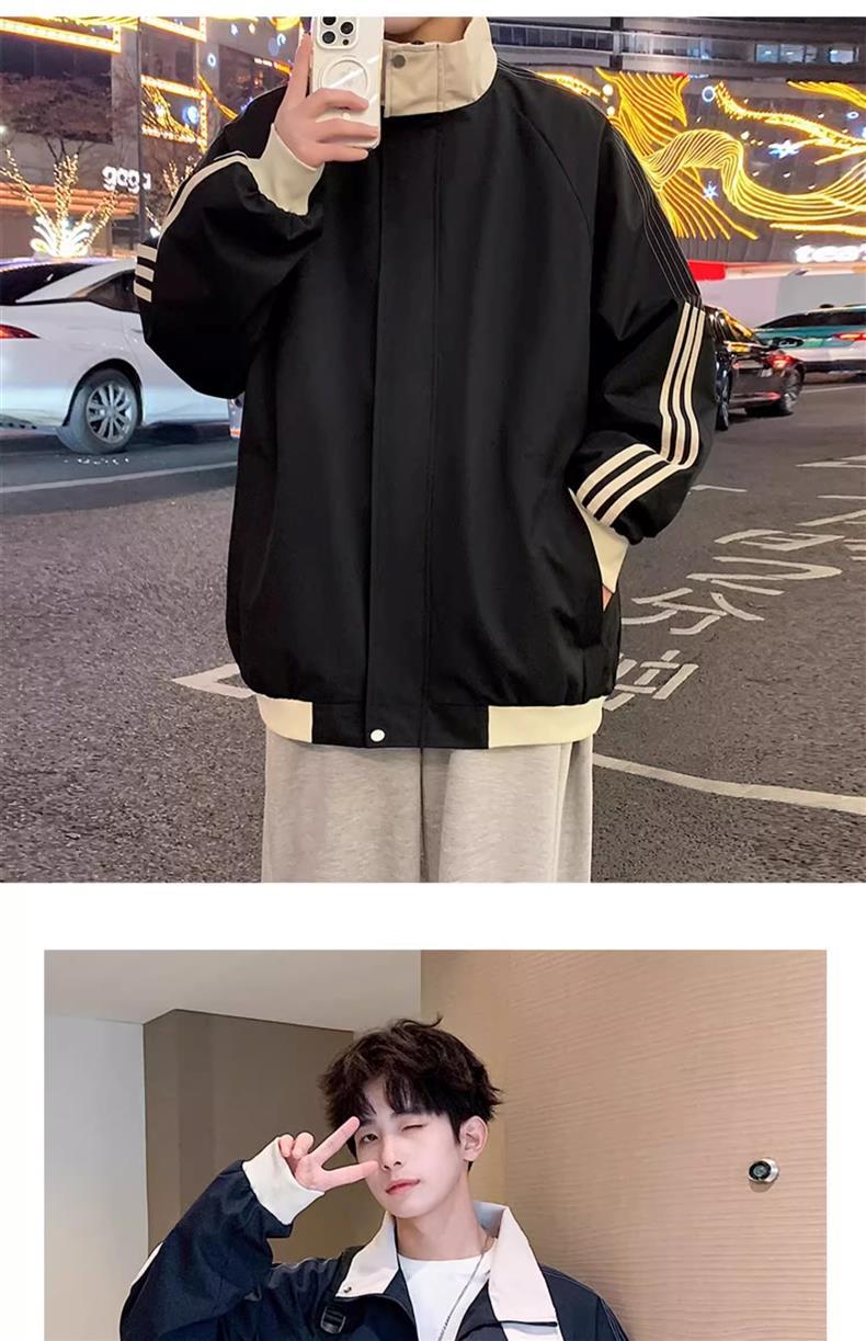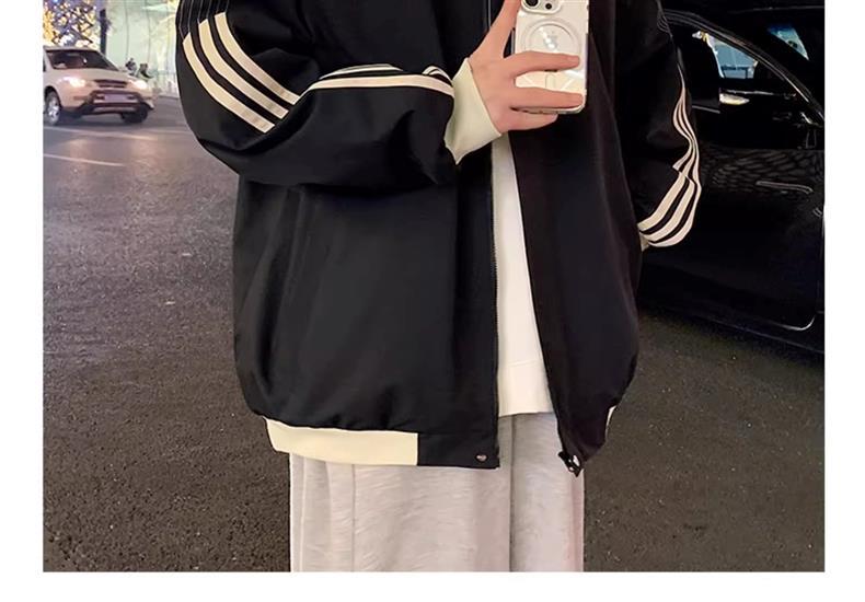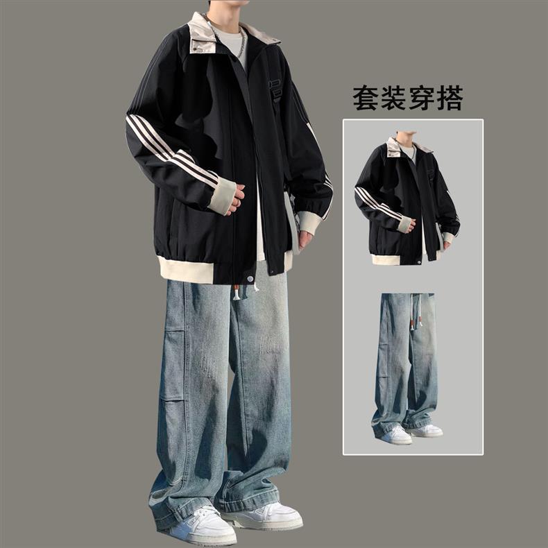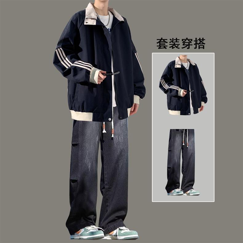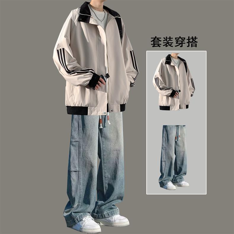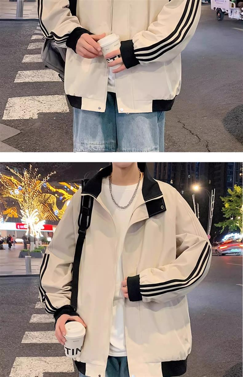 美式秋季立领外套男款潮牌休闲运动条纹夹克男生防风冲锋衣一整套
